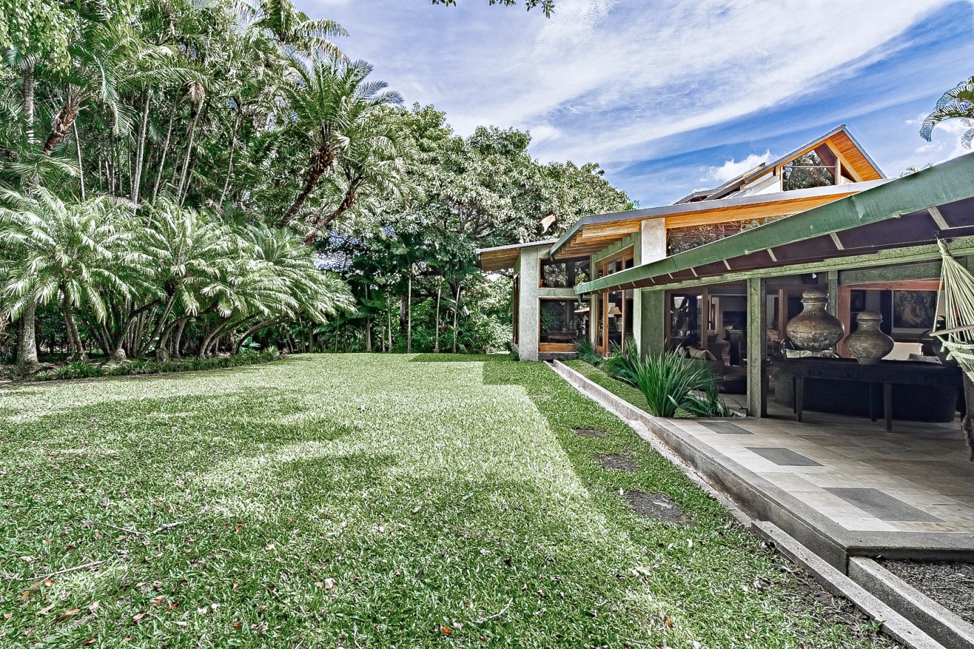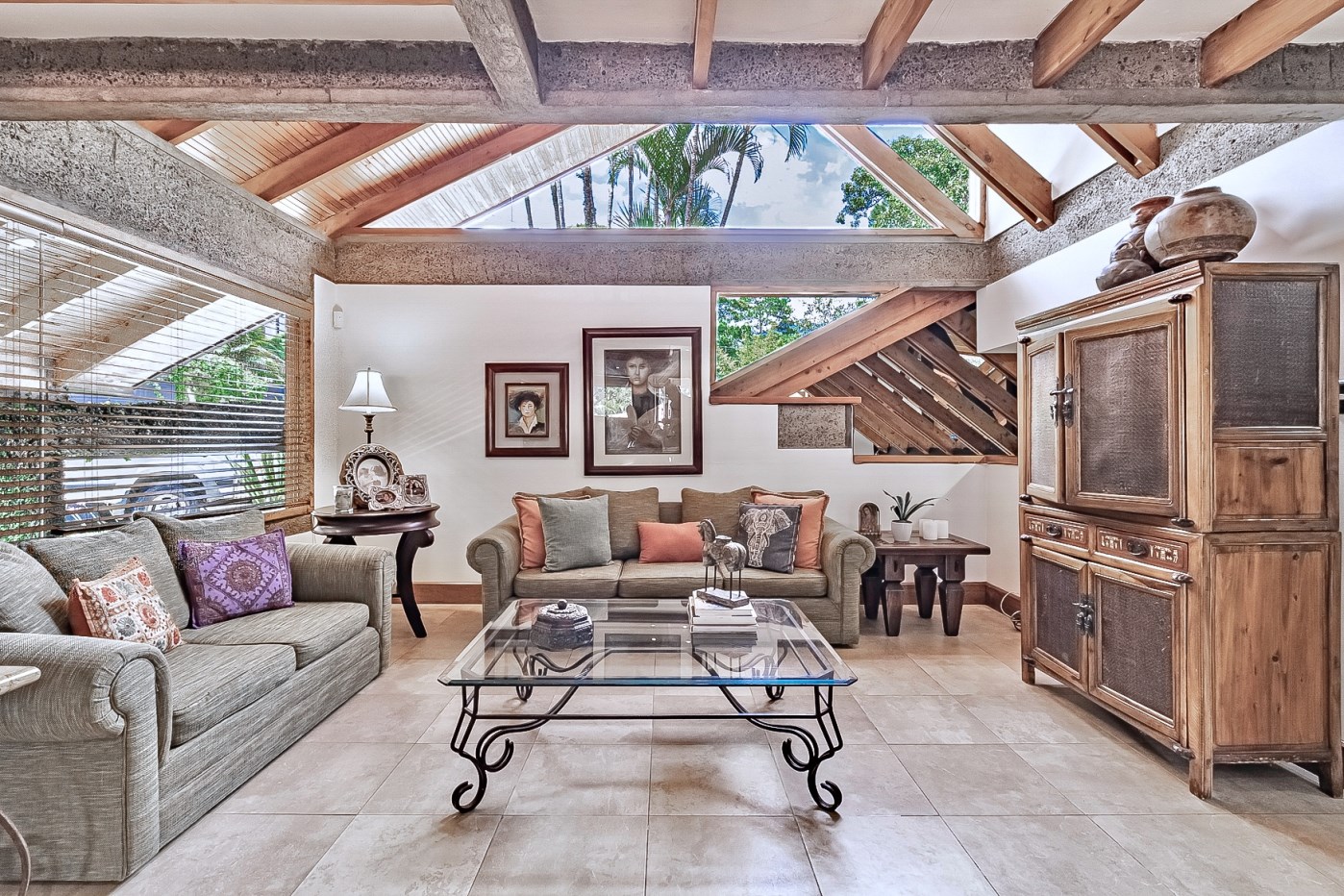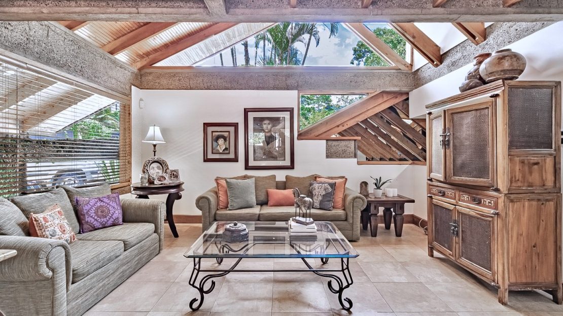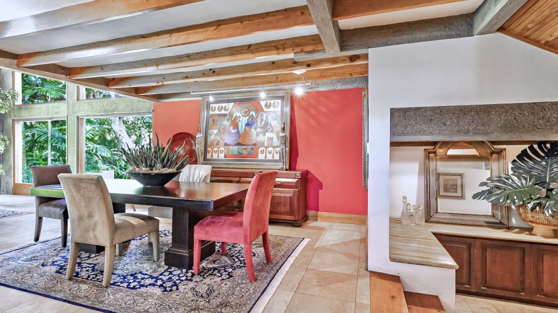 The moment you enter the home, you get this rushing feeling that you just transported to a tropical oasis. All the natural elements of both rugged concrete molding & beams, wood & metal beams that are integrated with wood plank ceilings to the tropical gardens mixed with a variety of palms that you see through the tall glass doors, brings an ambience of residing on a tropical island.