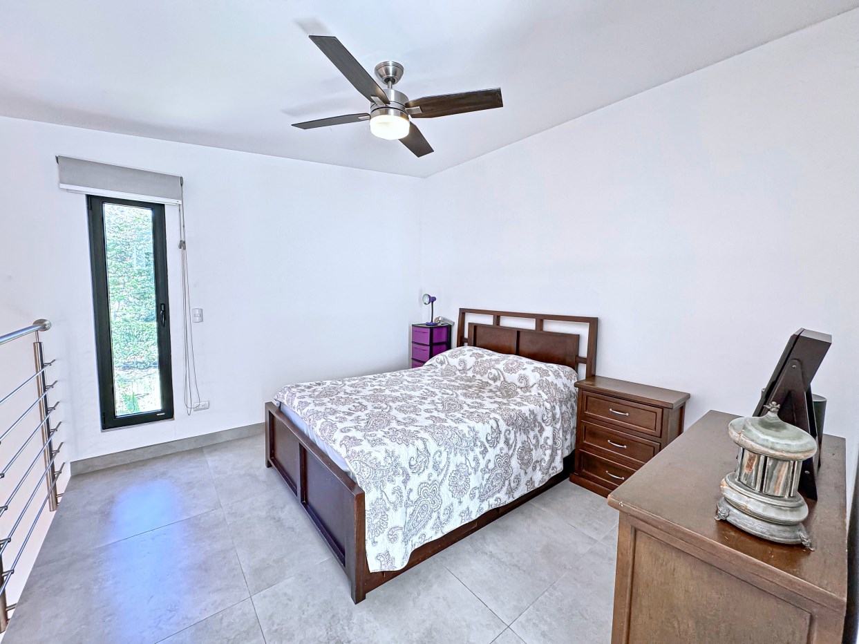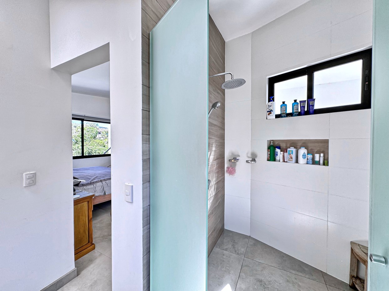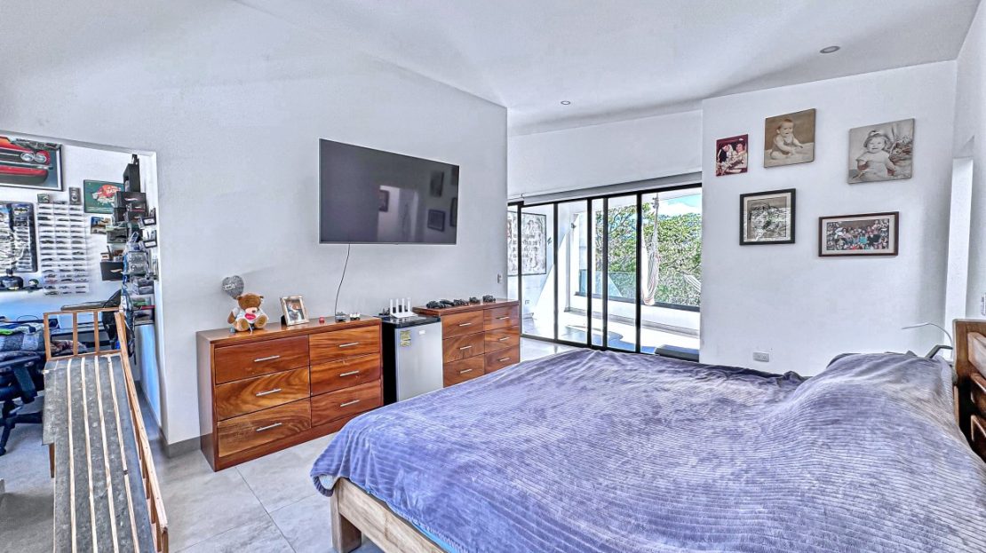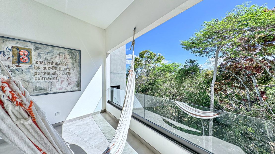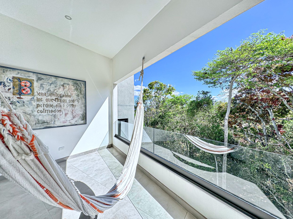 The master bedroom boasts coffered ceilings, a large balcony, an en-suite bathroom with a walk-in bathroom, and a walk-in closet. The master bathroom features contemporary finishes. Glass sliding doors open to a covered balcony. The balcony is very spacious for lounging to enjoying nature. Sit back in the Hammock and enjoy!