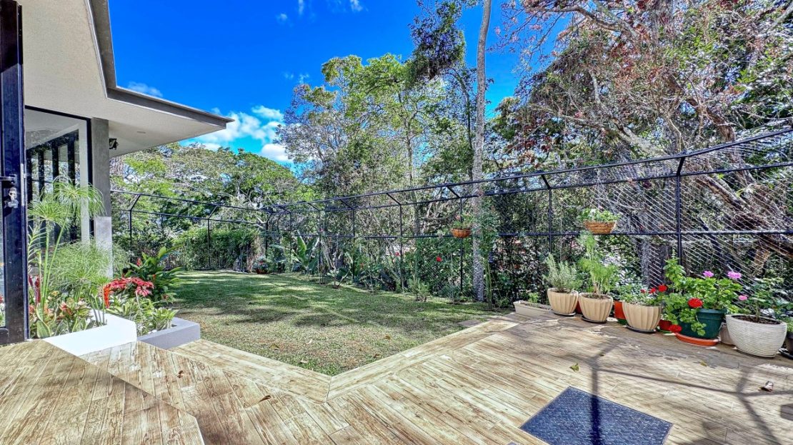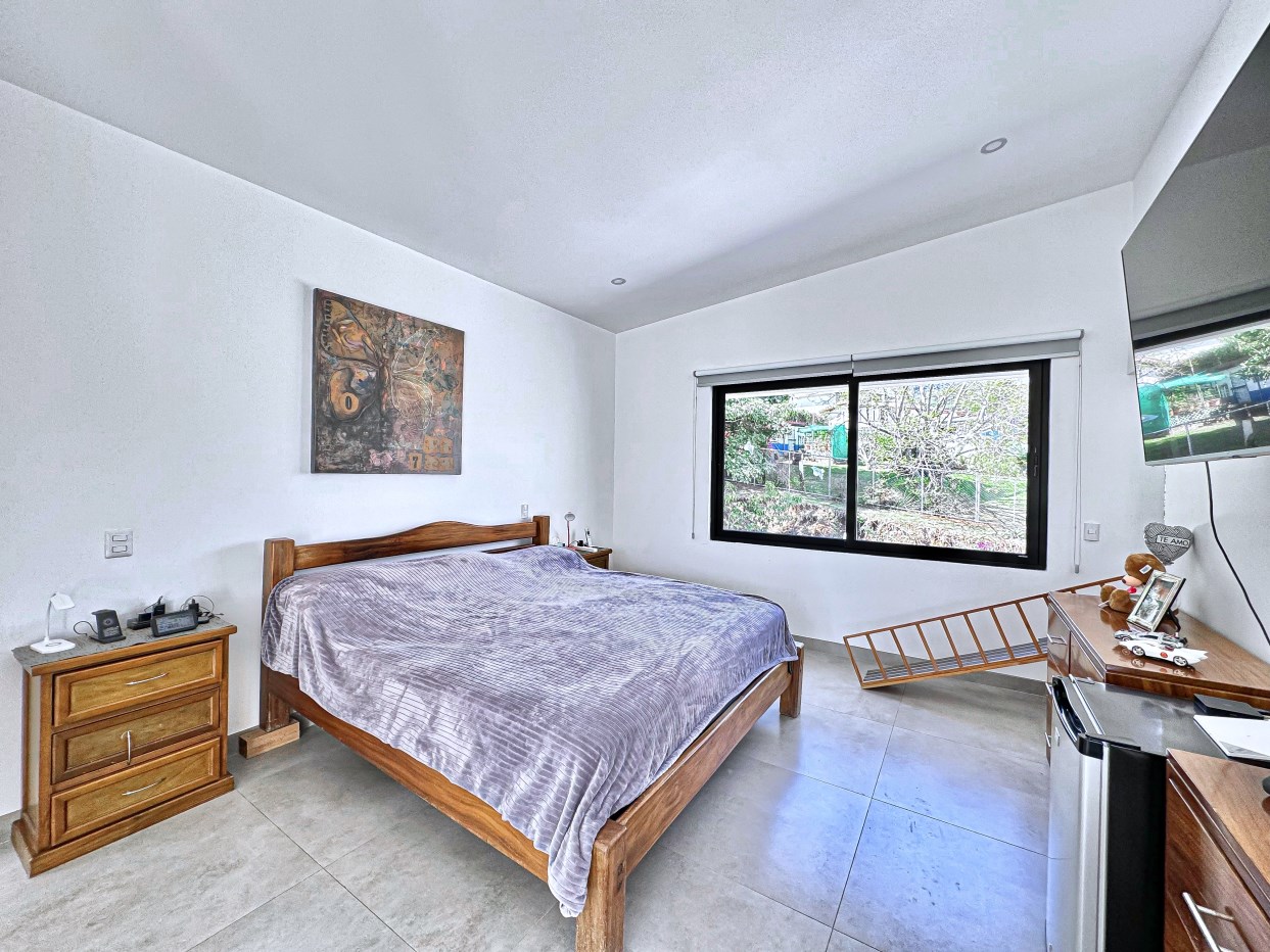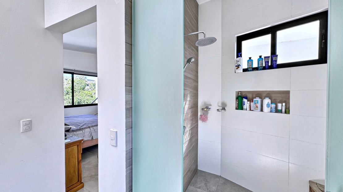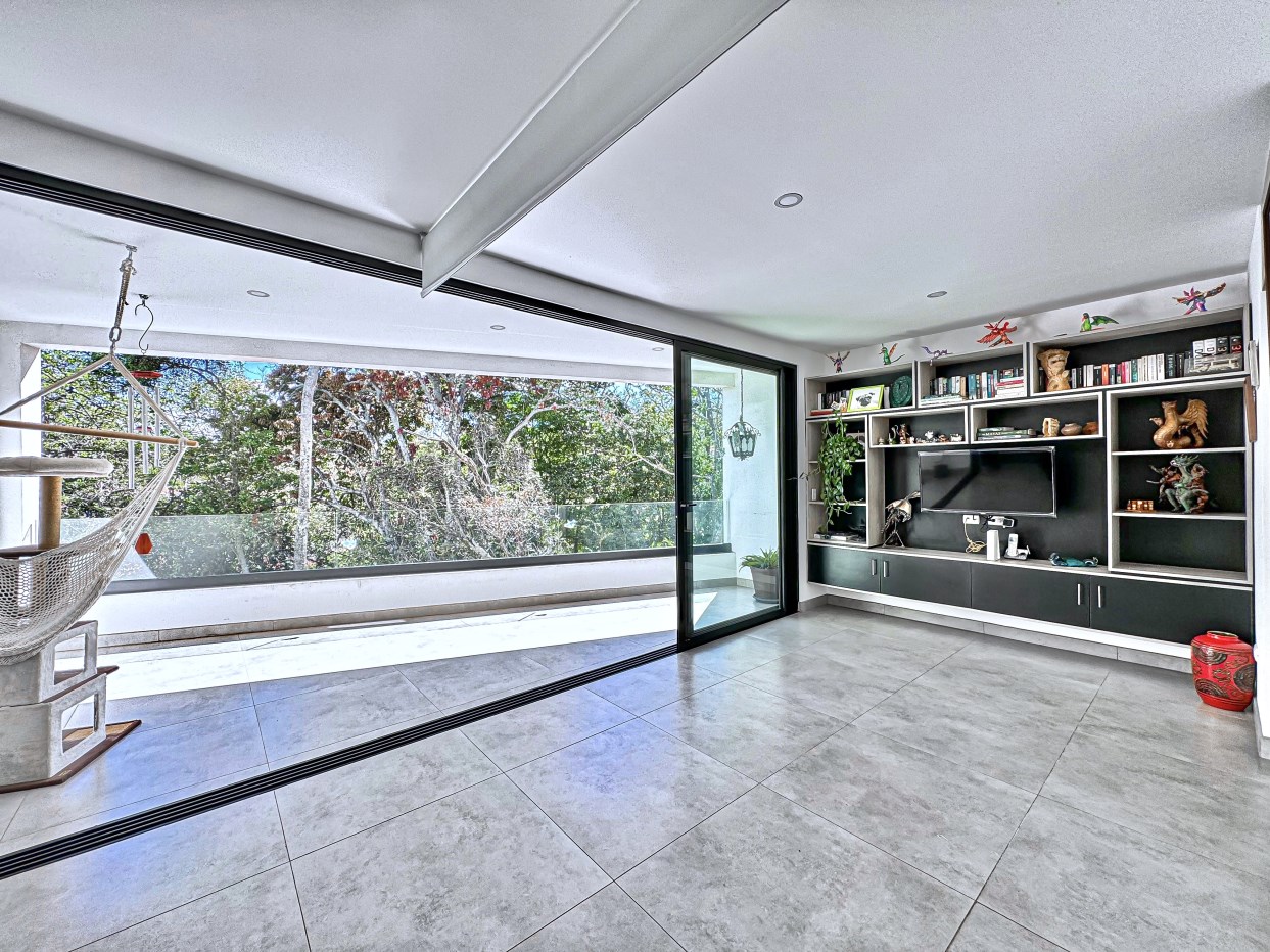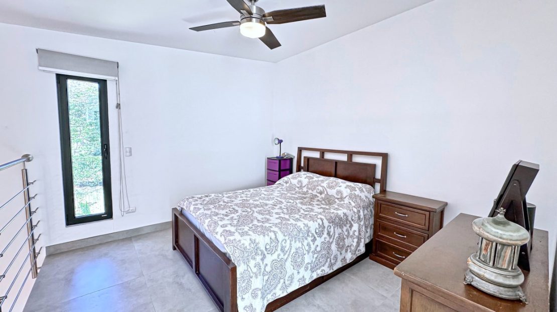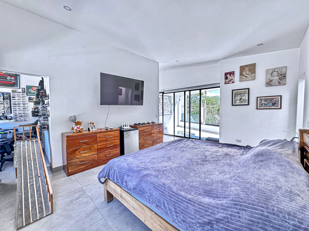The master bedroom boasts coffered ceilings, a large balcony, an en-suite bathroom with a walk-in bathroom, and a walk-in closet. The master bathroom features contemporary finishes. Glass sliding doors open to a covered balcony. The balcony is very spacious for lounging to enjoying nature. Sit back in the Hammock and enjoy!