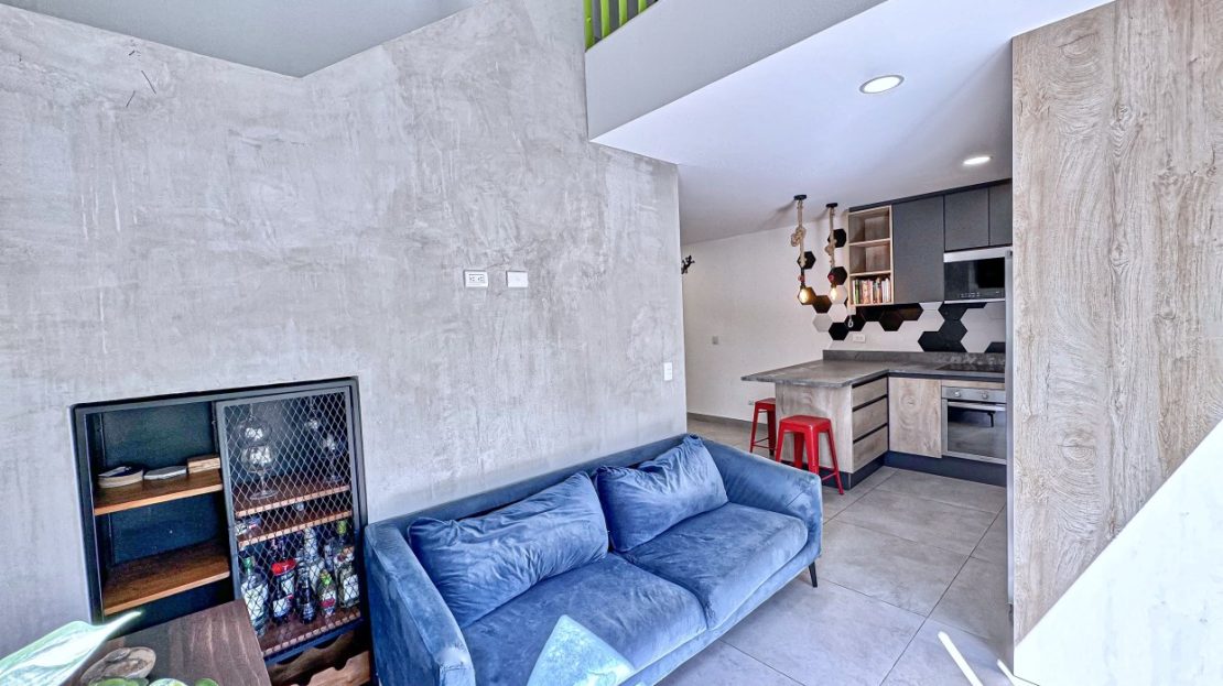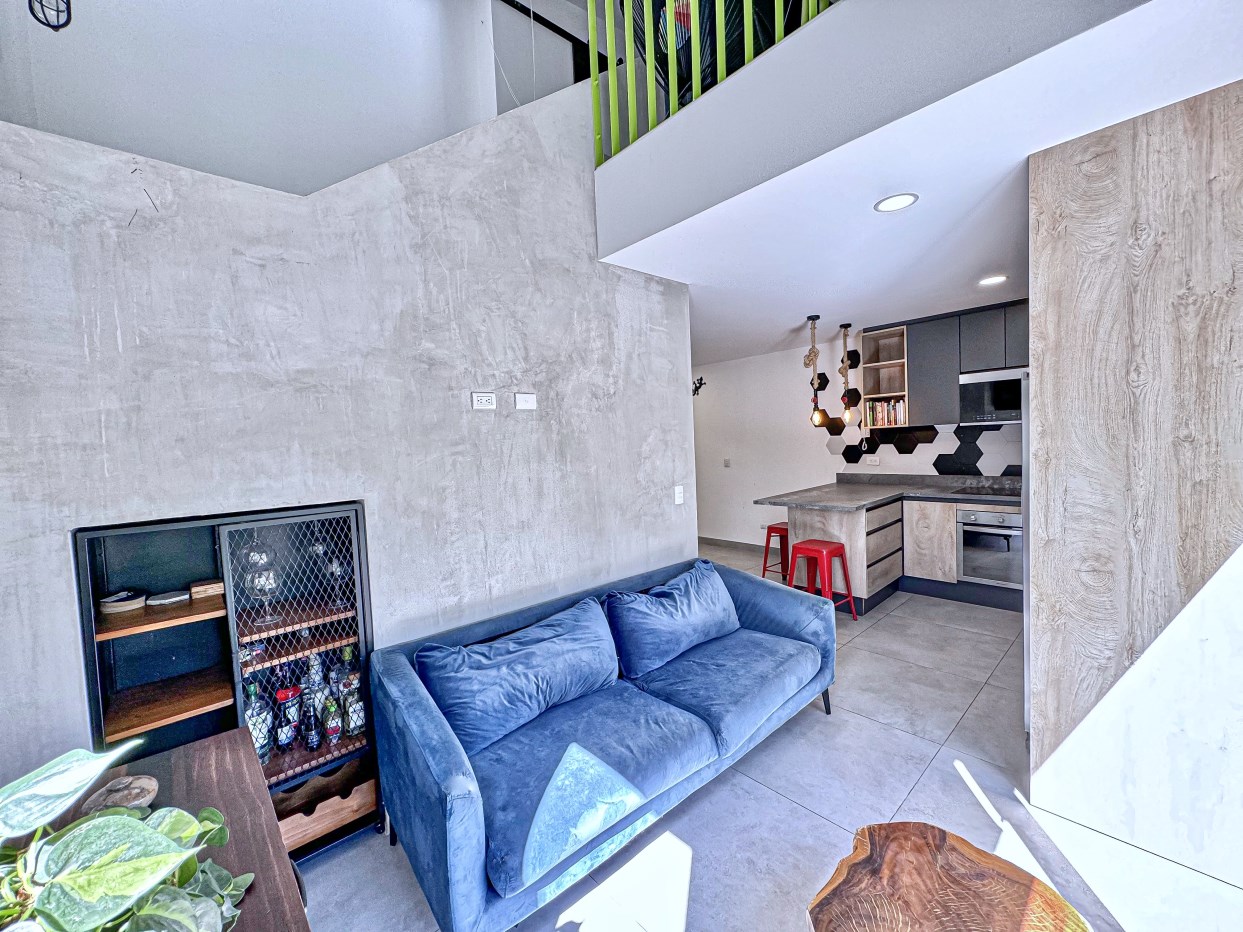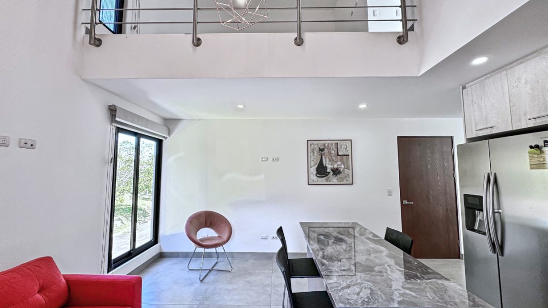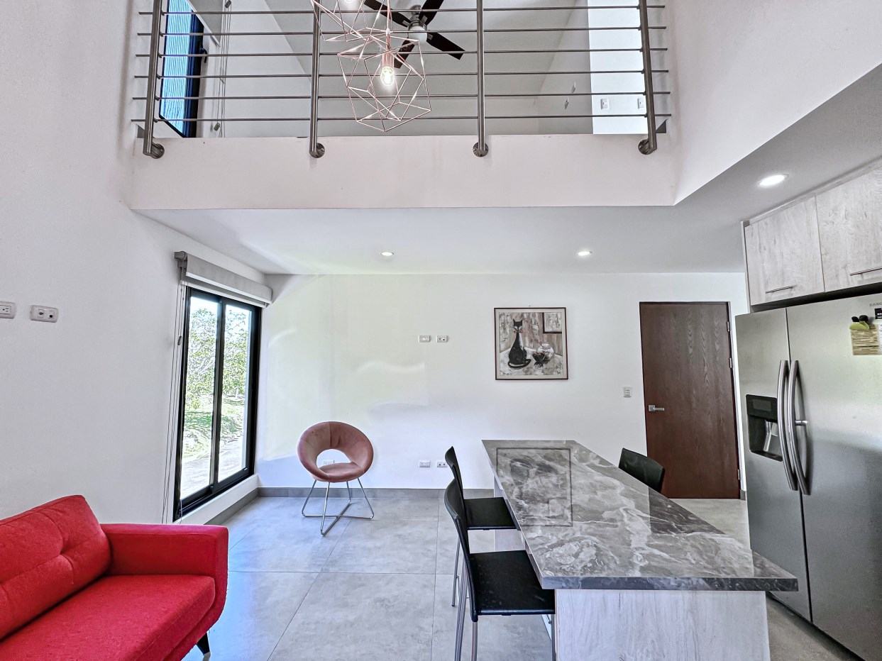 Open kitchen concept with TV lounge room and balcony. The balcony boasts views of the mountains and mature trees. A laundry room is adjacent to the kitchen. An upper-level loft boasts a bedroom and full bathroom.