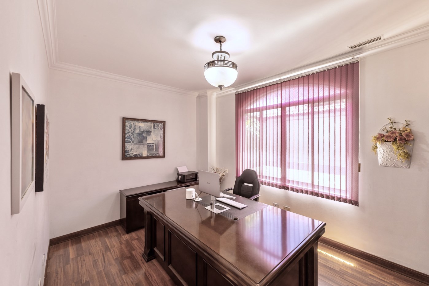 The master bedroom is spacious, featuring an en-suite bathroom characterized by a double sink vanity and a large walk-in closet. Views of the valley and mountains can be seen from the master bedroom. This entire second level boasts wood laminate flooring.