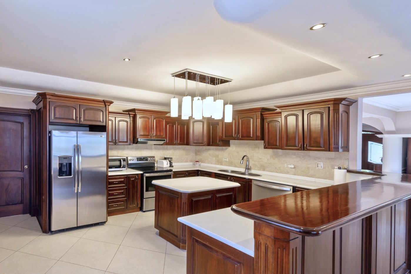 FIRST FLOOR INTERIOR FEATURES:Spacious Living and Dining area with an open floor distribution design for the kitchen. Spacious contemporary-classic kitchen with solid wood cabinetry. The kitchen boasts ample cabinet storage and stainless steel appliances. Recent upgrades are an electric stove, oven, dishwasher, garbage disposal and decorative lighting. Dining and living area with glass sliding doors opening to a large covered terrace, a spacious yard with pool, and a covered lounge-BBQ area. These home areas are amazing for oneself, family and friends for enjoying nature and relaxing outdoors.