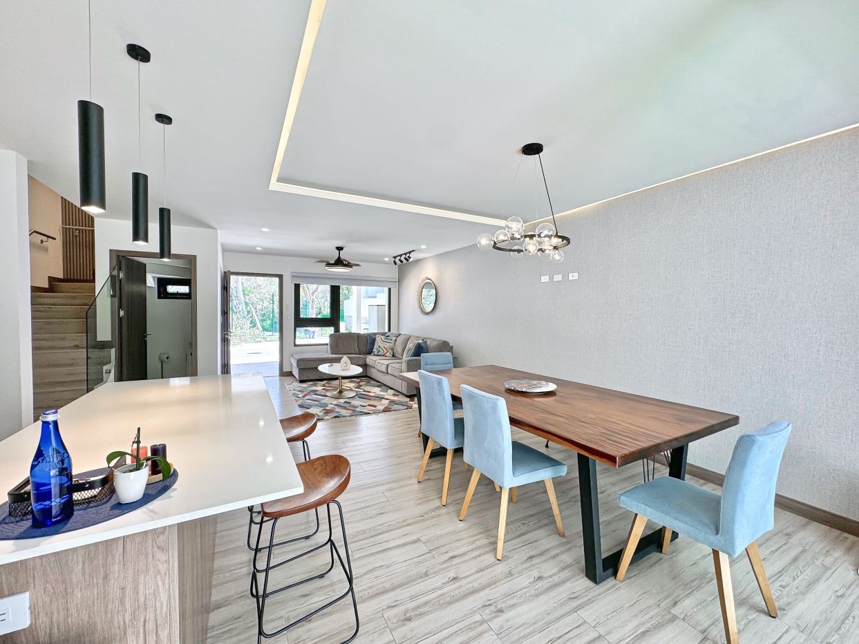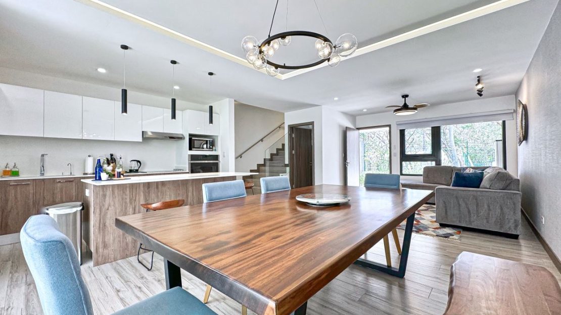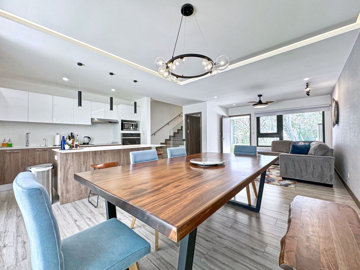 Casa Bosque Vistas boasts 3 bedrooms, 2.5 bathrooms, with an open distribution kitchen to both the living and dining room. The kitchen boasts a large island. The laundry room is adjacent to the kitchen and is tastefully decorated. Glass sliding doors open to a small yard and patio boasting views of the forest. This is a comforting area for lounging and gazing at nature.