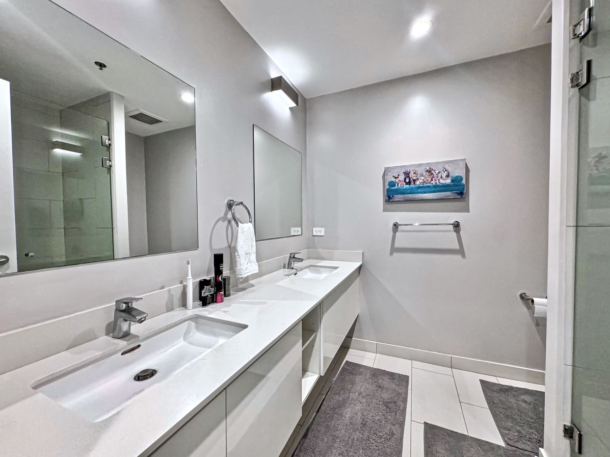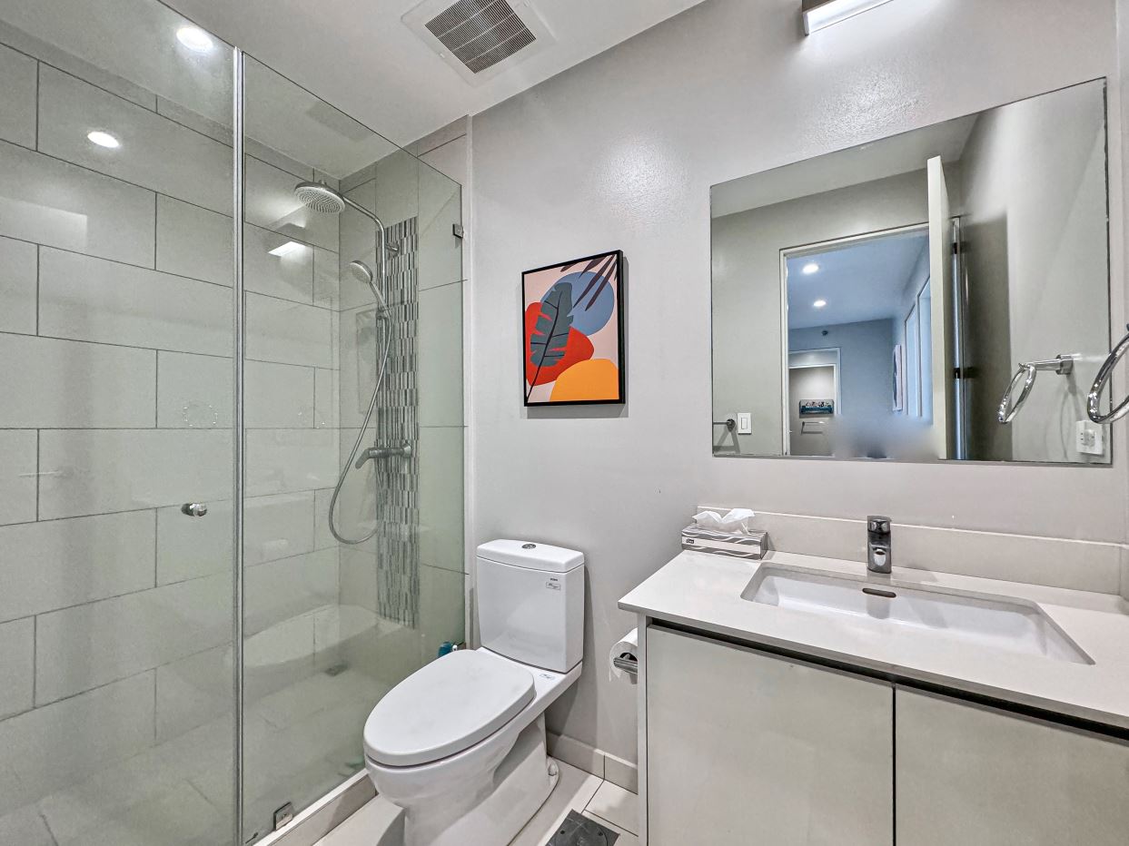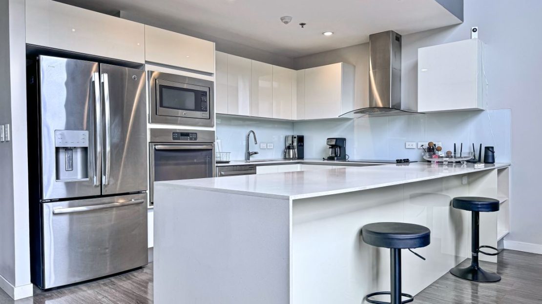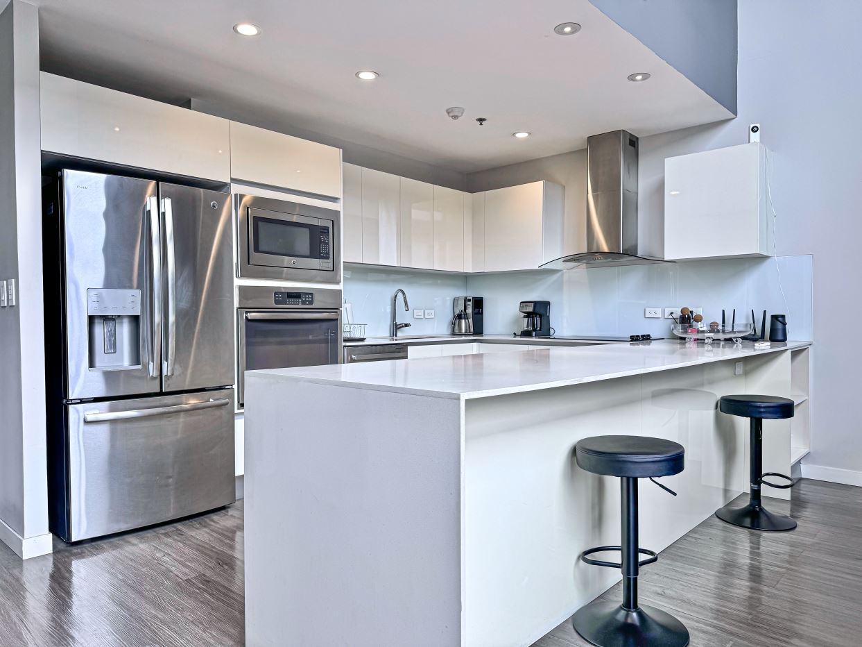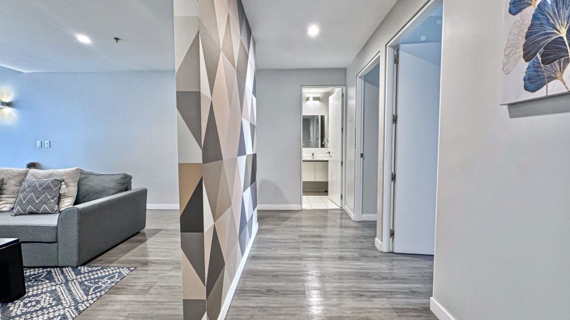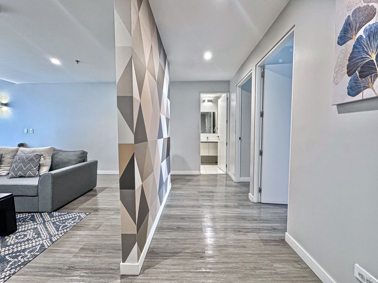 Upon entry, you’re welcomed by a spacious open-concept kitchen and living area, framed by floor-to-ceiling windows that capture breathtaking views of the valley, city, and mountains. Glass sliding doors extend the living space onto a generous balcony, creating an inviting indoor-outdoor flow perfect for lounging or entertaining.