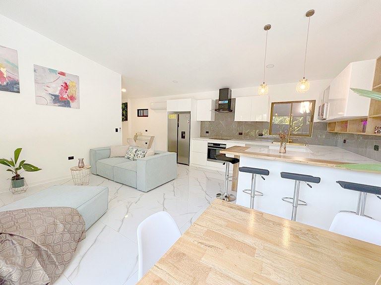 La villa cuenta con tres dormitorios elegantemente diseñados, incluyendo dos dormitorios en suite para mayor comodidad y privacidad. Con un total de tres lujosos cuartos de baño, cada uno acabado con materiales y accesorios de primera calidad, la casa rezuma estilo y sofisticación. La sala de estar de concepto abierto está bañada por la luz natural, creando un ambiente acogedor y aireado, mientras que los grandes ventanales ofrecen impresionantes vistas del exuberante jardín tropical y la impresionante piscina de lujo de 6 x 2,5 metros.