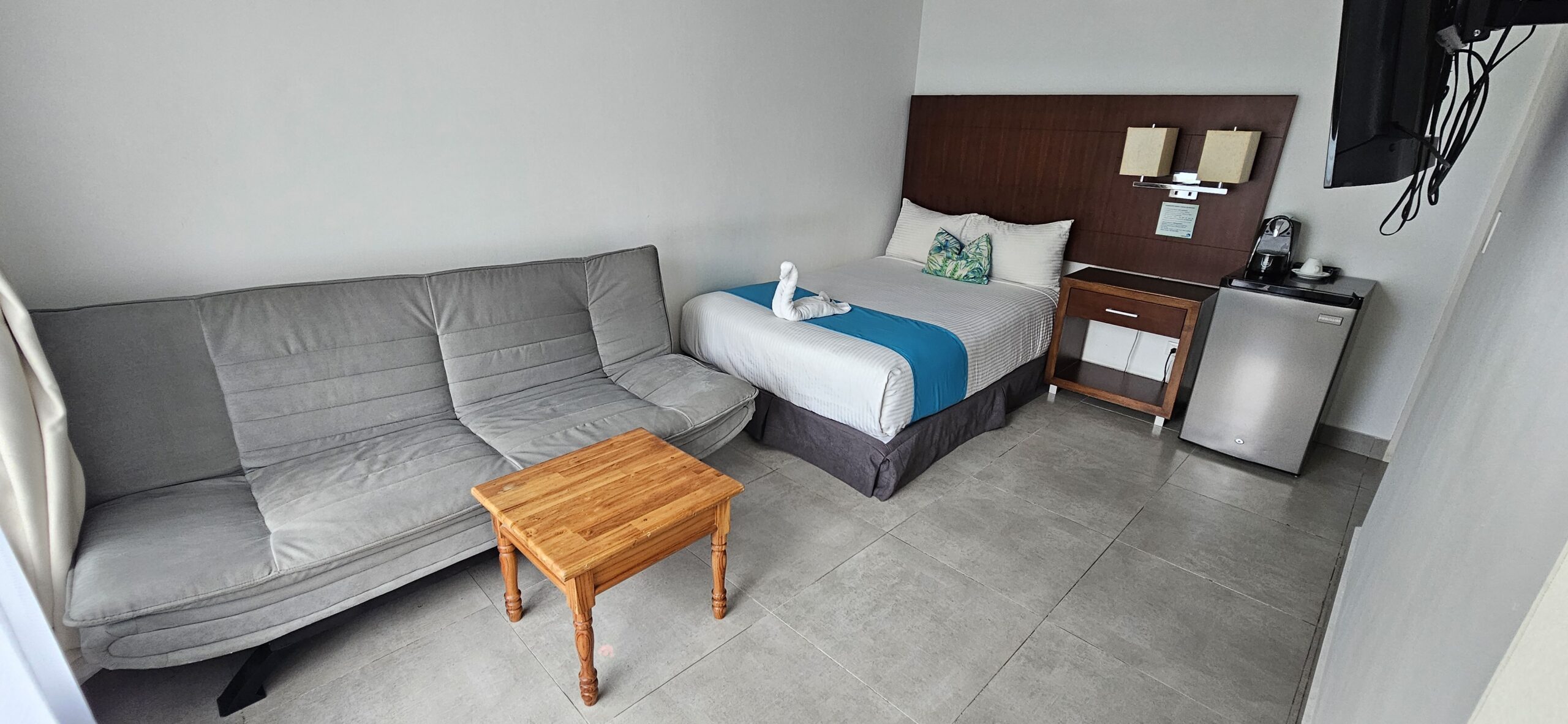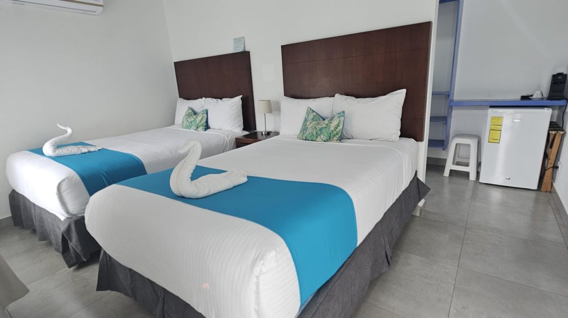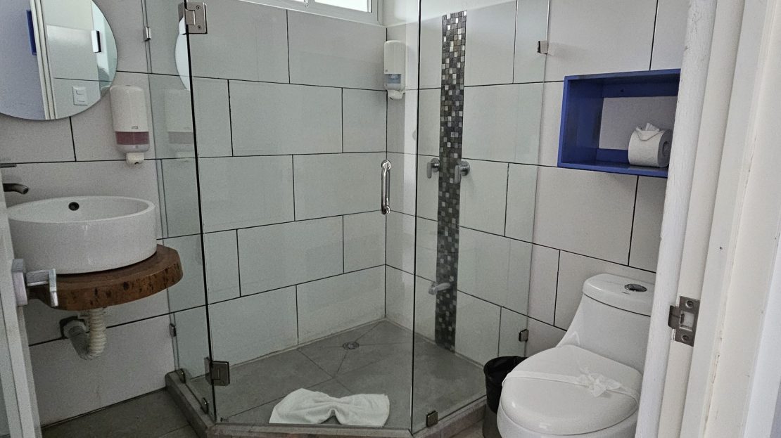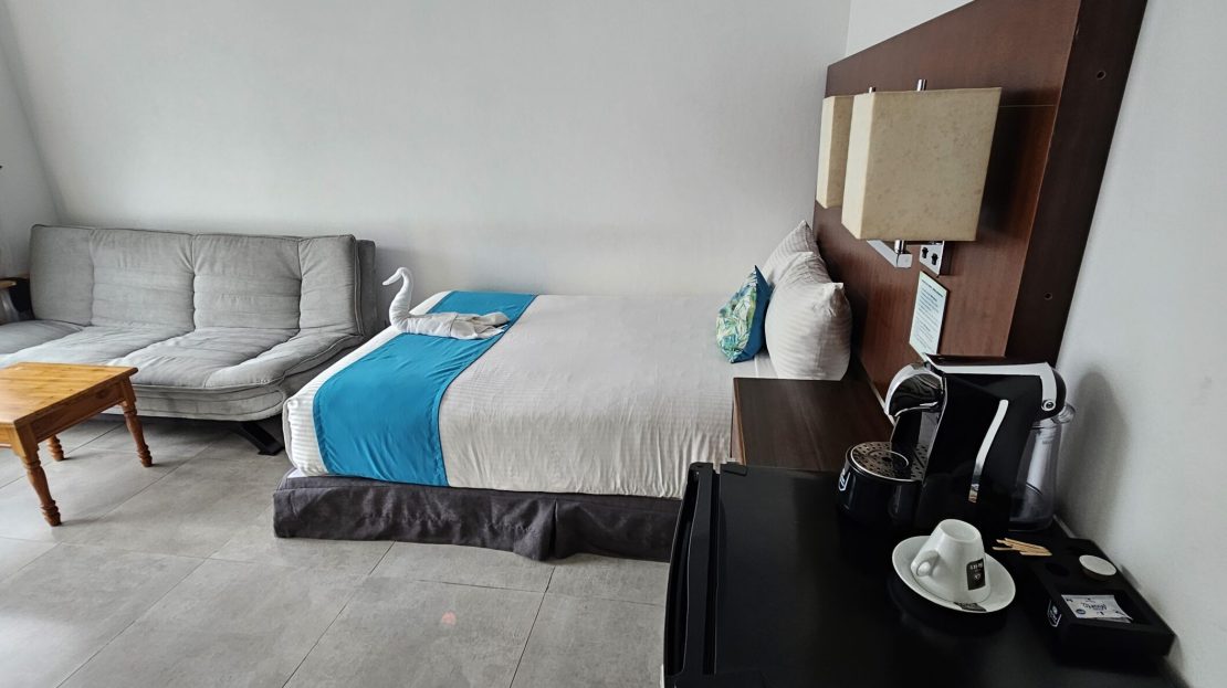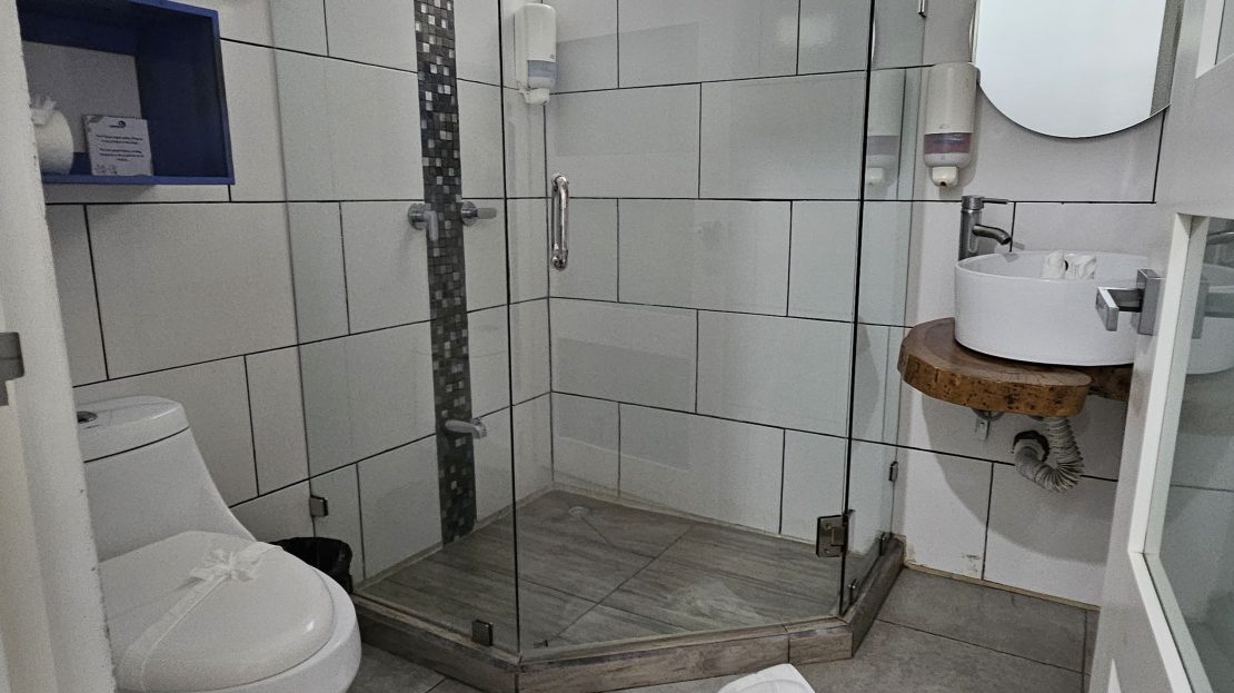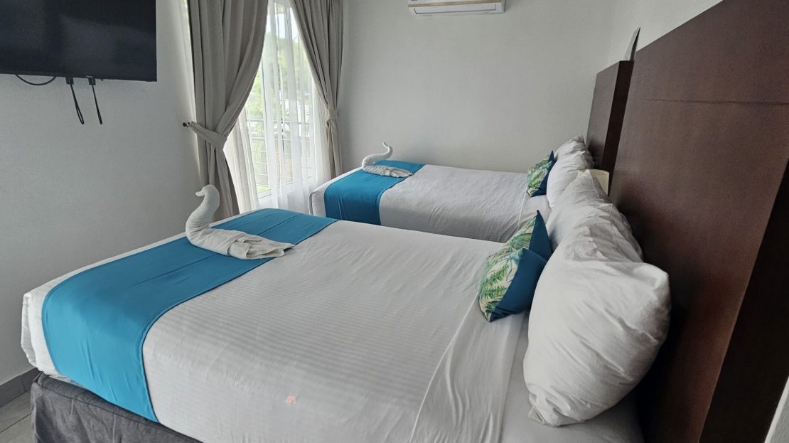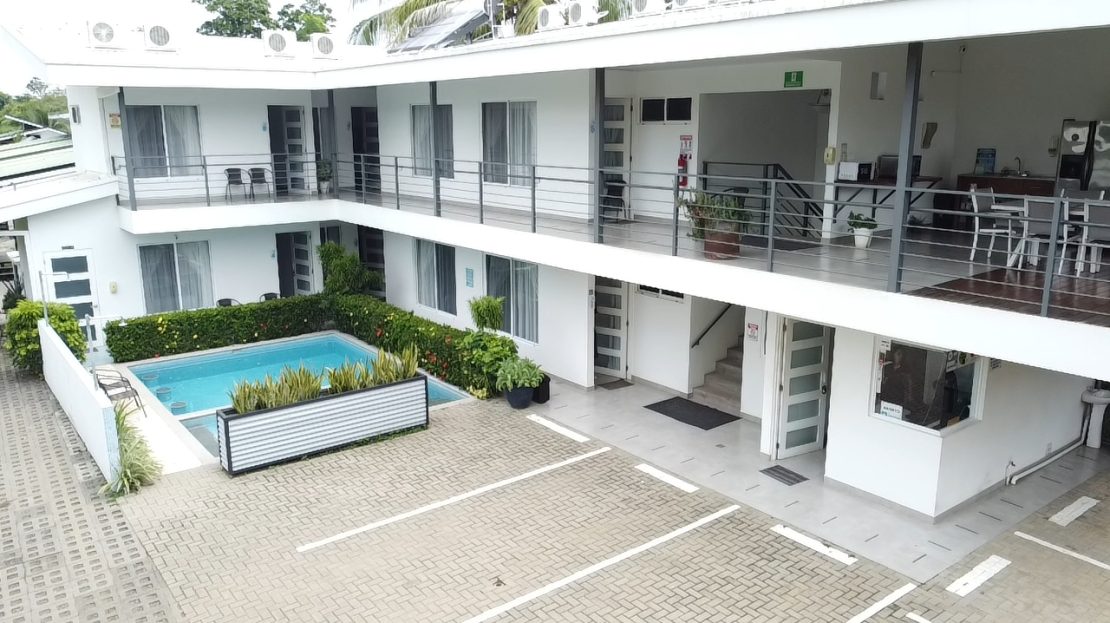 The hotel features 7 double-bed rooms and 1 single room, each equipped with a coffee maker, TV, AC, fridge, and ensuite bathroom. The single room includes an extra sleeping sofa for added convenience. The modern two-level building offers 8 parking spaces, is fully gated, and monitored by security cameras.