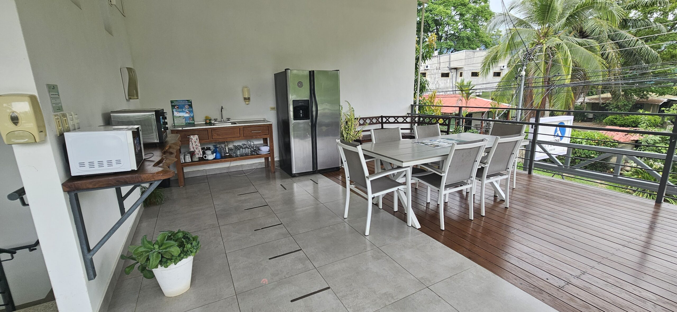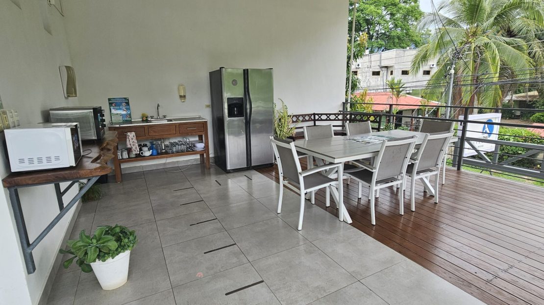 On the upper level, guests can enjoy a spacious open-air dining area with table for six and some benches, a double-door fridge, microwave, oven, coffee maker, and sink. This shared space allows guests to enjoy coffee, tea, or food deliveries in the fresh air.