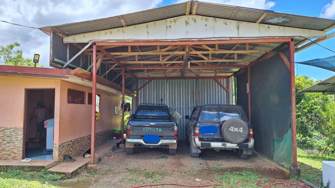 Main House: 115 m² solid concrete construction, featuring 3 bedrooms, 1 bathroom, spacious living room, kitchen, laundry room, porch, and covered parking for 2 vehicles.