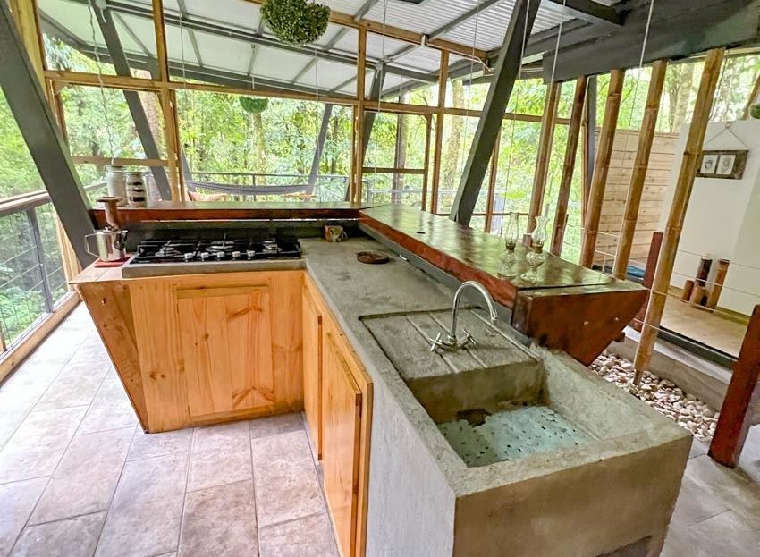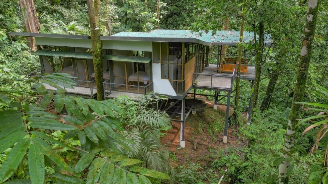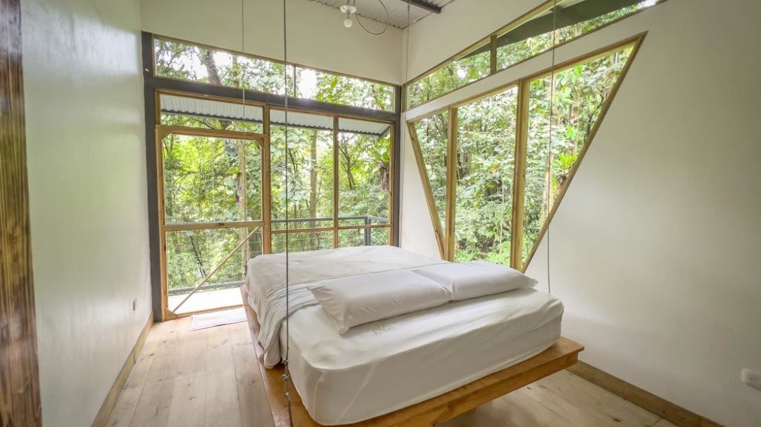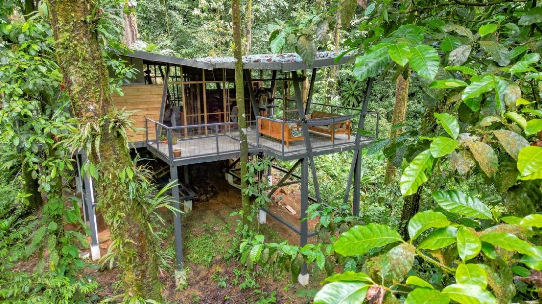 This rare concept house has a master bedroom and two secondary bedrooms each with a queen bed and a bathroom with a shower that features a view of the outside lushness. A fully equipped kitchen includes everything you need for cooking, while an outdoor lounge perched high (approx. 4 meters) amazes with a view of the immense beauty and mystery of the wild Jungle. Located in Piedras Blancas, in the South Pacific of Costa Rica, and within the Corcovado Park migratory corridor. The sound of birds, the beauty of multicolored butterflies, surprise visits from animals, and sounds you’ve never heard of will be your everyday experience. This setting transports you to a magical world, tropical wilds at 1000 feet of elevation.