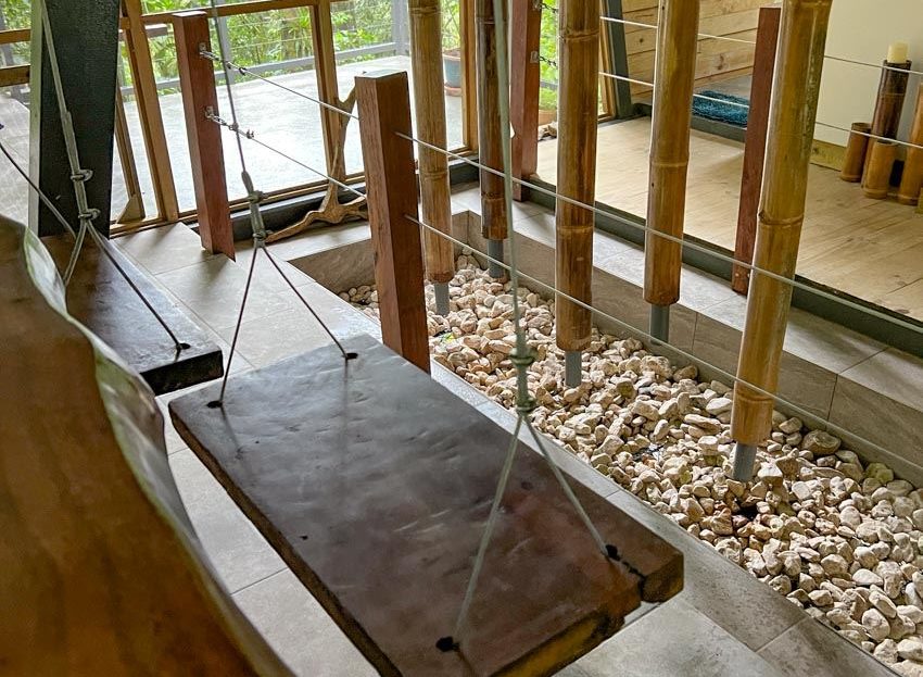 Concave roof: during the rains the water passes through the house through 5 bamboo trees.