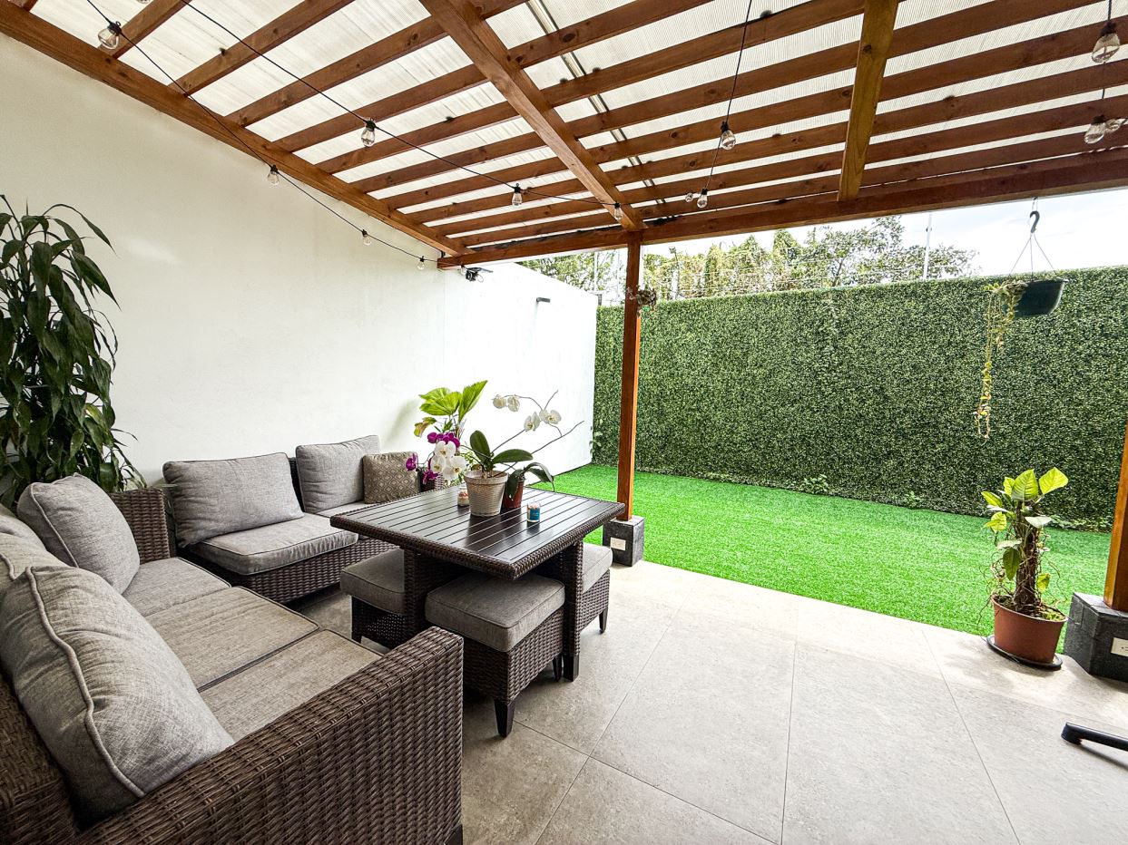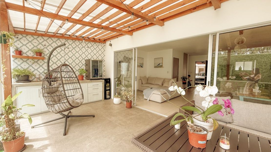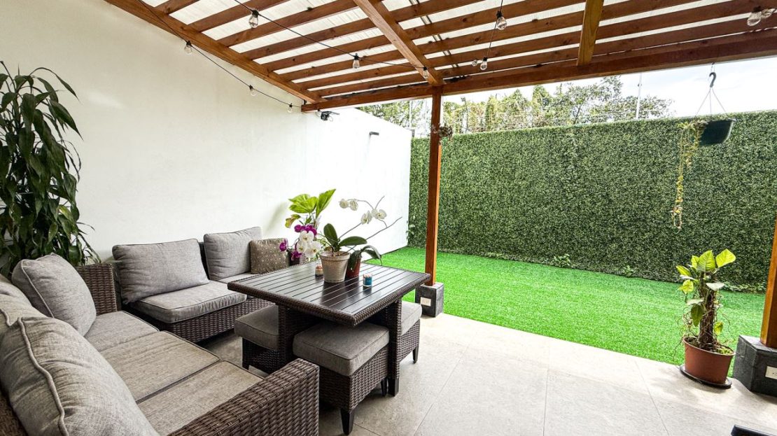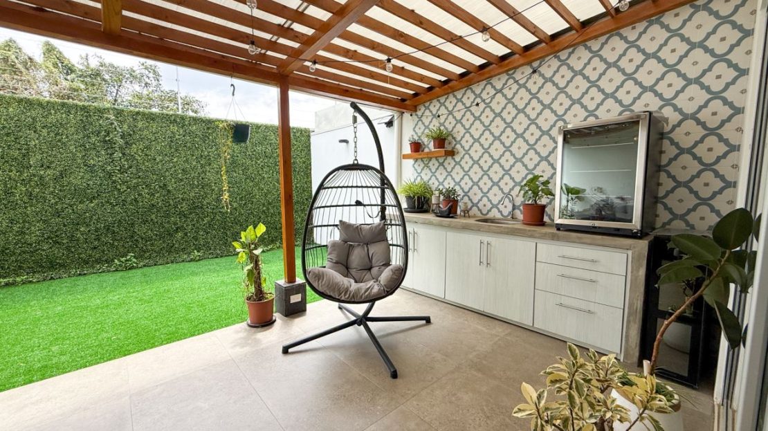 Casa de tres habitaciones, sala, comedor y cocina integrada. Cuenta con una terraza con jardín encantador, ideal para reuniones sociales o como espacio de trabajo. Aire acondicionado en el dormitorio principal y una habitación con escritorio. Área de lavado con lavadora y secadora. Garaje para dos autos.
