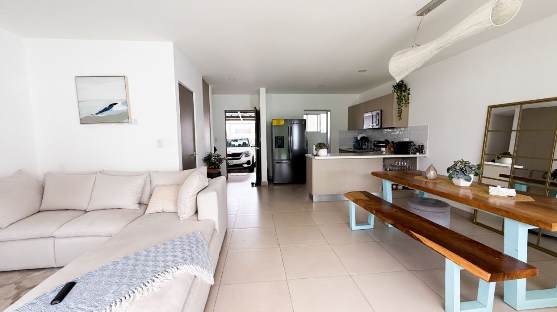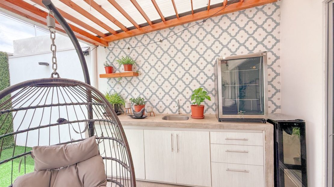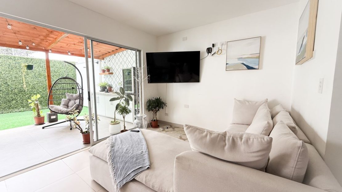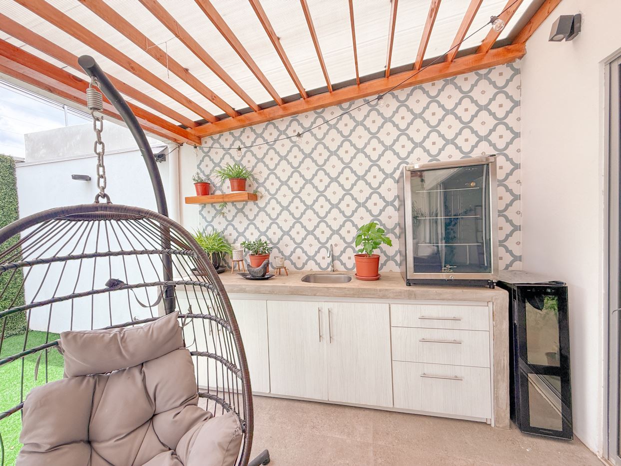 Casa de tres habitaciones, sala, comedor y cocina integrada. Cuenta con una terraza con jardín encantador, ideal para reuniones sociales o como espacio de trabajo. Aire acondicionado en el dormitorio principal y una habitación con escritorio. Área de lavado con lavadora y secadora. Garaje para dos autos.