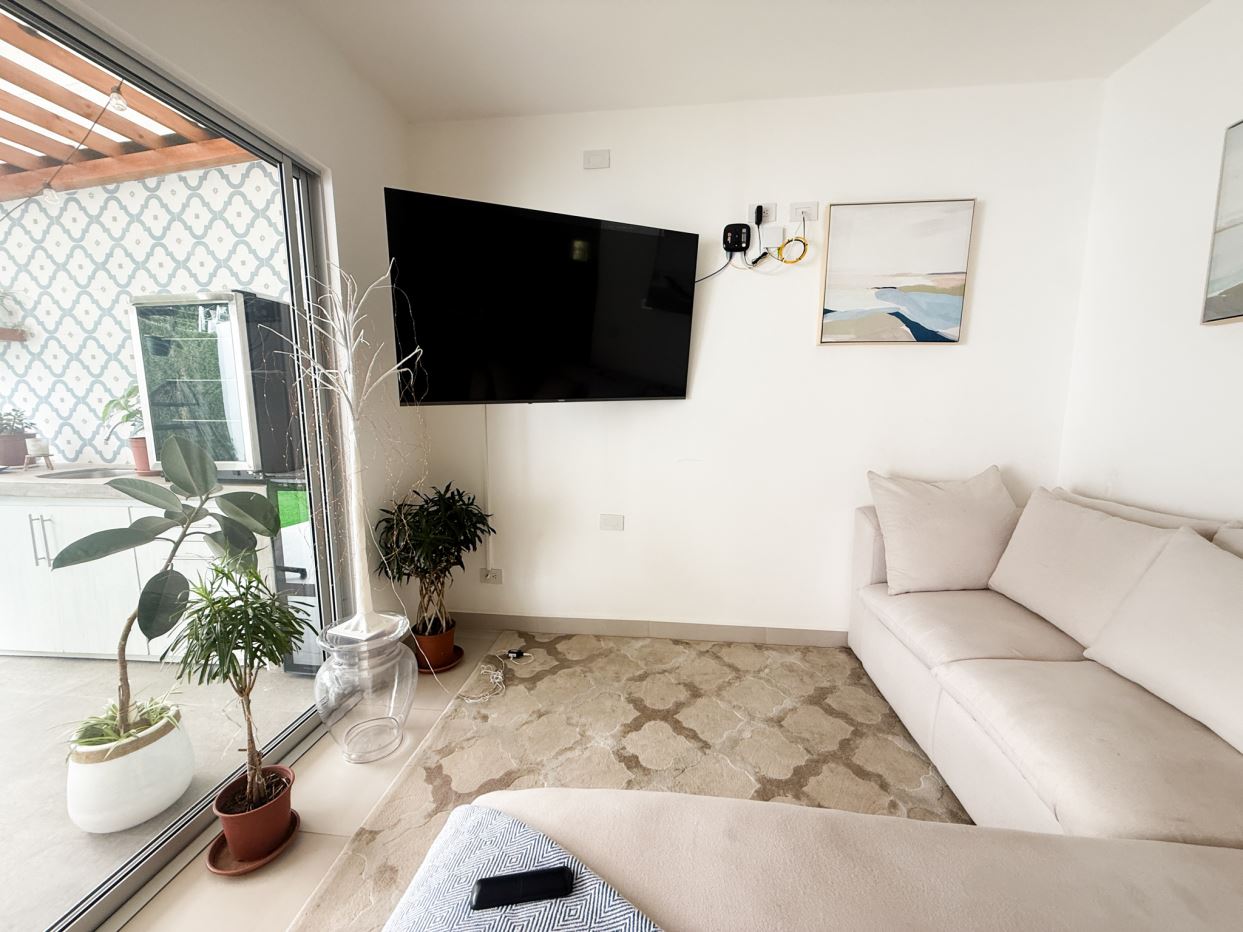 The house features three bedrooms, living room, dining area, and an integrated kitchen. It has a terrace with a charming garden, ideal for social gatherings or as a workspace. Air conditioning in the master bedroom and one bedroom with a desk. Laundry area with washer and dryer. Garage for two cars.