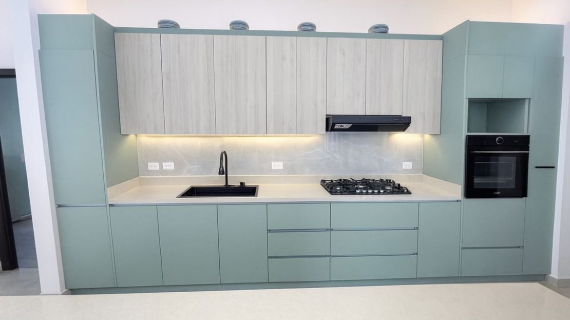 Amplio mueble de cocina construido en melamina hidrófuga, ideal para durabilidad.