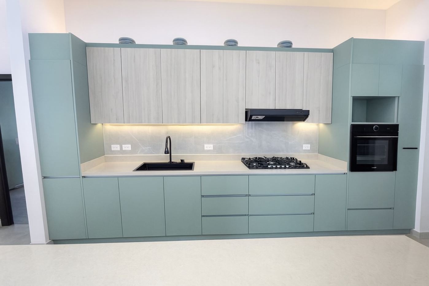 Spacious kitchen cabinetry built with moisture-resistant melamine for durability.