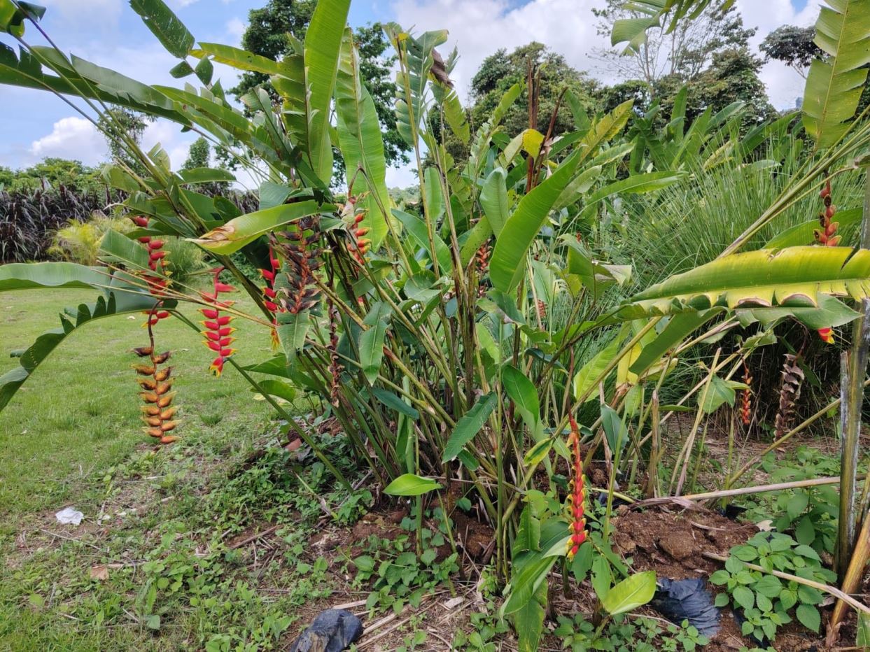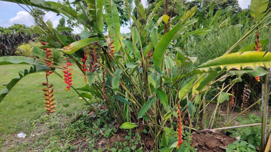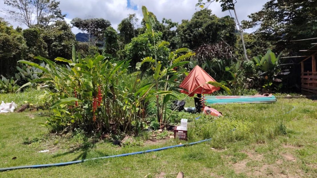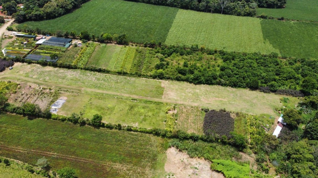 Terreno fértil con áreas de pasto de siembra, pasto de corte para animales y plantas ornamentales.