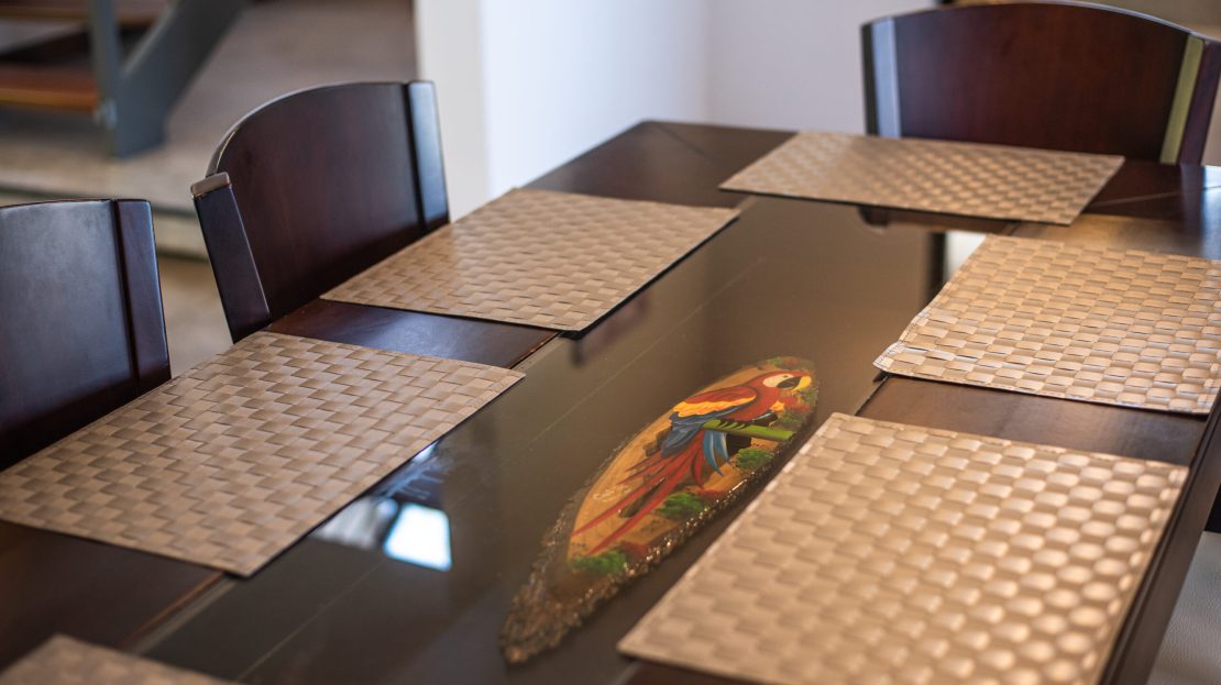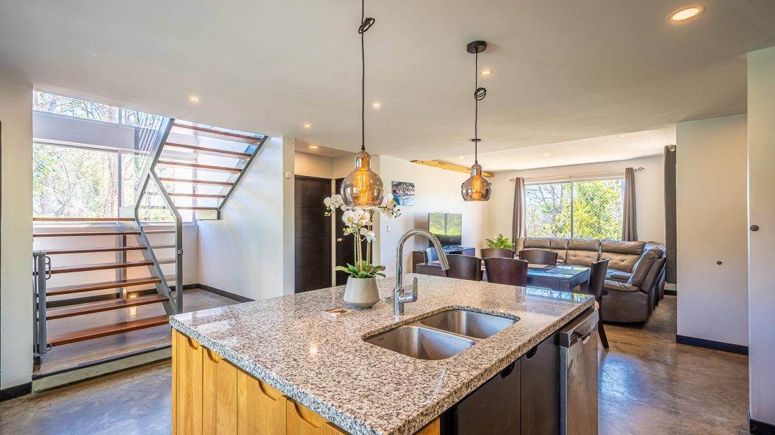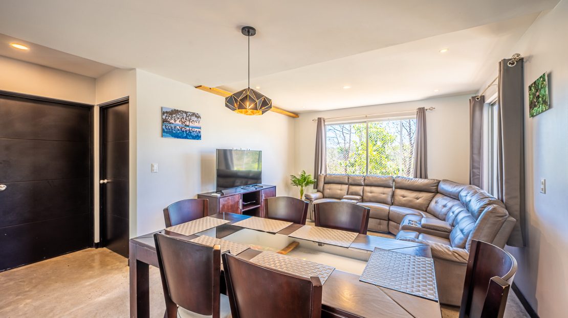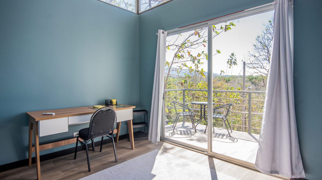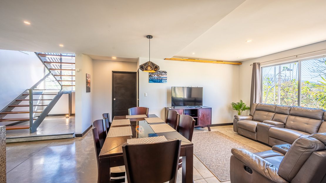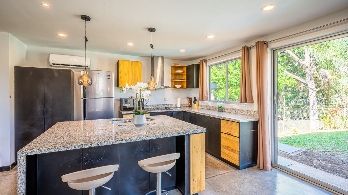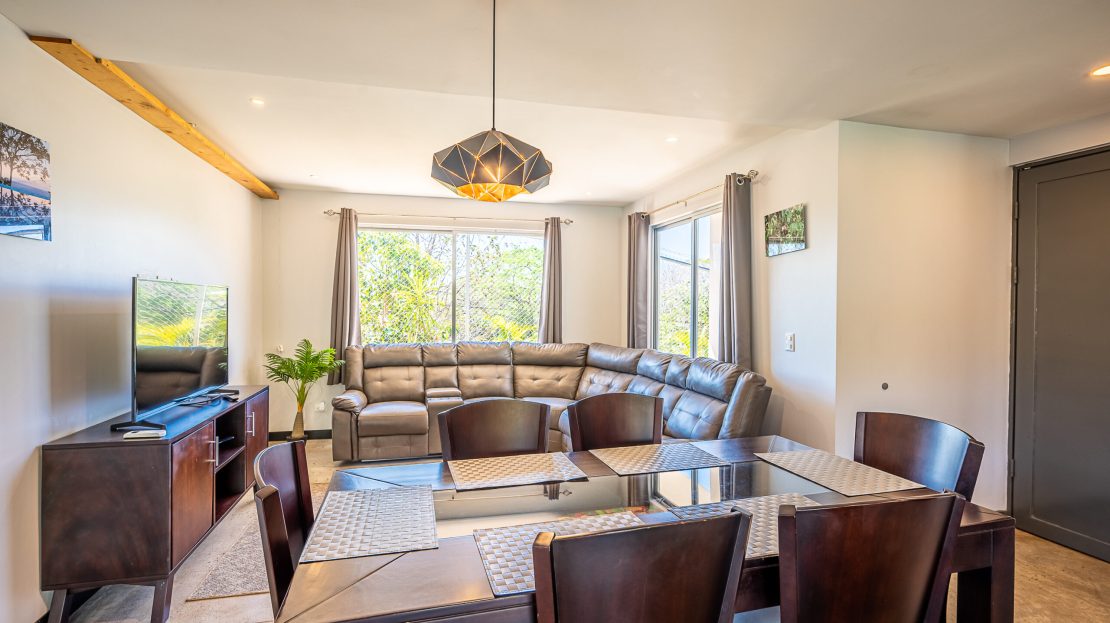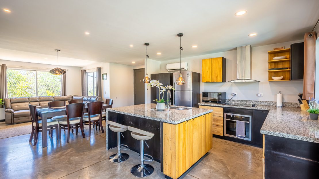 Casa Carara is fully furnished with Sarchí carved wooden furniture, sofas, Queen and King beds, dining set for 6 people, refrigerator, built-in electric stove, dishwasher, microwave, laundry center, lamps, air conditioning, barbecue grill and security system with camera. All finishes are luxurious