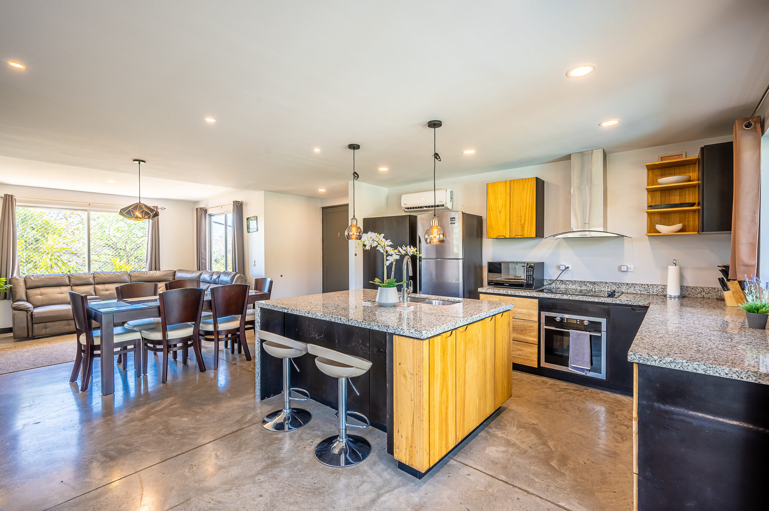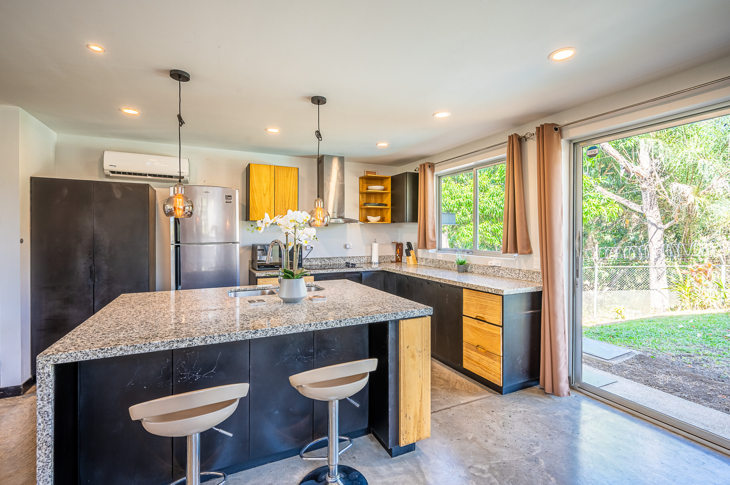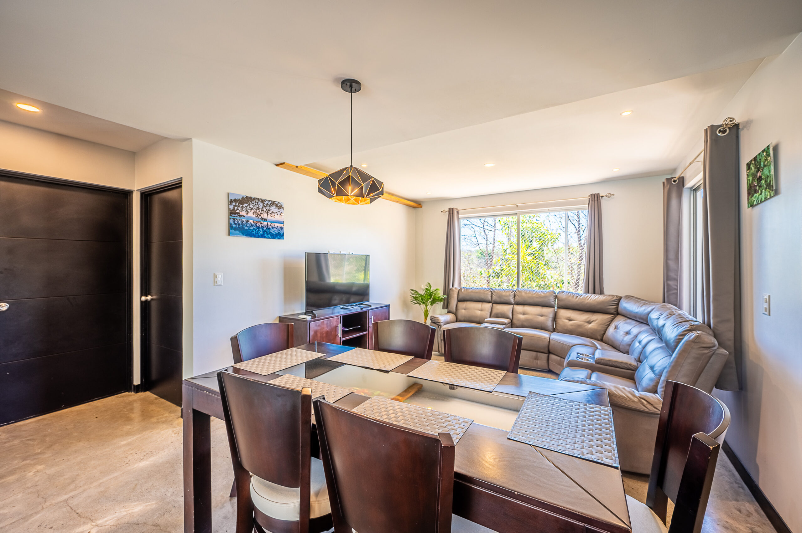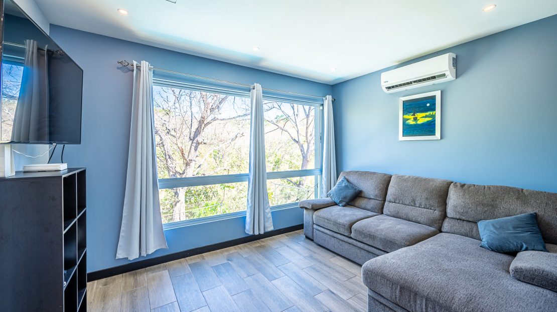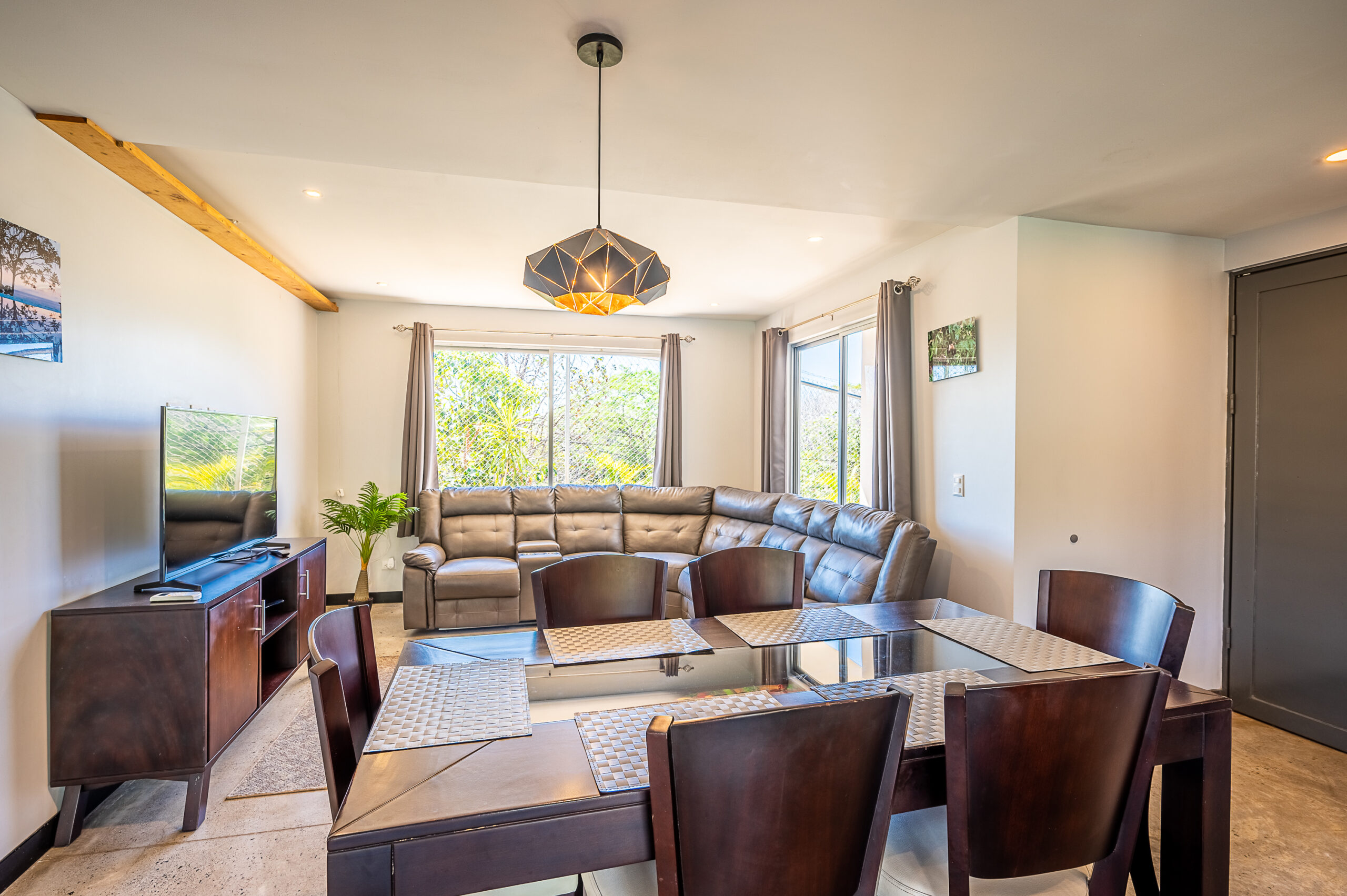 Casa Carara is fully furnished with Sarchí carved wooden furniture, sofas, Queen and King beds, dining set for 6 people, refrigerator, built-in electric stove, dishwasher, microwave, laundry center, lamps, air conditioning, barbecue grill and security system with camera. All finishes are luxurious