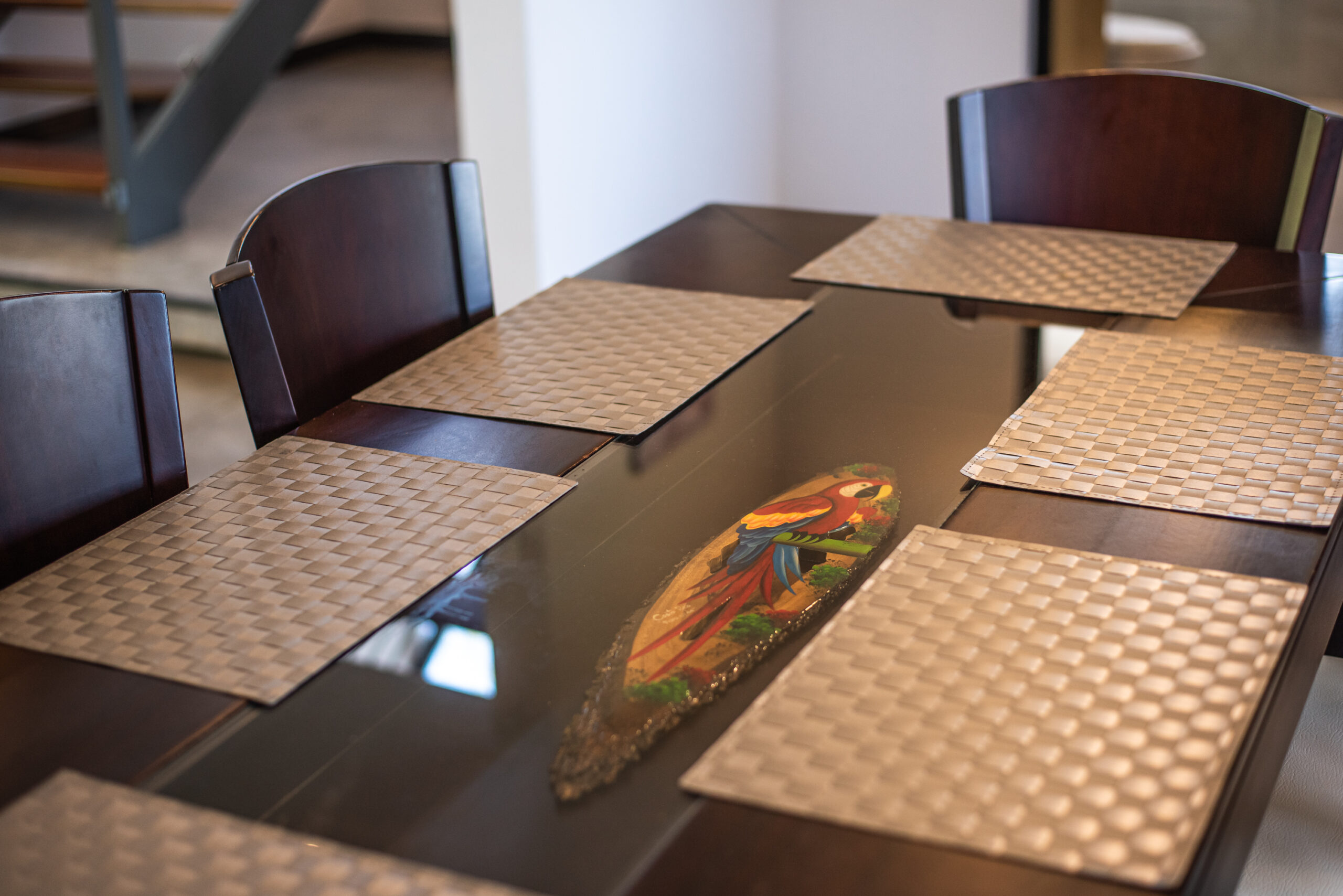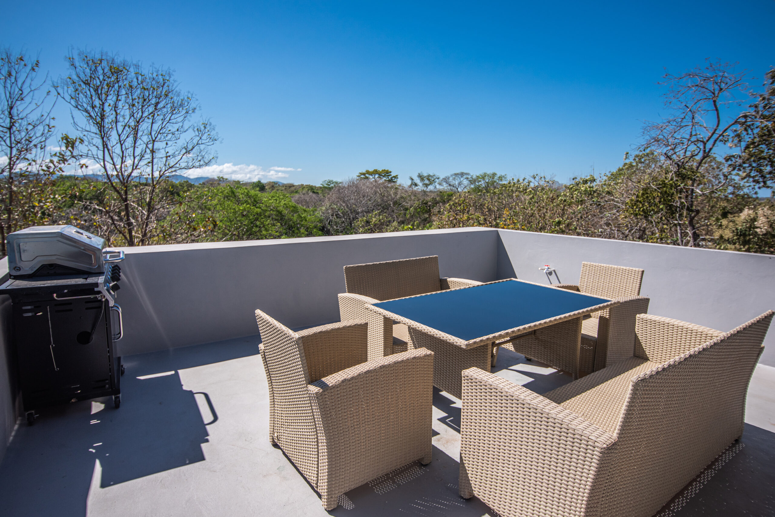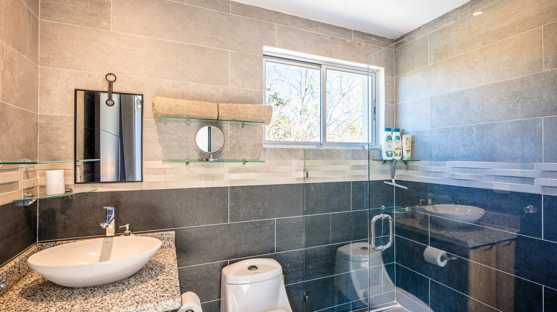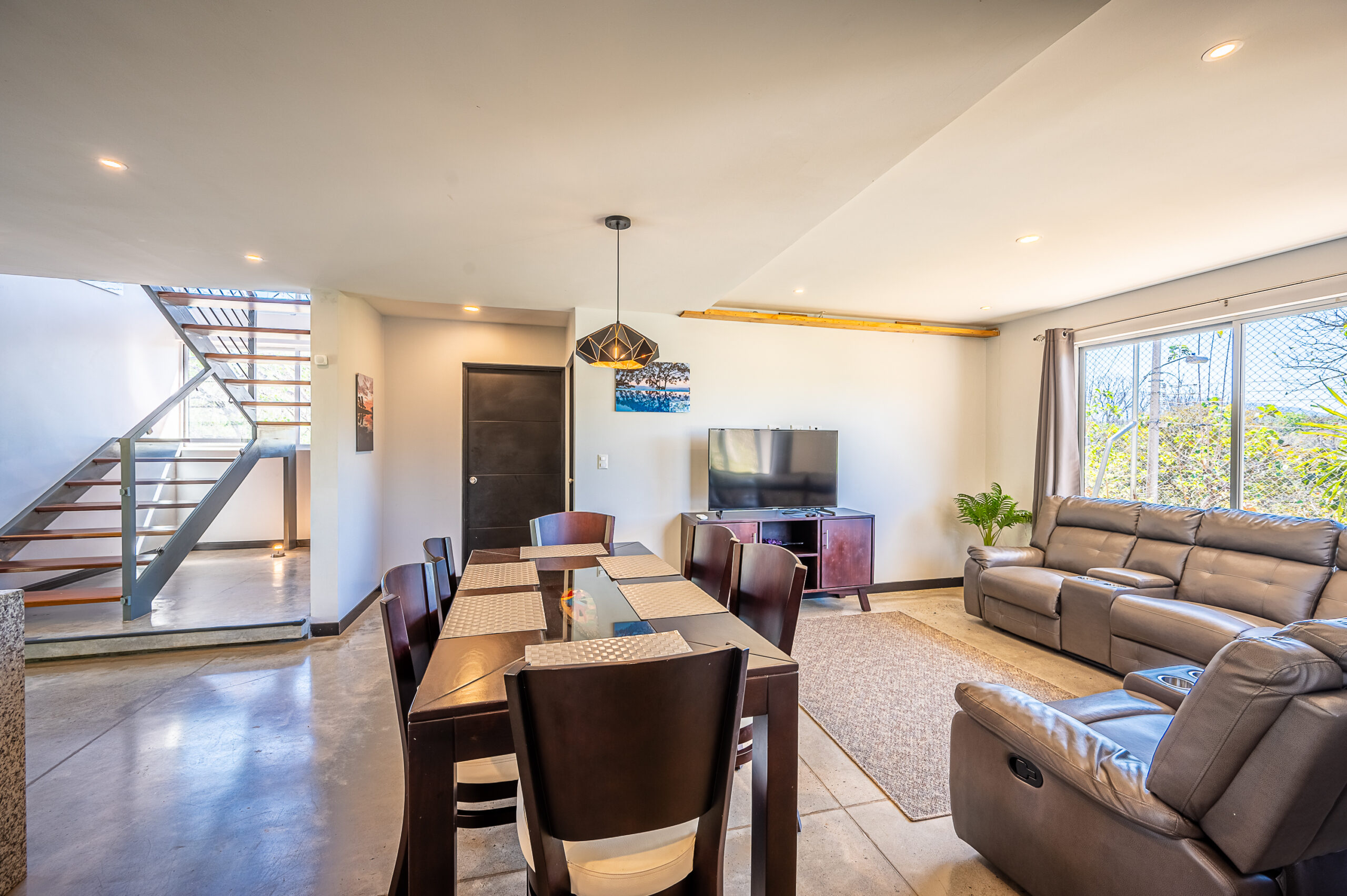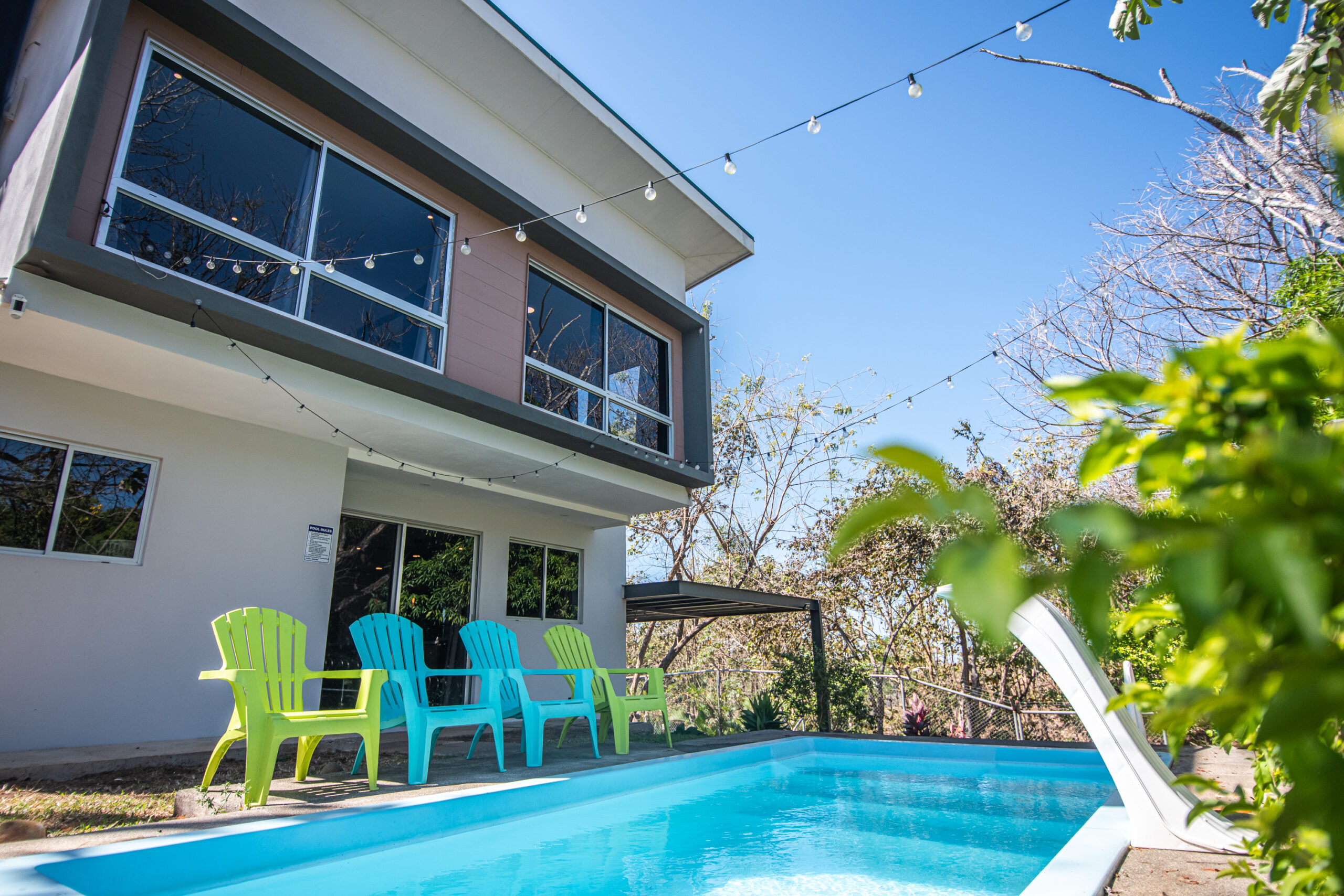 Casa Carara is fully furnished with Sarchí carved wooden furniture, sofas, Queen and King beds, dining set for 6 people, refrigerator, built-in electric stove, dishwasher, microwave, laundry center, lamps, air conditioning, barbecue grill and security system with camera. All finishes are luxurious
