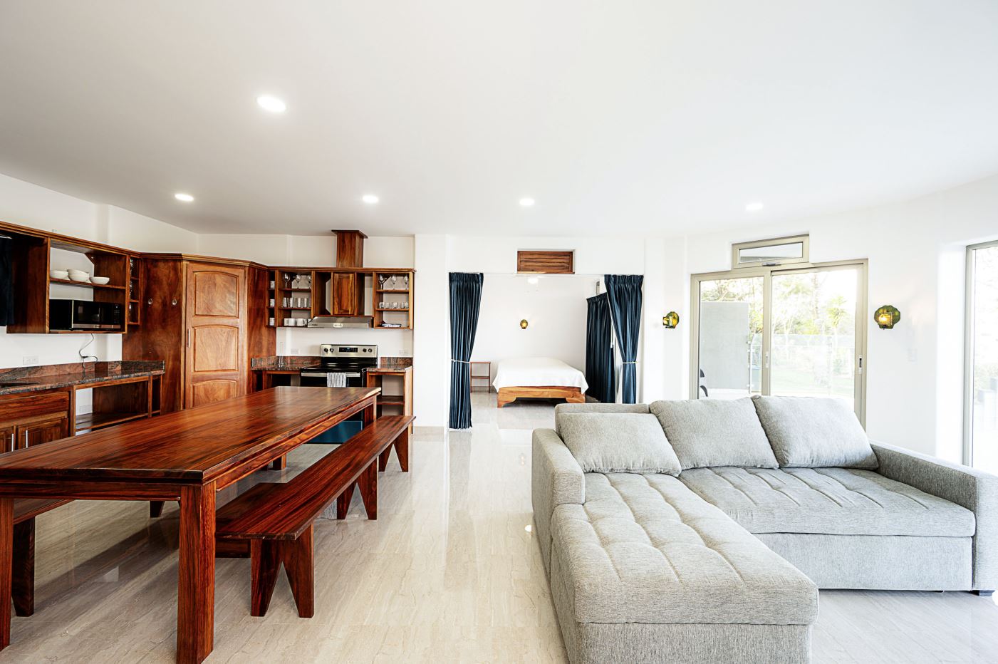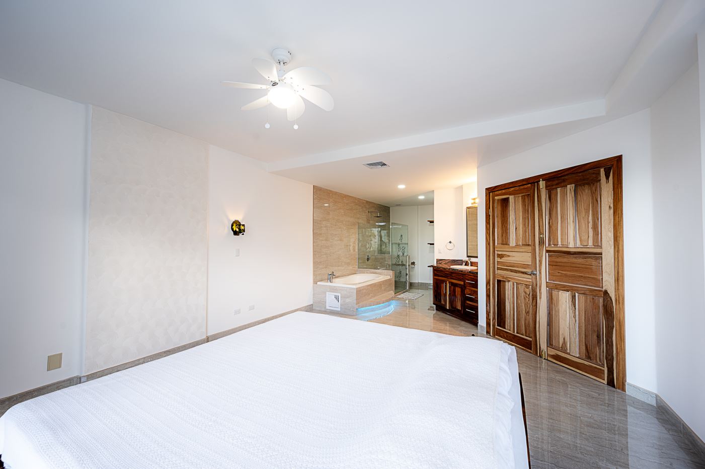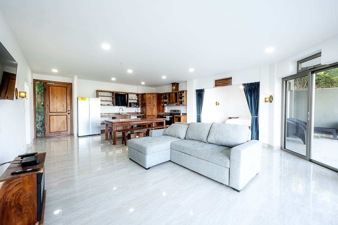 The light and spacious design of this condo begins with the large open plan kitchen fully fitted with high spec appliances and an island breakfast bar, and which opens out onto a wood floored furnished living area. From the den you can access the sunroom and then onto the balcony.