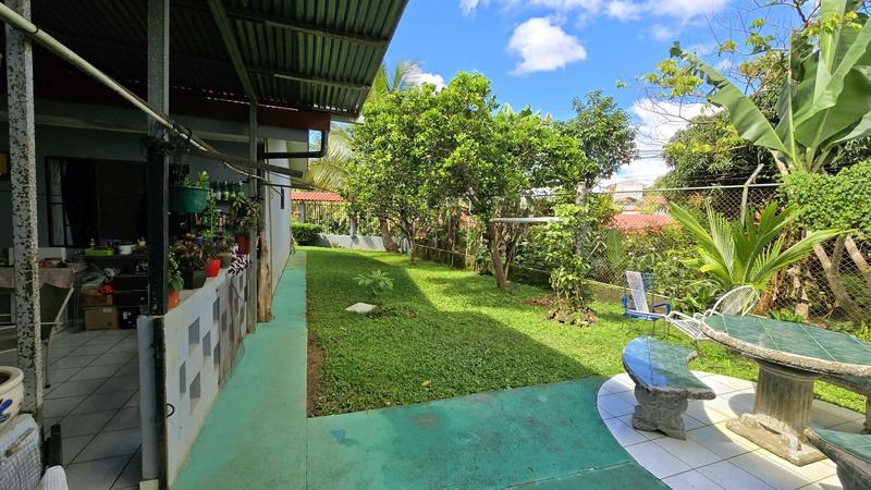 Terraza techada y jardín con árboles frutales, ideal para disfrutar del aire libre.