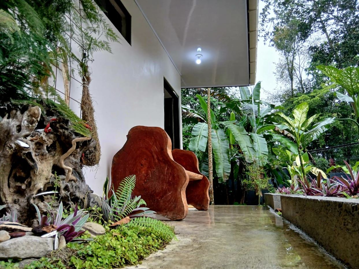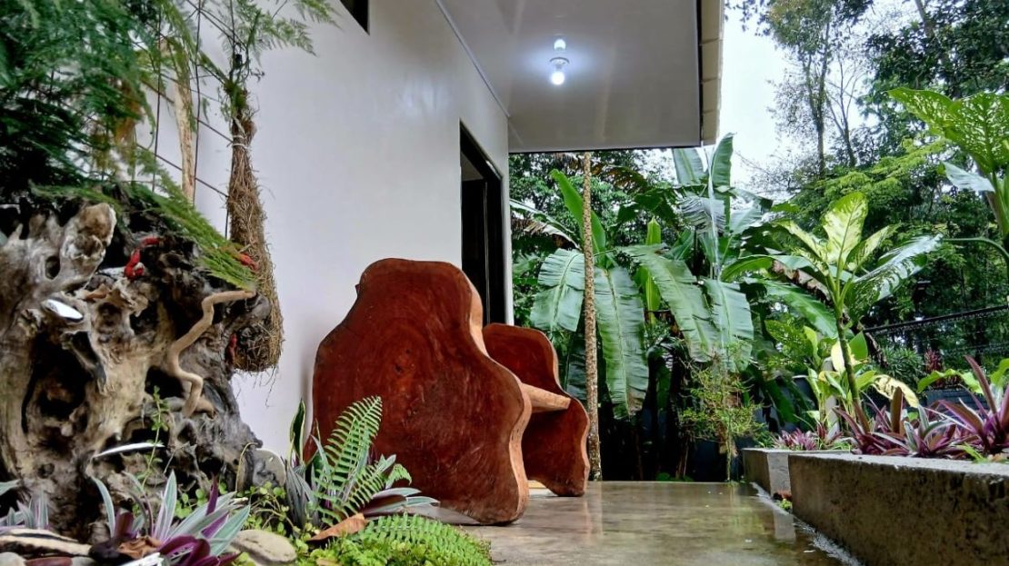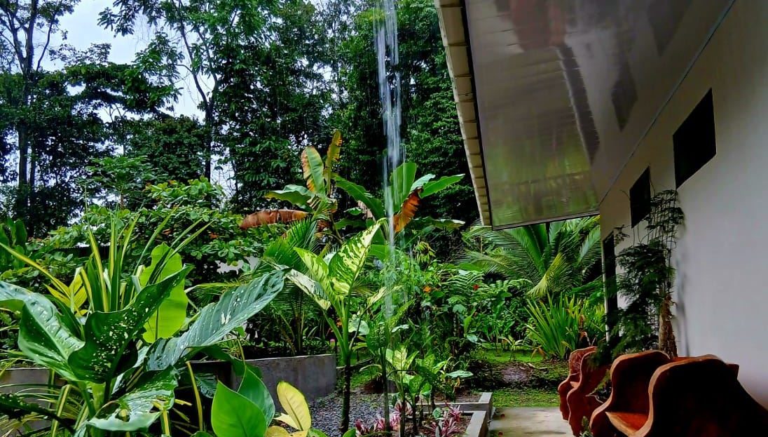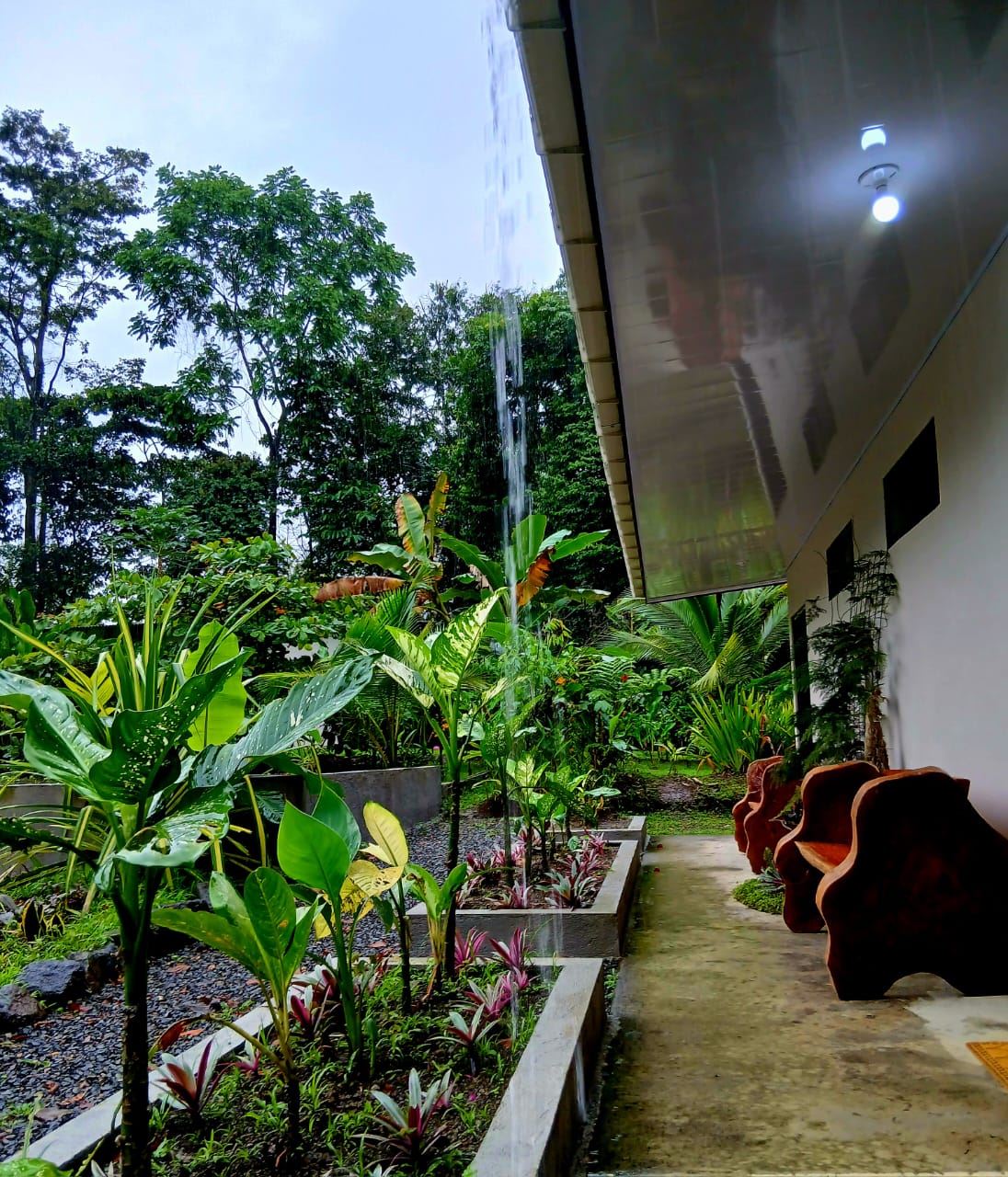 its natural biodiversity within. Gardens contain special features such as frog ponds to preserve and reproduce frogs such as red-eyed leaf frogs, glass frogs, brilliant forest frogs, toads, and many more unique and rare species. The landscape is designed in a way to create privacy by using beautiful and animal-friendly plants and flowers; therefore, it often has visitors such as great curassows, wild turkeys, and chachalacas walking in for a treat. The main ideas of the place is to live in harmony with the nature.