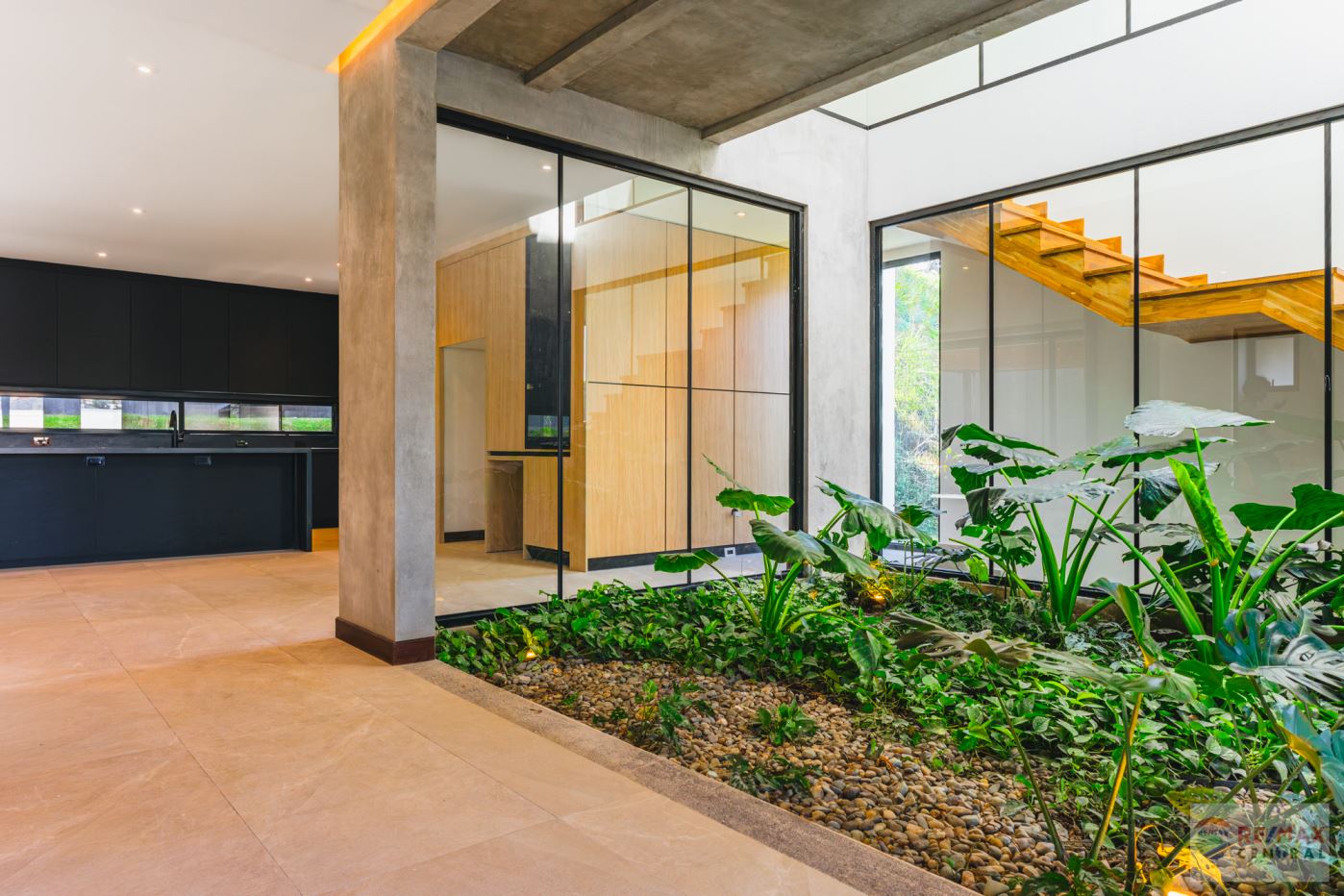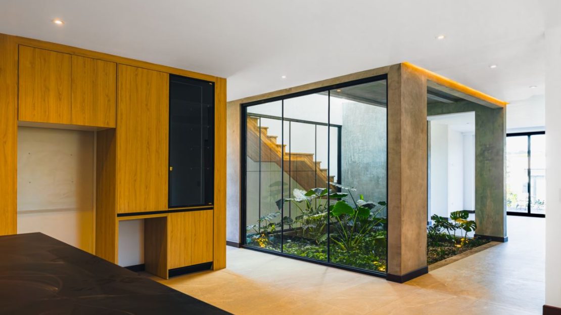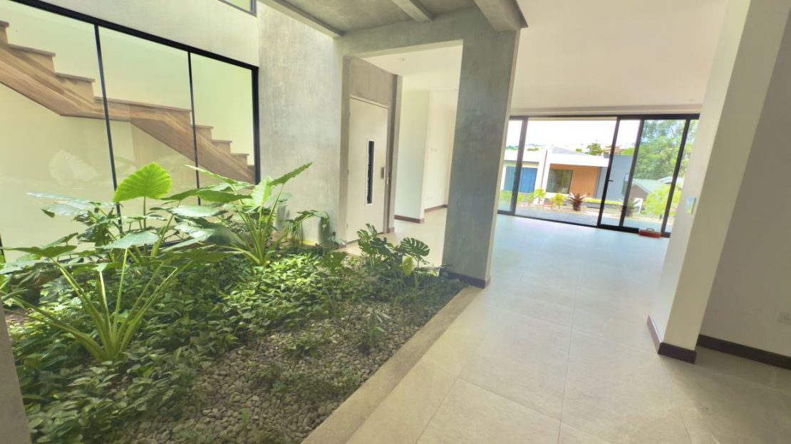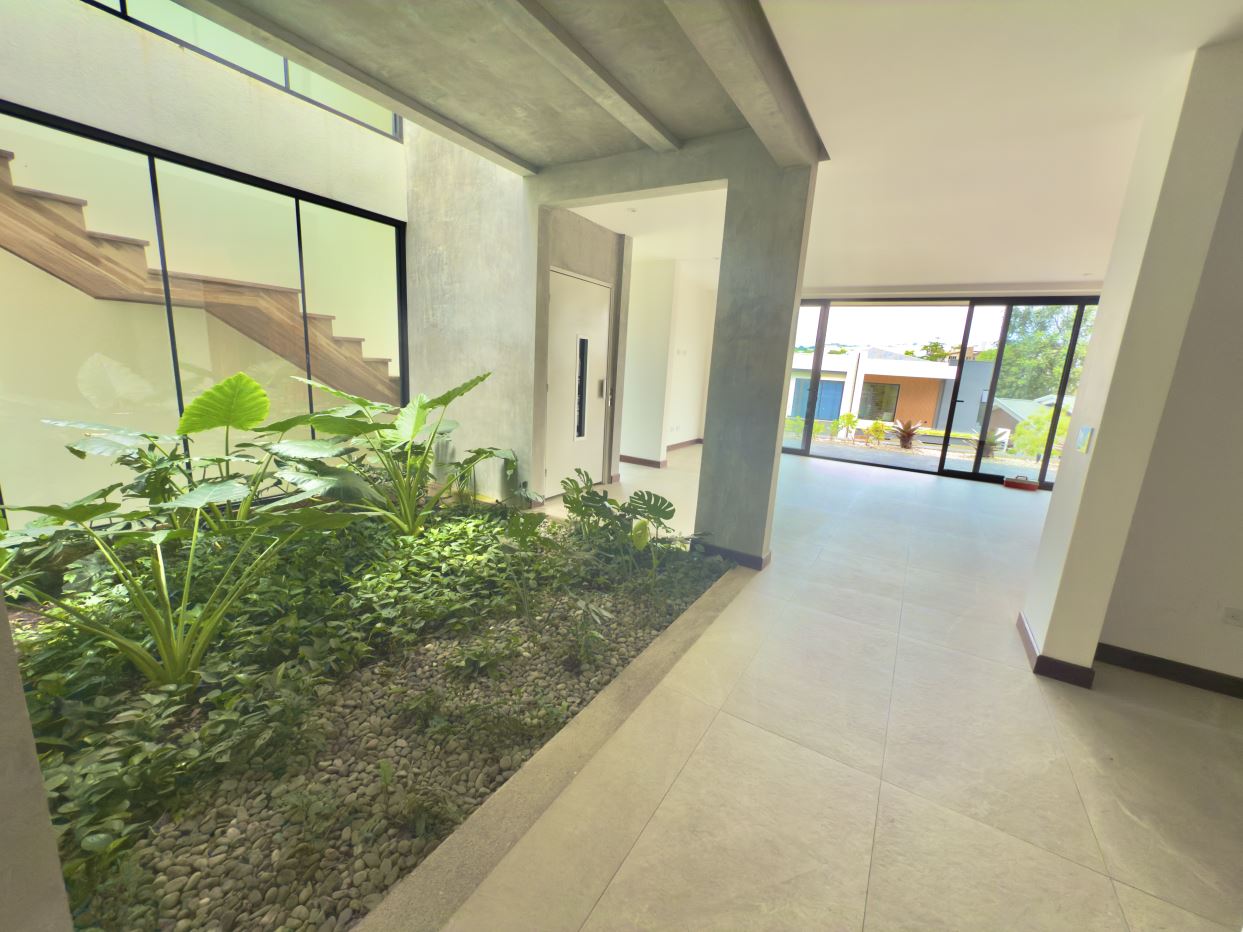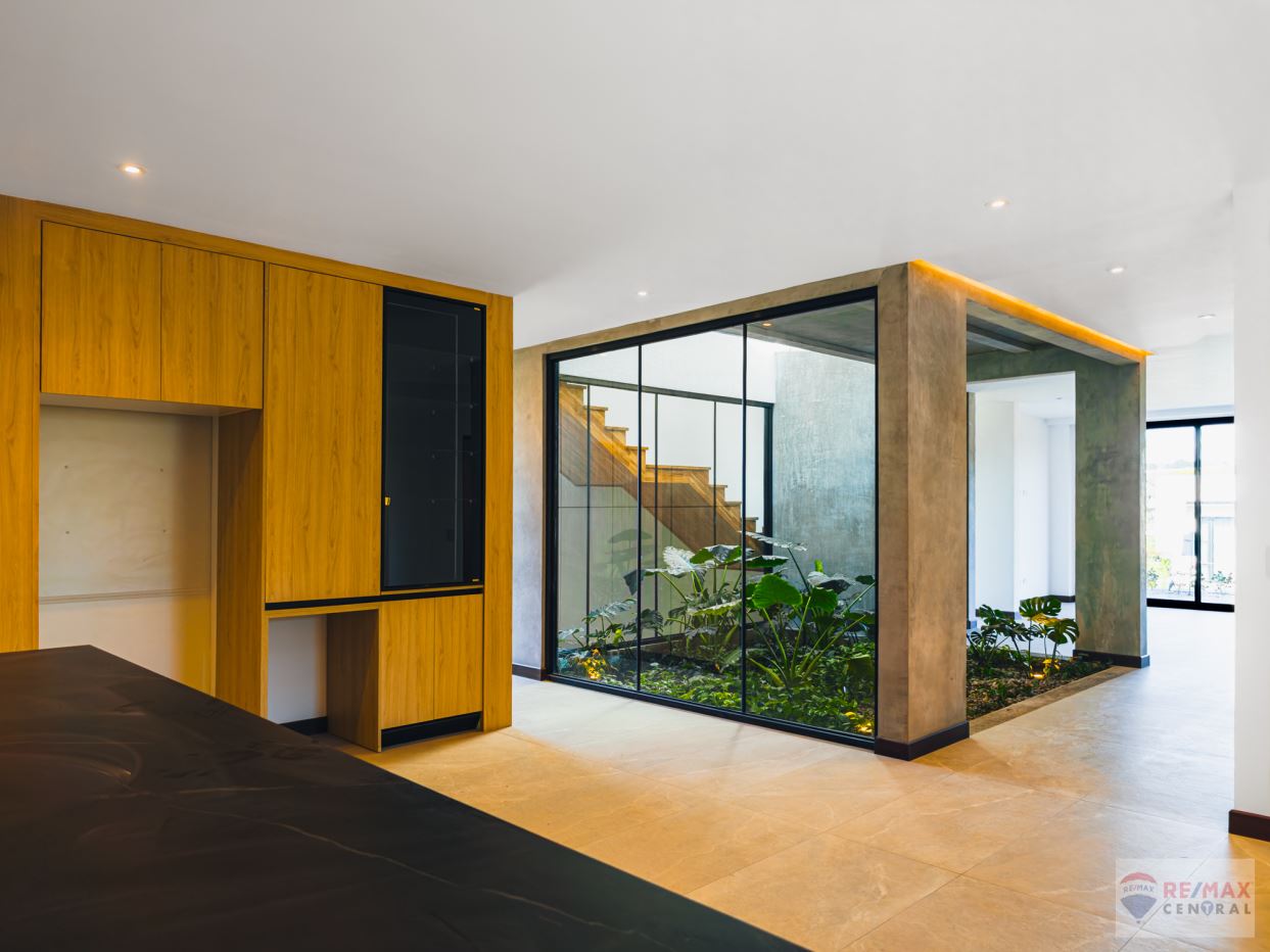 Second floor: Spacious social area with open-concept living and dining room, access to a modern balcony with teak wood accents, and a natural indoor garden that adds freshness and warmth. The large kitchen features a contemporary design and direct access to the terrace and garden—perfect for entertaining and enjoying Costa Rica’s climate.