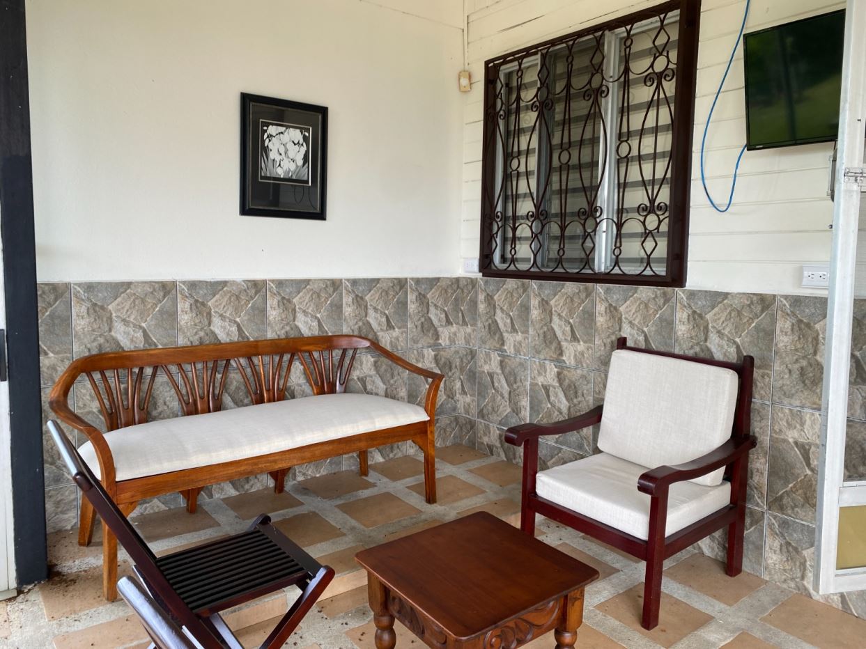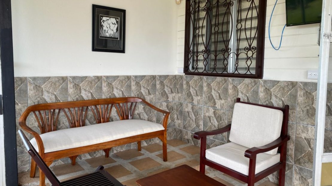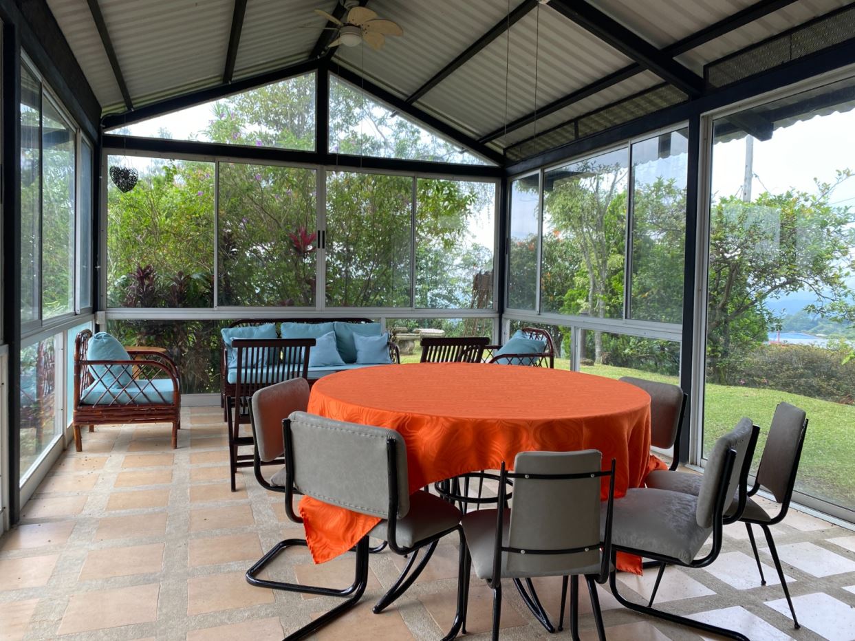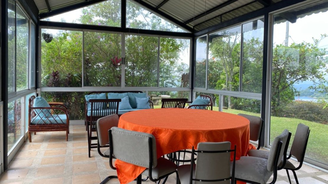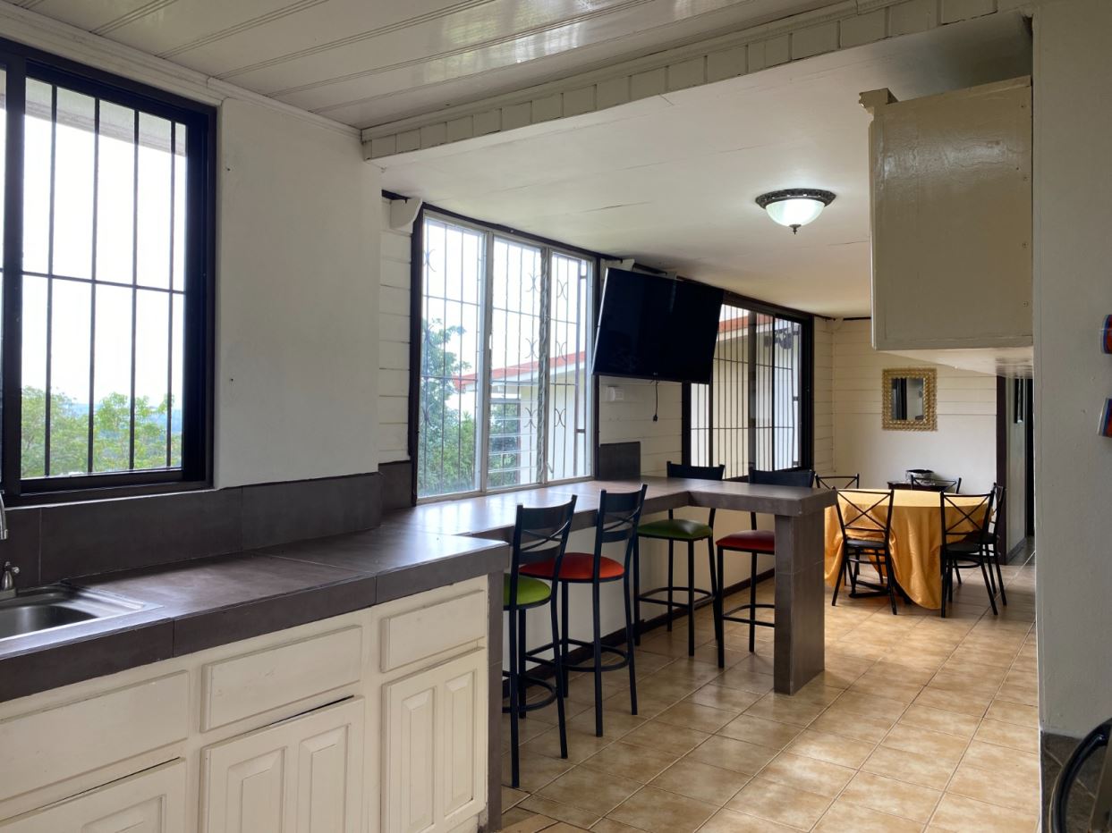 La casa ofrece amplios y agradables espacios sociales, incluyendo una terraza amueblada con mesas y área de bar junto a la sala, decorada con sillones, cuadros y televisor. Dos de las habitaciones cuentan con cama matrimonial, perfectas para el descanso.