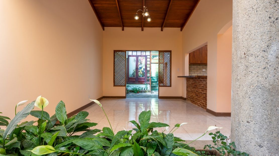 La casa también cuenta con una pequeña terraza techada decorada con plantas, ideal para disfrutar de una buena lectura y una taza de café.