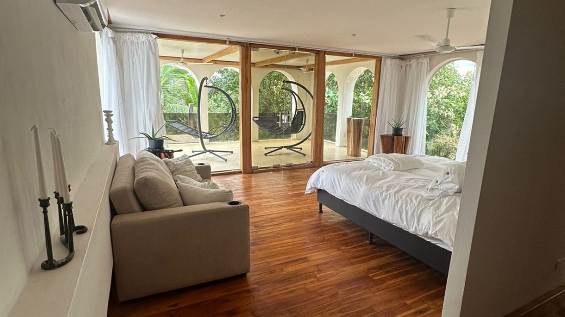 La chambre principale offre un balcon privé avec une vue imprenable sur l’océan, créant un cadre de vie idyllique.