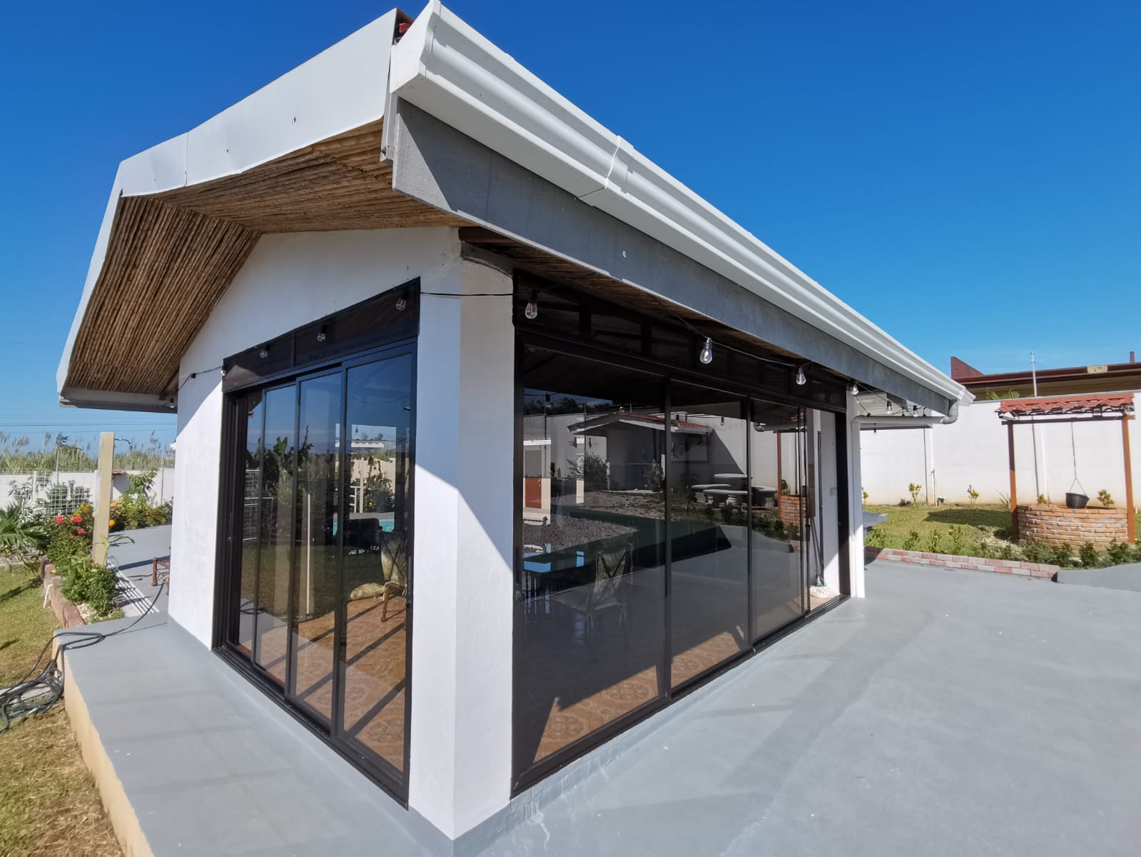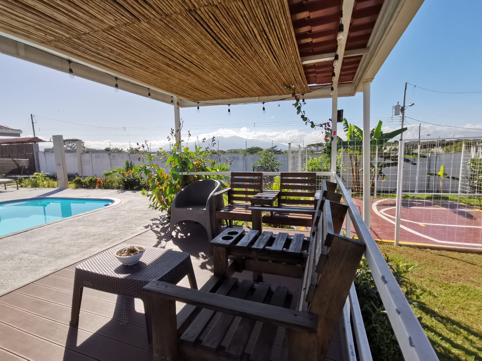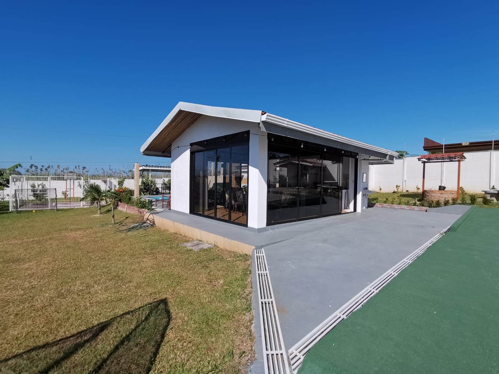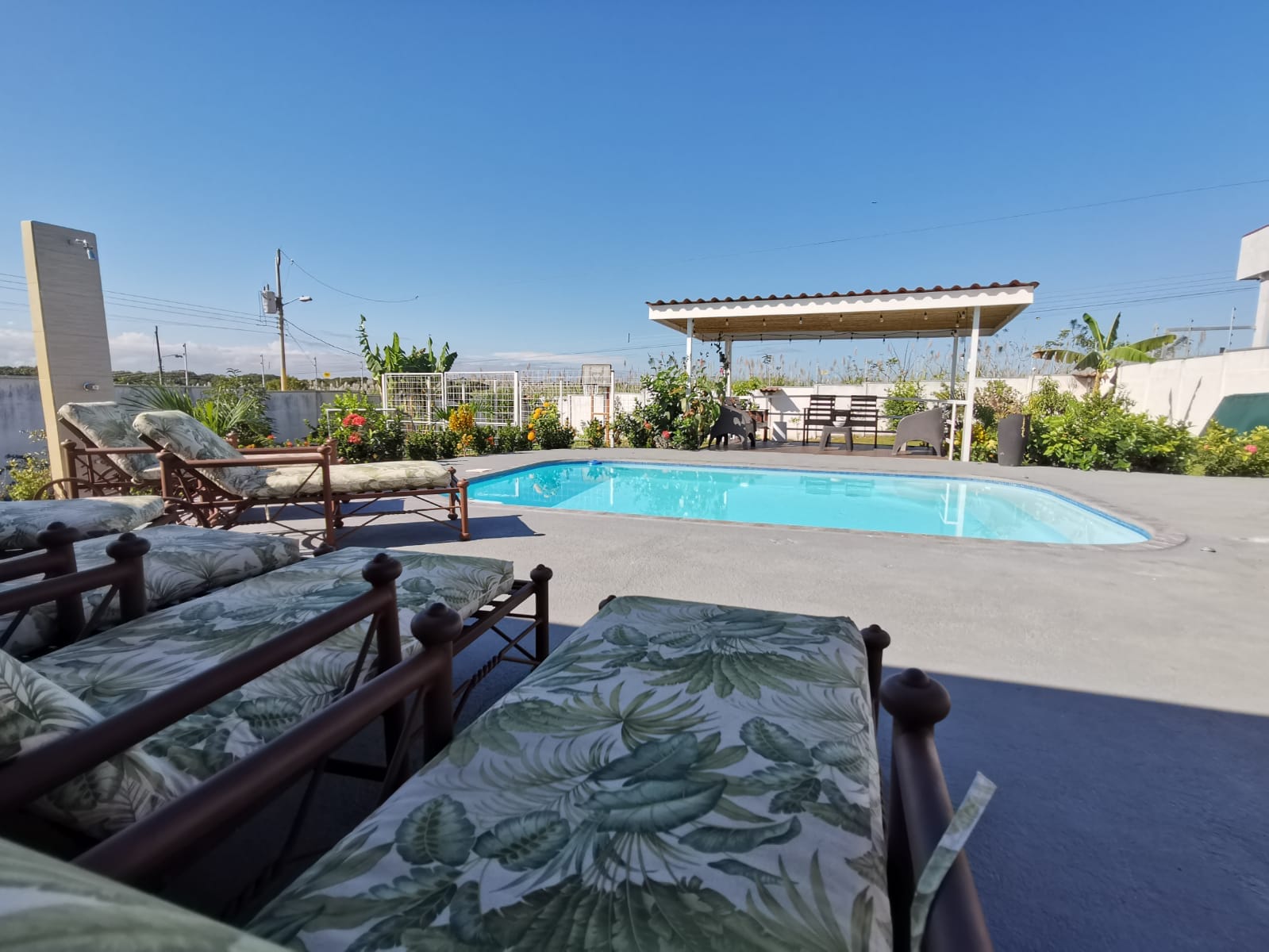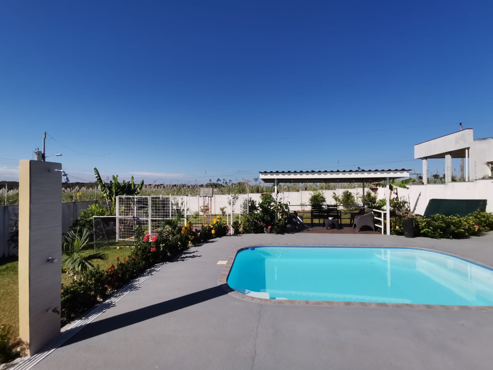 Includes all household items, refrigerators, chairs, furniture, beds, appliances, turnkey sale The farm is located on a corner lot with 2 fronts on a public street, giving it a high added value, and 3 meters above the road, which it makes it more positioned. It has its own sidewalks and gutters, as well as excellent drainage towards the gutter, which makes it a healthy and efficient land for rainwater drainage. All the land has the appropriate unevenness and underground drainage pipe. In addition, the electrical part is underground, and it has 3 load centers, one for the house, ranch and machine room (swimming pool, deck lights, basketball court and common areas. The property has walls around the entire property, duly repaired and reinforced with columns and underground. For the security system it has an alarm, electrified mesh, wireless CCTV camera system 1024 HD. Parking is for 8 cars, although green areas could be enabled and park more than 15 cars. Account with an entrance 5 meters high by 5 meters wide and a gate with pochote wood, properly cured, and special stain for exteriors, with 4 columns in the front, with Spanish fachaleta of first colonial color.In addition, at the main entrance It has white stone to allow cars to park and making it very pleasant and beautiful. Additionally, it has a decorative water well and a roof with decorative tiles. a. At the same time, it has a 6-seater bench, duly decorated with a special 3-meter outdoor cloth umbrella, with decorative luxury blocks. The ranch has an area of 55 square meters, with decorative tiles, and the ceiling with cane brava to give a tropical and refreshing look to the entire ranch and the pool deck. The ranch has two shower bath batteries, and a changing bathroom, as well as a kitchen cabinet, refrigerator, and conditioning with a Greek-style table, made of aluminum and 4-inch tempered glass. It has a large cellar, and a machine room and equipped with the pump system, Howard 1HP filter, the entire piping system for the pool and well-designed lighting. It has a pool 6 meters long by 4 meters wide and 1.60 meters deep. It has hydromassage, and a system of benches and stands inside the pool. The lighting system has 8-color LED lights. The pool has a special overflow system. Around the pool, it has a sewage system, special trellis. In the pool area there are 2 special showers and conditioned for showering, veneered. In addition, the gardening is tropical and special for pool areas with colorful flowers, giving freshness to the environment and a beautiful ecosystem. The deck has a special plastic floor for exteriors, and a 14m2 ares, equipped, lights and completely closed with iron, and a cane brava ceiling to give it a tropical, fresh and beautiful appearance. It has a basketball court, properly closed with a special cage-type iron so that the balls remain within the court. It has football frames that make it special for a football field next to the ranch. The green areas have 30 fruit trees, including citrus, star apple, avocado, gas, banana, plantain, nance, carambola. It has a 3-bedroom house, the main one with a double bed, and the other 2 rooms have cabin with double and single bed. The house has a laundry room area, a washing machine, and a shopkeeper. An open-plan and private bathroom, as well as an equipped kitchen and a living room with a dining set and armchairs and a fan. In addition, the main room has an air conditioner, the others with a fan.