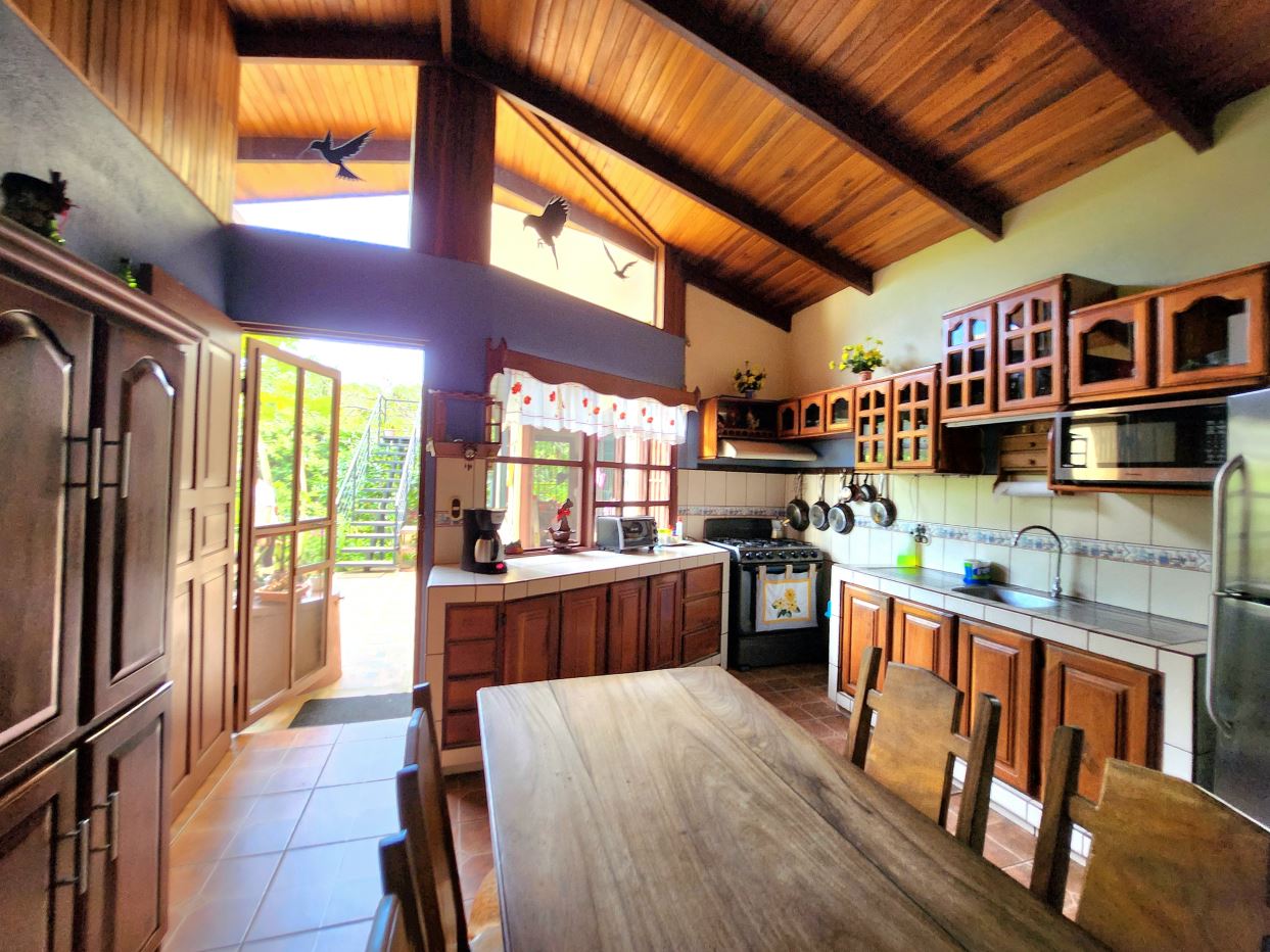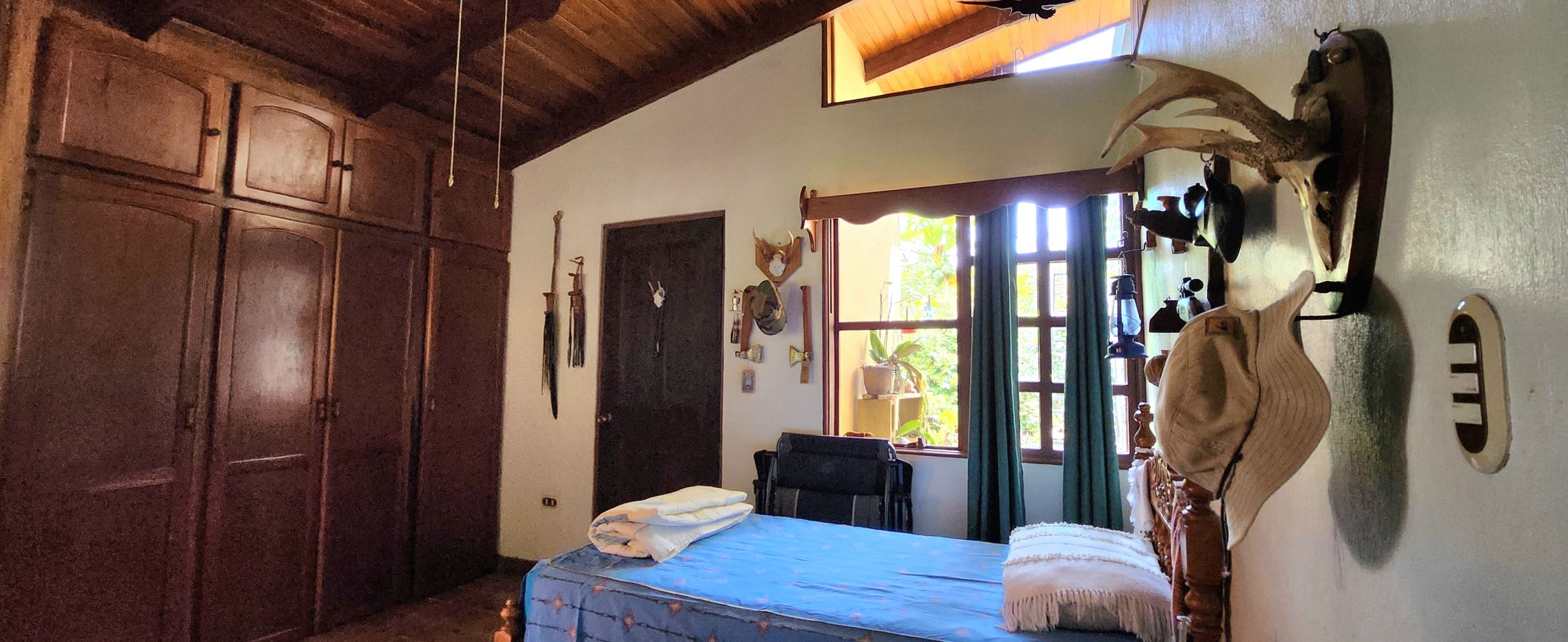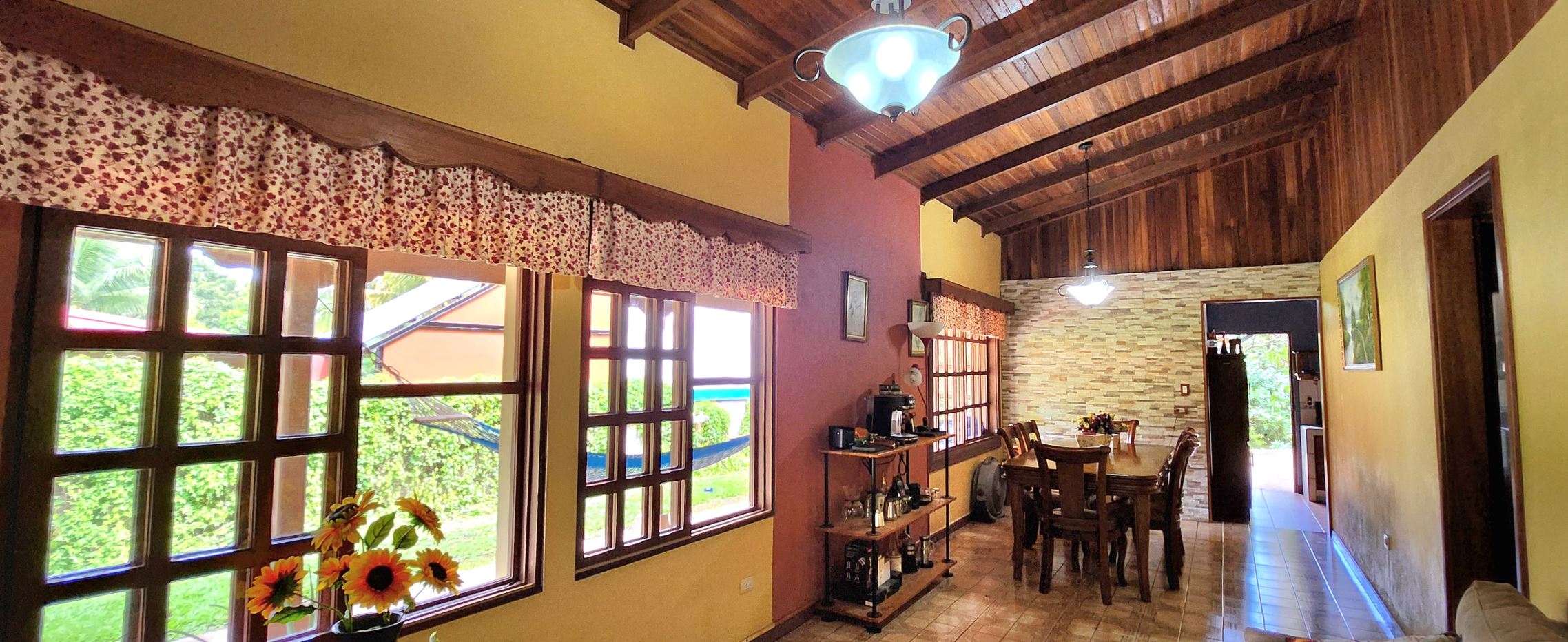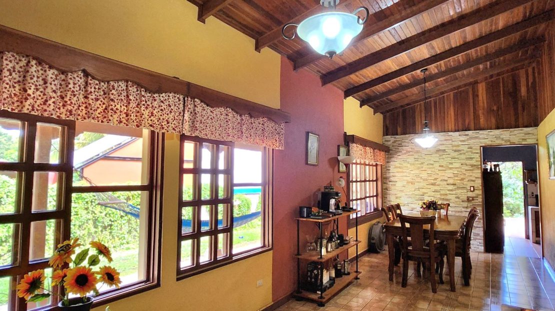 Esta propiedad es unica en su estilo ademas de que todo su terreno es plano y aprovechable aun tiene mucho espacio para construir, ampliar o conservar la naturaleza, colinda con un rio y un bosque natural donde puedes observar infinidad de aves, oso peresozo y alguna epoca del ano hasta monos cariblanco, la casa principal esta construida en block con techos artesanados, detalles y muebles hechos de maderas duras de laurel y almendro.