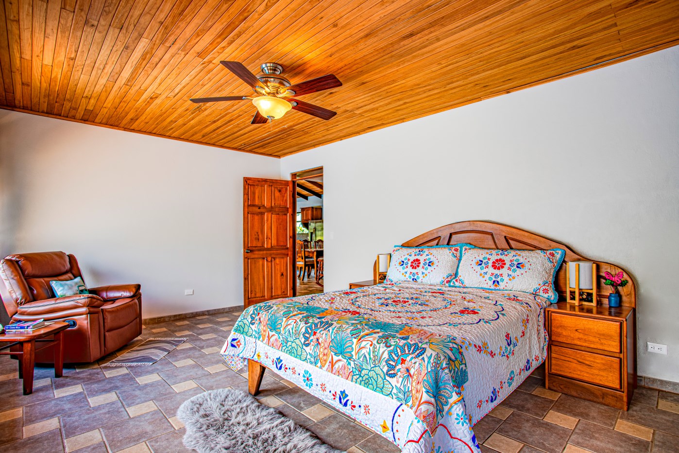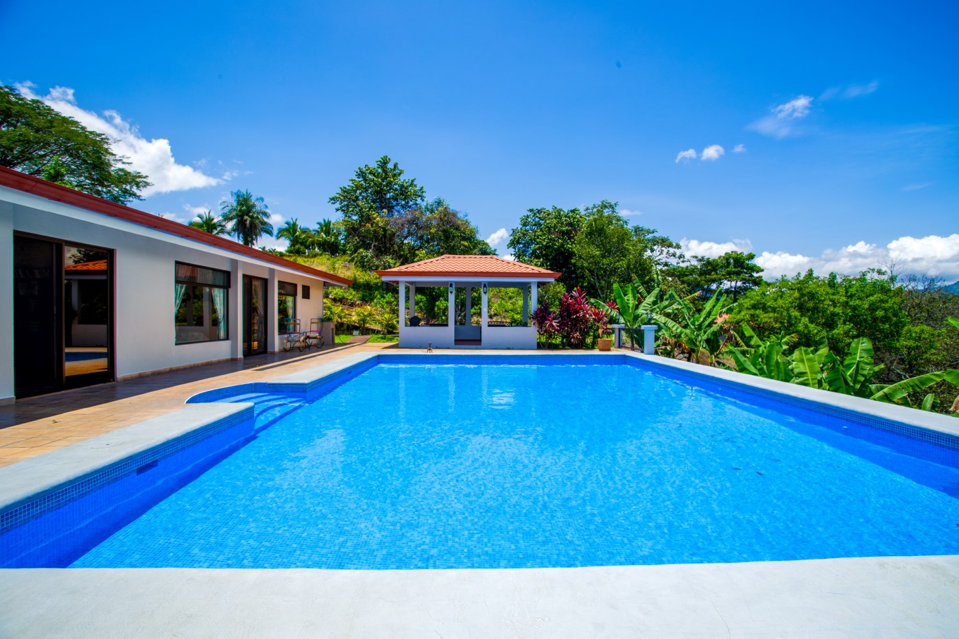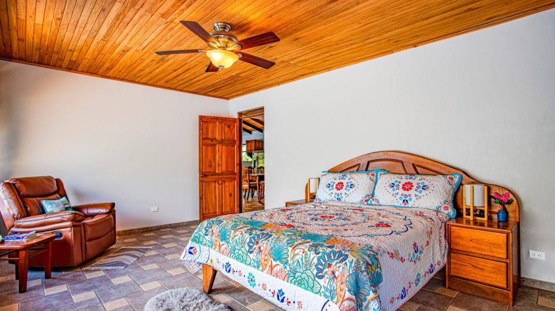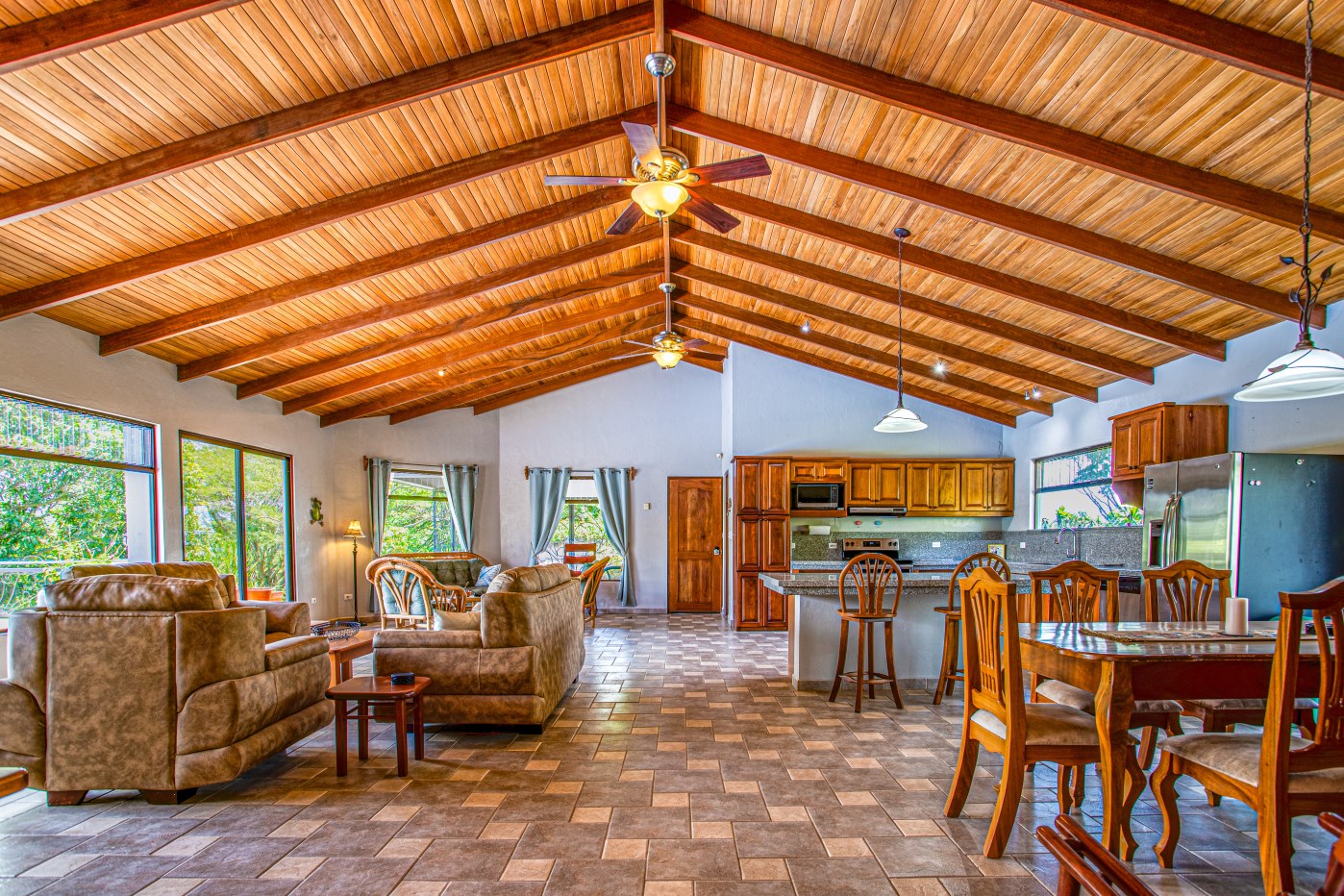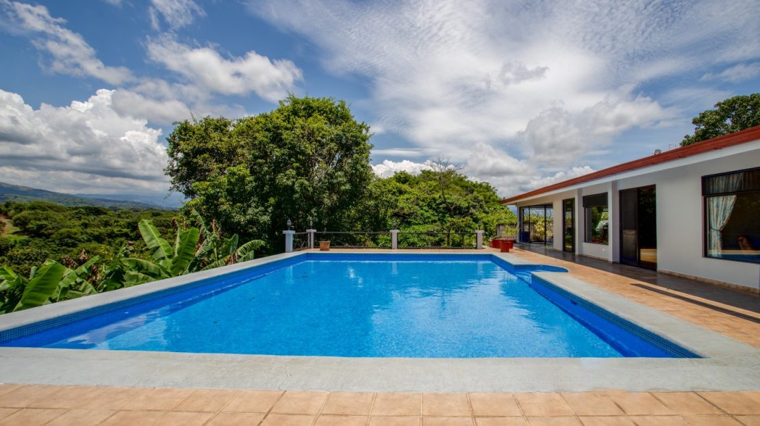 This home is perfect for those seeking a property with a home and a guest home in total privacy and the natural setting of Atenas’ wilderness. The home sits on a spacious lot 2.5 acre lot with beautiful views of the canyon and includes an adjacent 2.5 acre separate lot. There are great views towards Grecia and area mountains and is located in a private gated community just a couples minutes drive from Atenas center. It features a main home with spacious rooms, a main suite with walk-in safe-room, an open floor plan living room with tall ceilings that lead to the porch and nicely manicured garden area and inviting pool and deck perfect for entertaining and enjoying the outside living that Atenas has to offer. The property also includes a nicely designed one bedroom/one bath private guest home and additional usable space adjacent to the forest for further building as well as plenty of added space on the added lot for added projects. The home is sold with all appliances and furniture included.