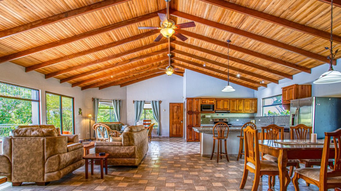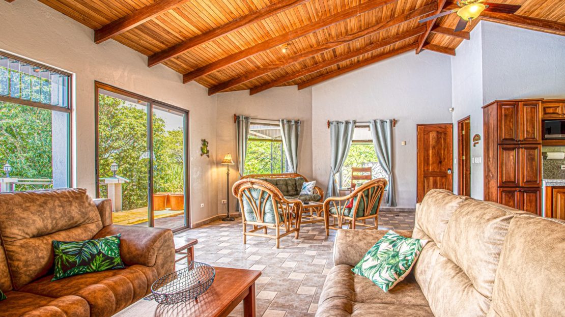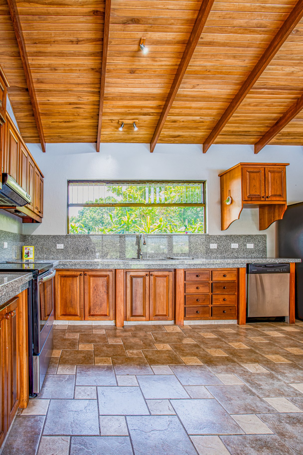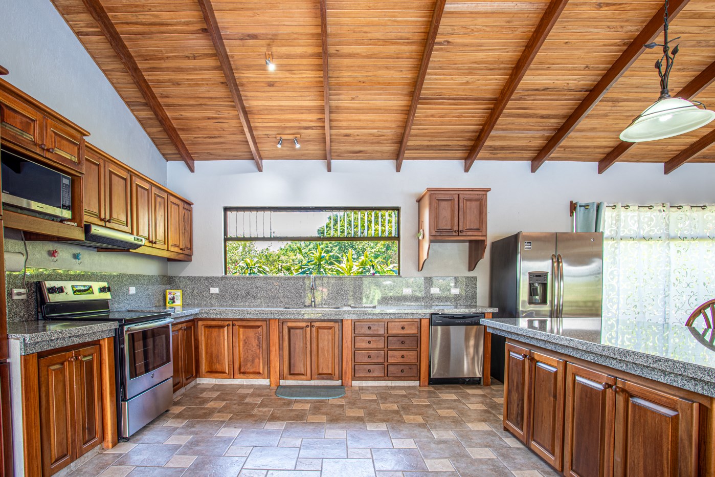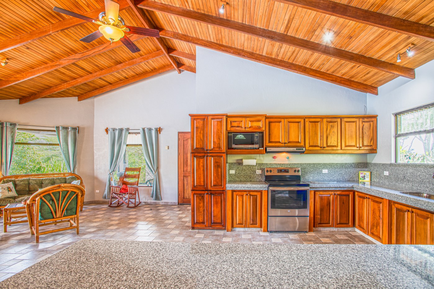 This home is perfect for those seeking a property with a home and a guest home in total privacy and the natural setting of Atenas’ wilderness. The home sits on a spacious lot 2.5 acre lot with beautiful views of the canyon and includes an adjacent 2.5 acre separate lot. There are great views towards Grecia and area mountains and is located in a private gated community just a couples minutes drive from Atenas center. It features a main home with spacious rooms, a main suite with walk-in safe-room, an open floor plan living room with tall ceilings that lead to the porch and nicely manicured garden area and inviting pool and deck perfect for entertaining and enjoying the outside living that Atenas has to offer. The property also includes a nicely designed one bedroom/one bath private guest home and additional usable space adjacent to the forest for further building as well as plenty of added space on the added lot for added projects. The home is sold with all appliances and furniture included.