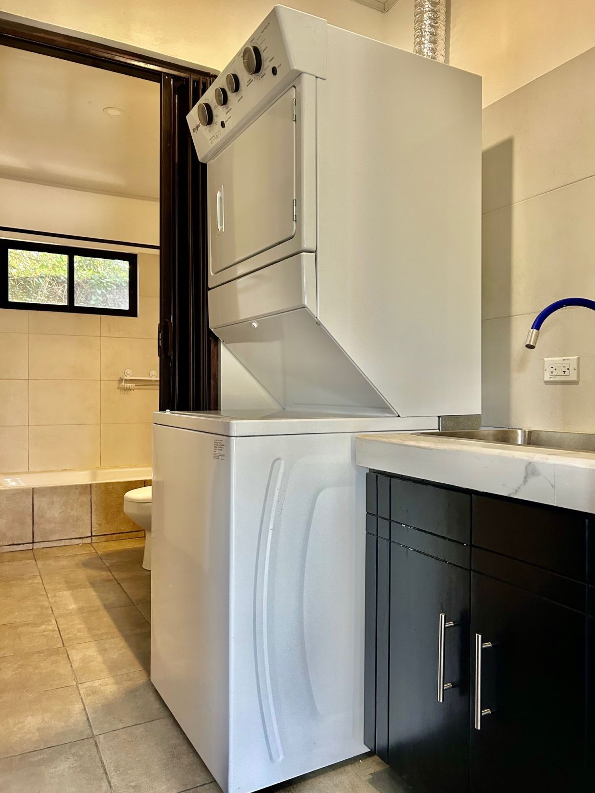 Laundry Room: Conveniently located and designed for practicality, the laundry room ensures that the home remains functional for both guests and residents. A quality stacking system washer/dryer, as well as sink for hand washables allows for seamless laundry tasks.