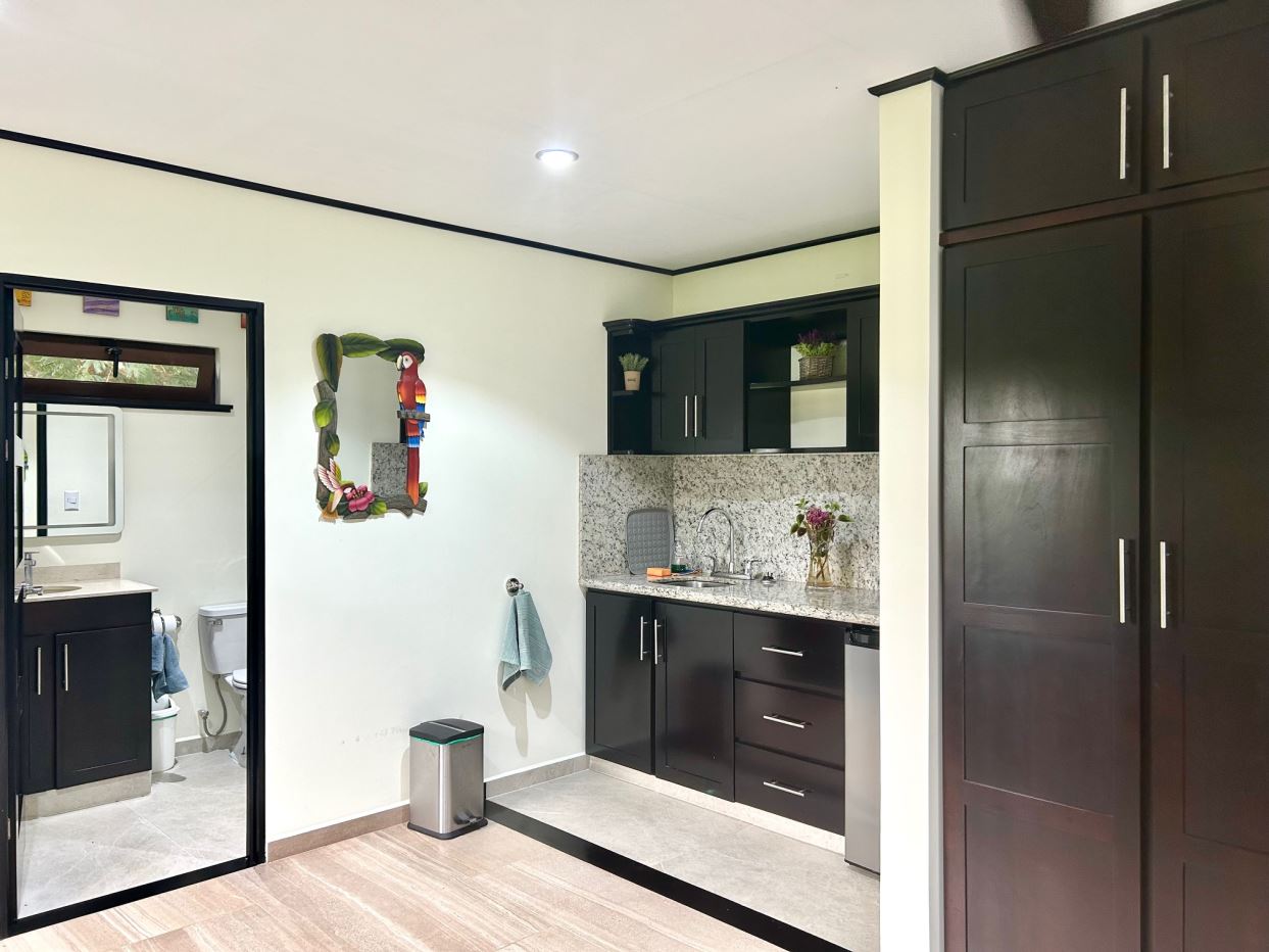 Enjoy stunning views of Lake Arenal and the iconic Arenal Volcano from select vantage points throughout the property. The main villa spans 1,078 SF and offers two generously sized principal rooms, complemented by a beautifully appointed full bathroom. The villa’s open concept design includes a spacious kitchen with a central island and breakfast bar, a large dining room, and a comfortable living room. A charming conservatory with patio doors and windows, overlooking the garden, provides a serene spot to unwind in the evening. To enhance comfort year-round, the bedrooms have been equipped with air conditioning units, while ceiling fans provide additional airflow throughout. Tastefully furnished, the villa showcases exquisite Spanish tile flooring that adds warmth and character, creating an inviting and elegant living space.