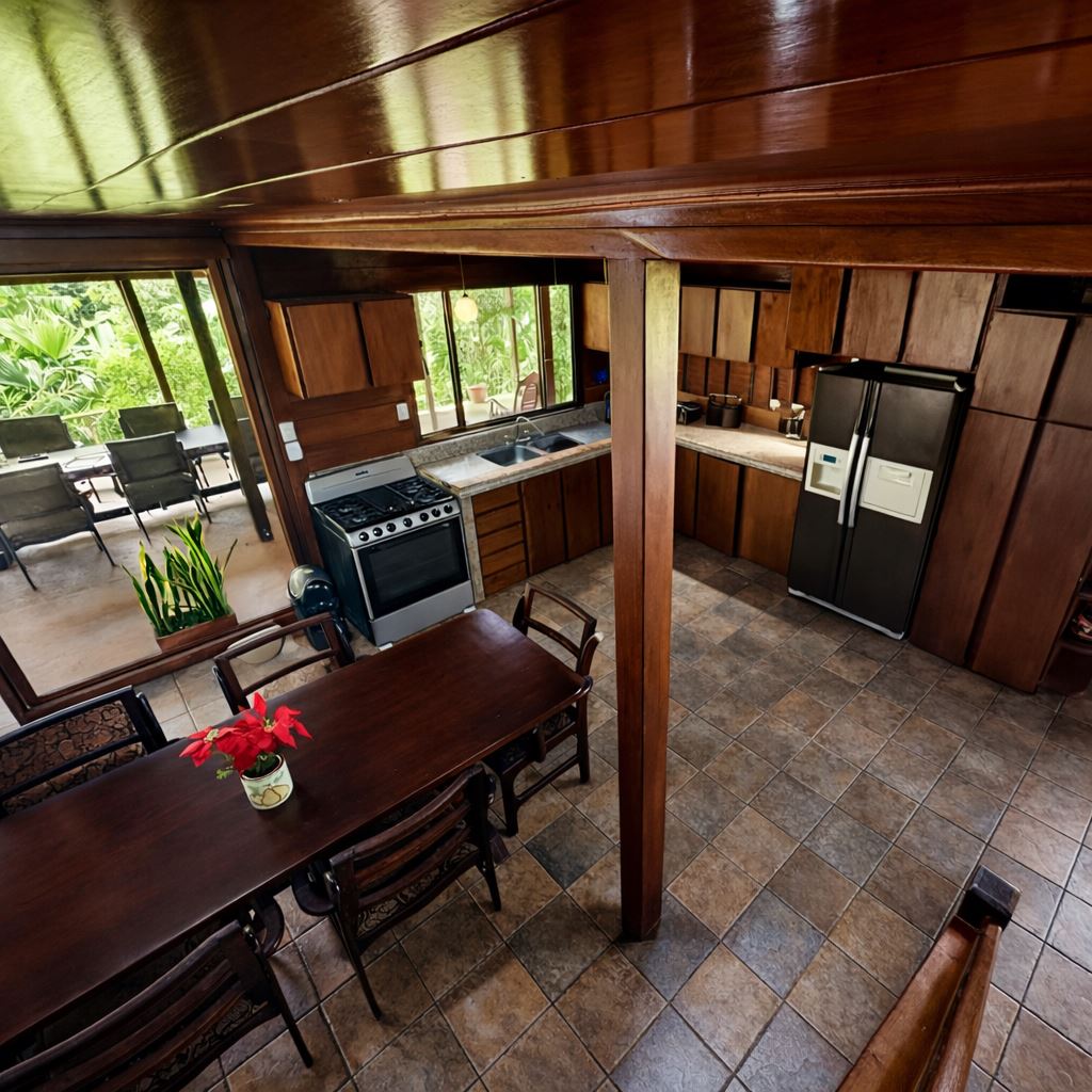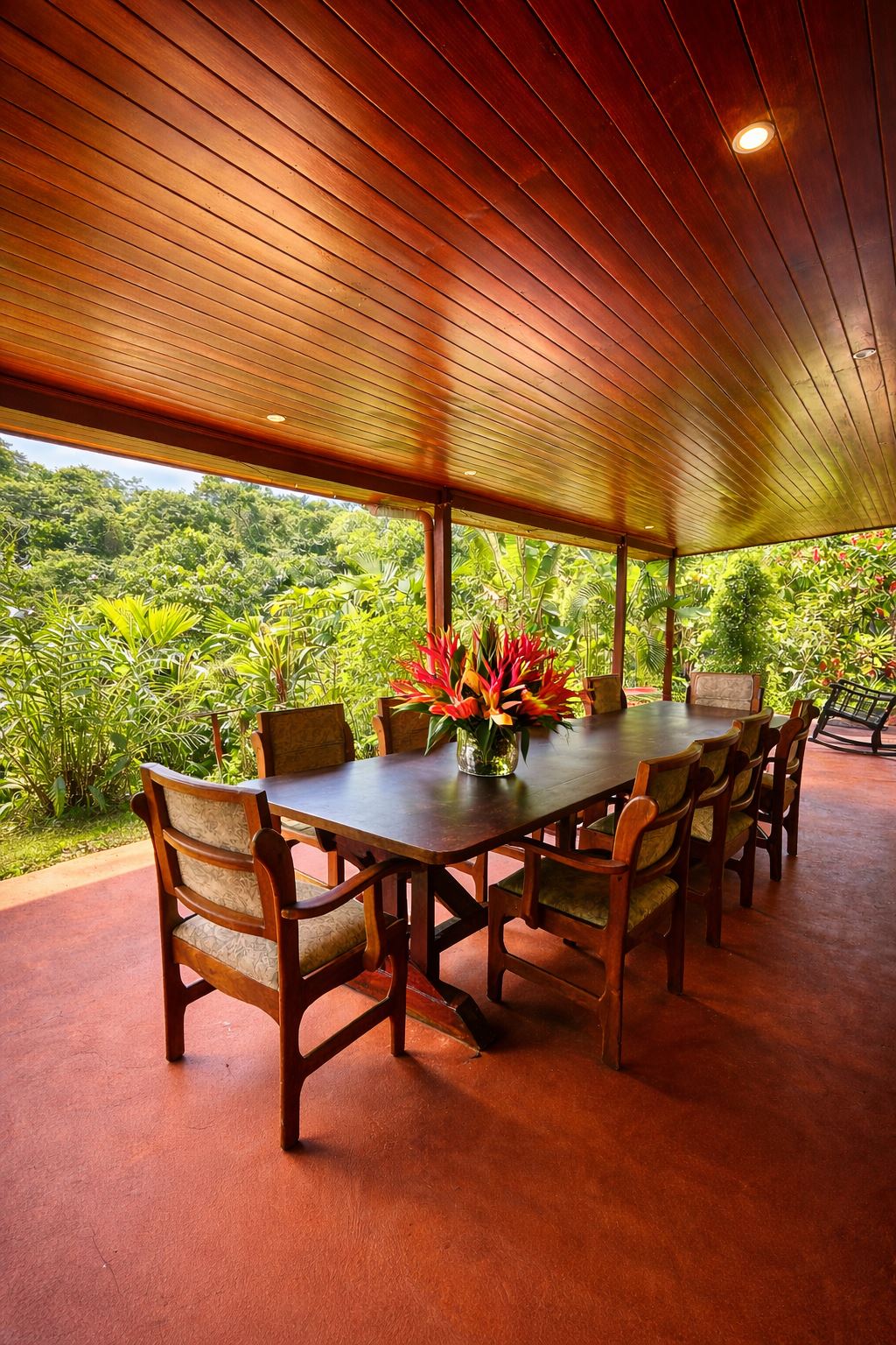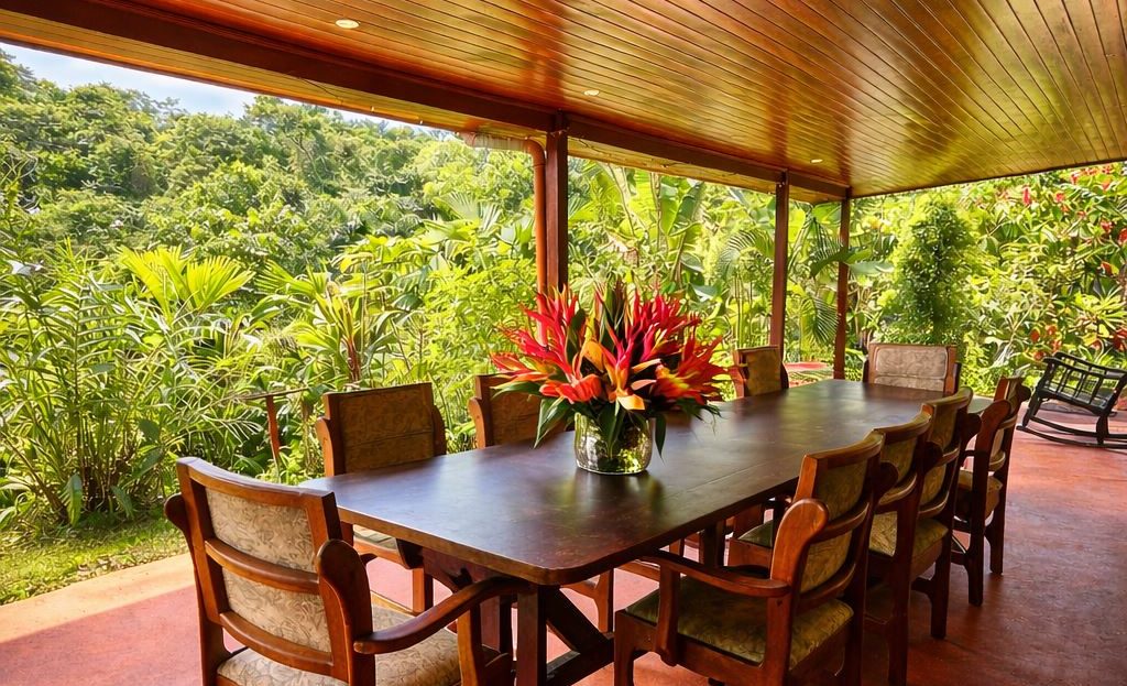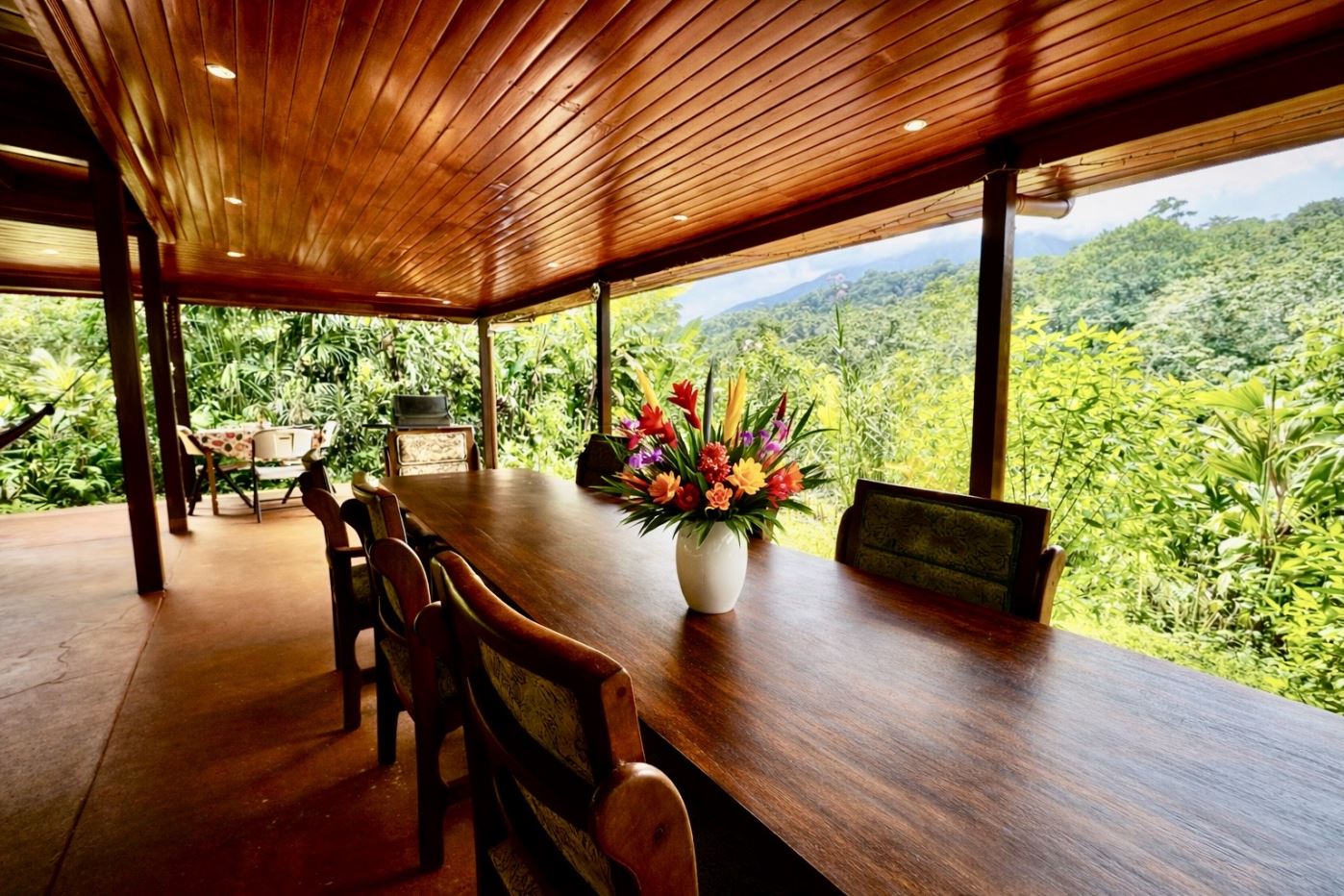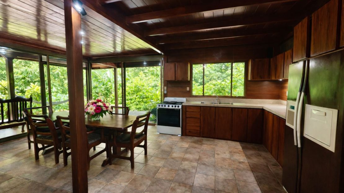 A warm, inviting kitchen is available for hotel guests, authentically Costa Rican in character, featuring indoor dining space for groups and families. Additionally, the property showcases a stunning wraparound balcony and expansive outdoor terrace where guests can gather and dine while overlooking the tropical gardens and extraordinary volcano views.