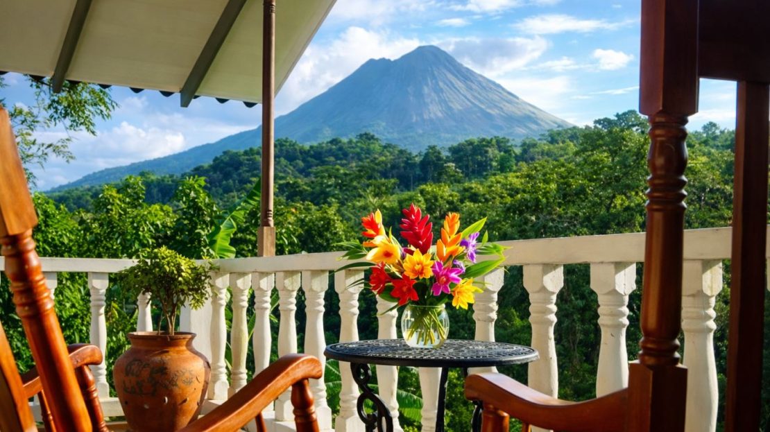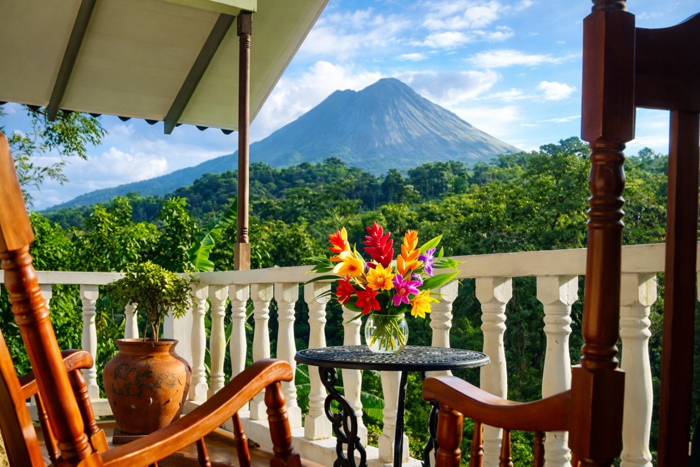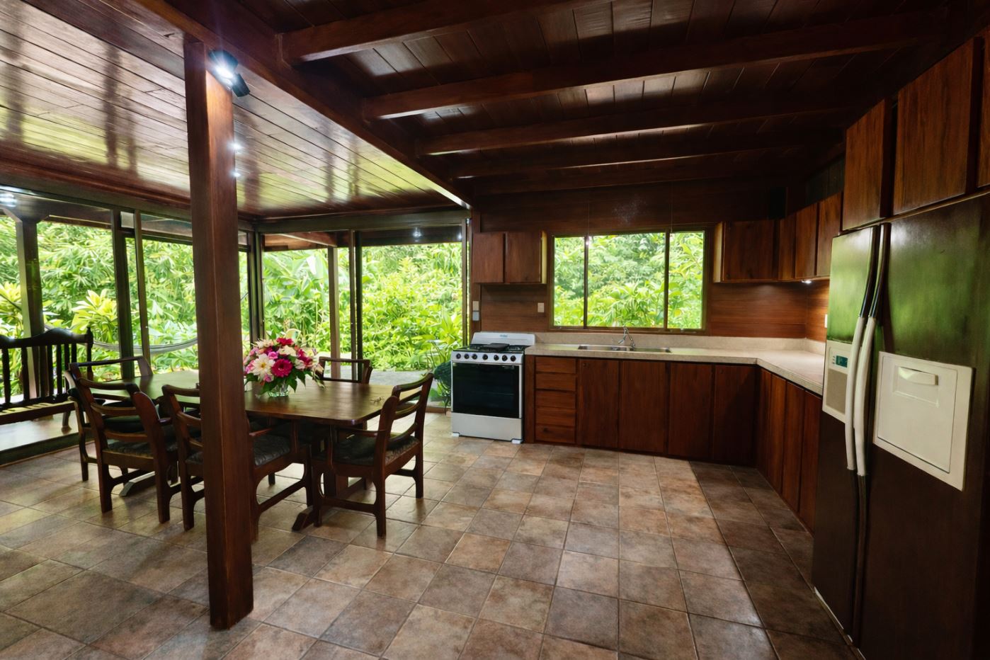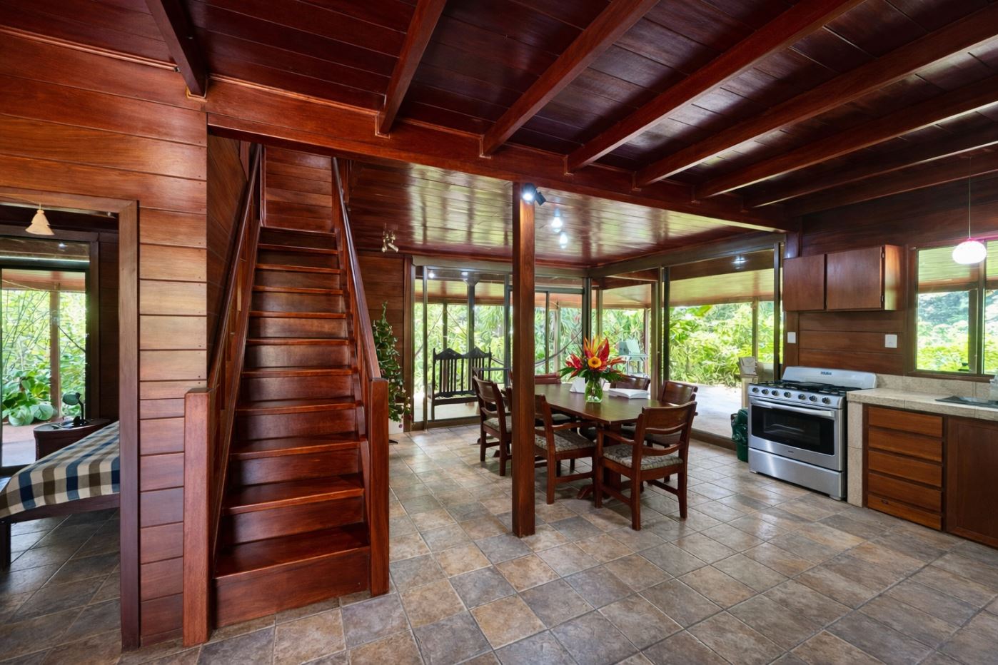 A warm, inviting kitchen is available for hotel guests, authentically Costa Rican in character, featuring indoor dining space for groups and families. Additionally, the property showcases a stunning wraparound balcony and expansive outdoor terrace where guests can gather and dine while overlooking the tropical gardens and extraordinary volcano views.