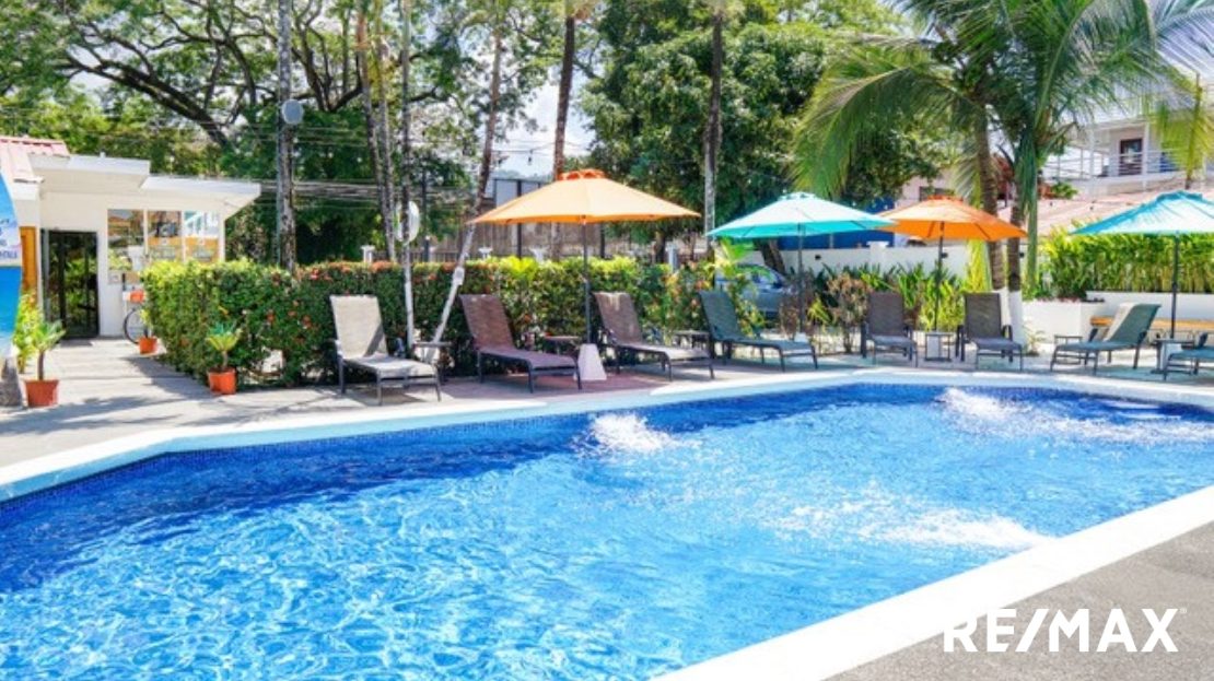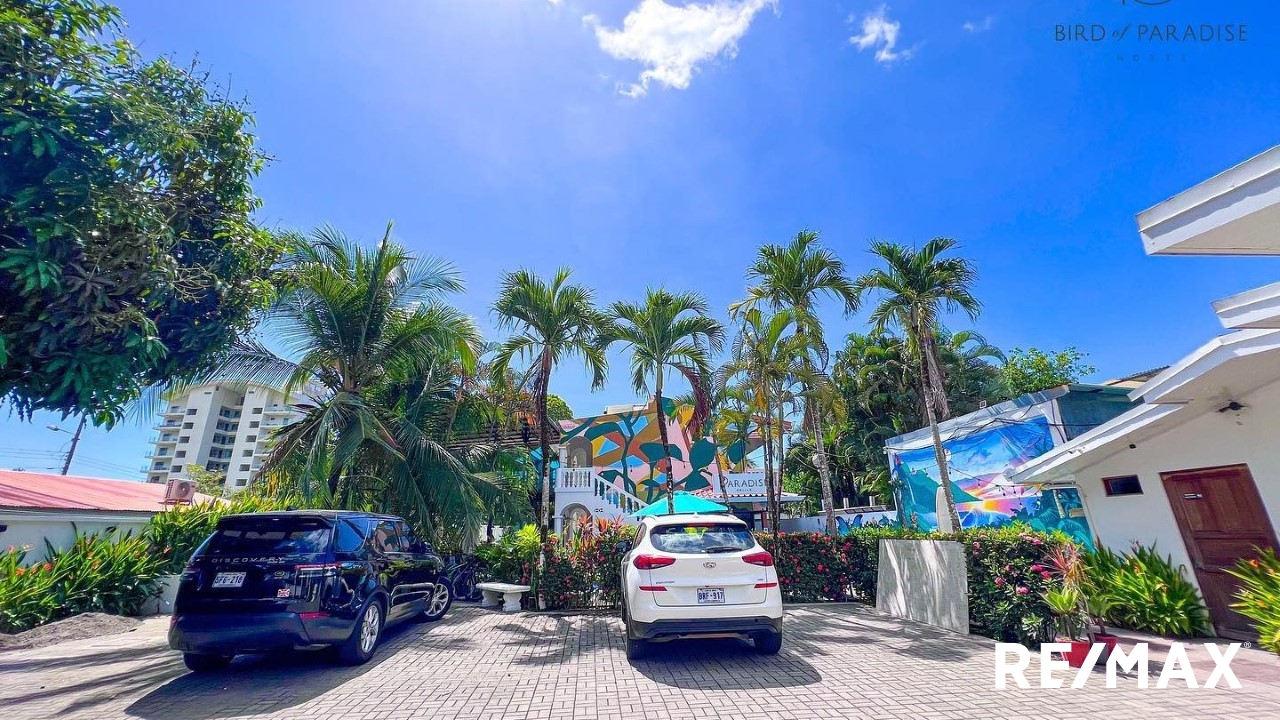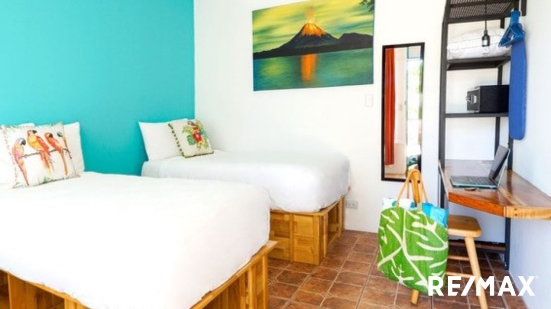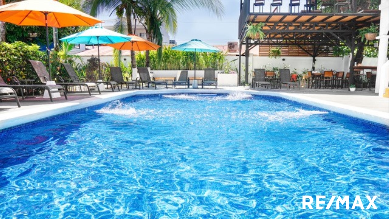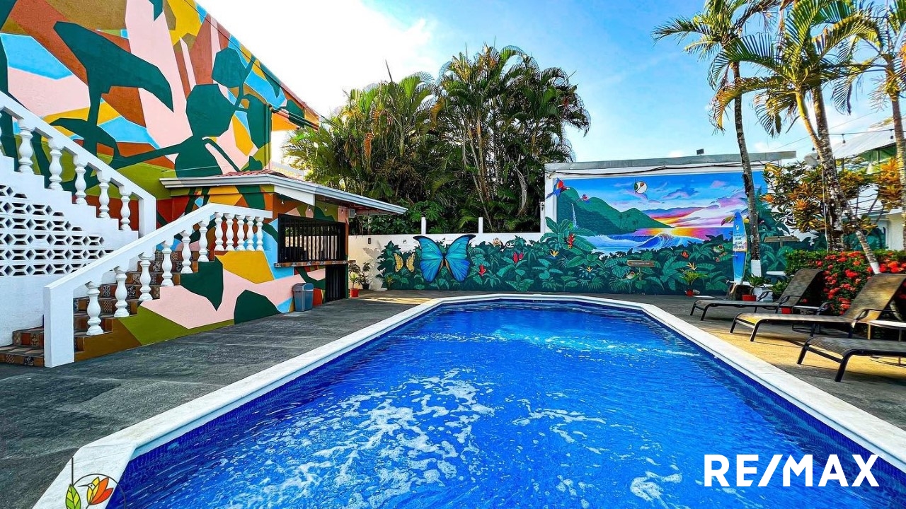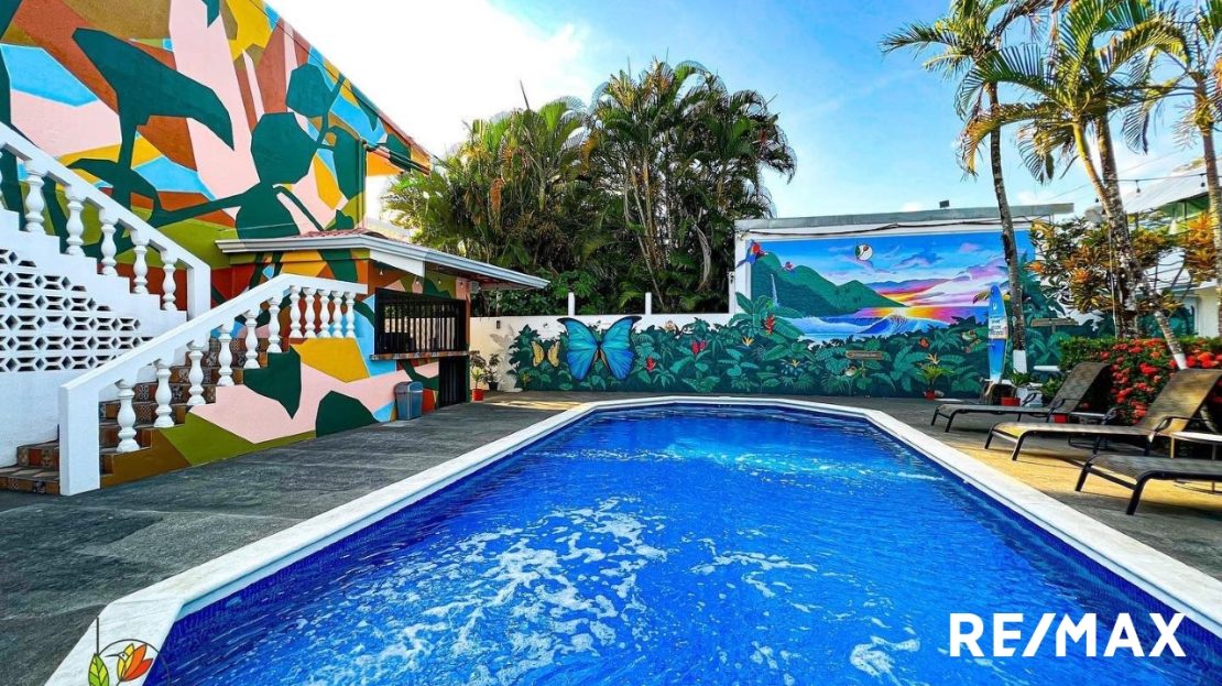 This well known hotel is located in heat of Jaco Beach on the main strip. It hosts 18 rooms among 2 levels along with a reception area that fronts the main street Pastor Diaz. In addition, there is an owners studio apartment. This hotel has been meticulously cared for and newly renovated inside and out and features a mural by an international artist sponsored through Artify Jaco art foundation. Also included are high quality American-style beds and lots of extra touches that make sleeping away from home easier like clocks with built-in phone chargers, Bluetooth speakers and white noise machines. The property includes a common pool, solar hot water system, cafe/bar, 2-story roofed rancho and sail awnings over the courtyard.