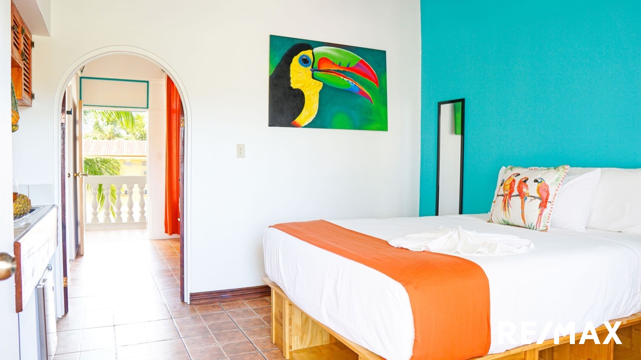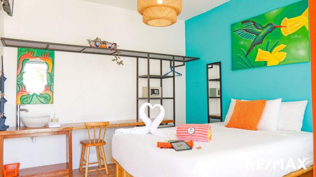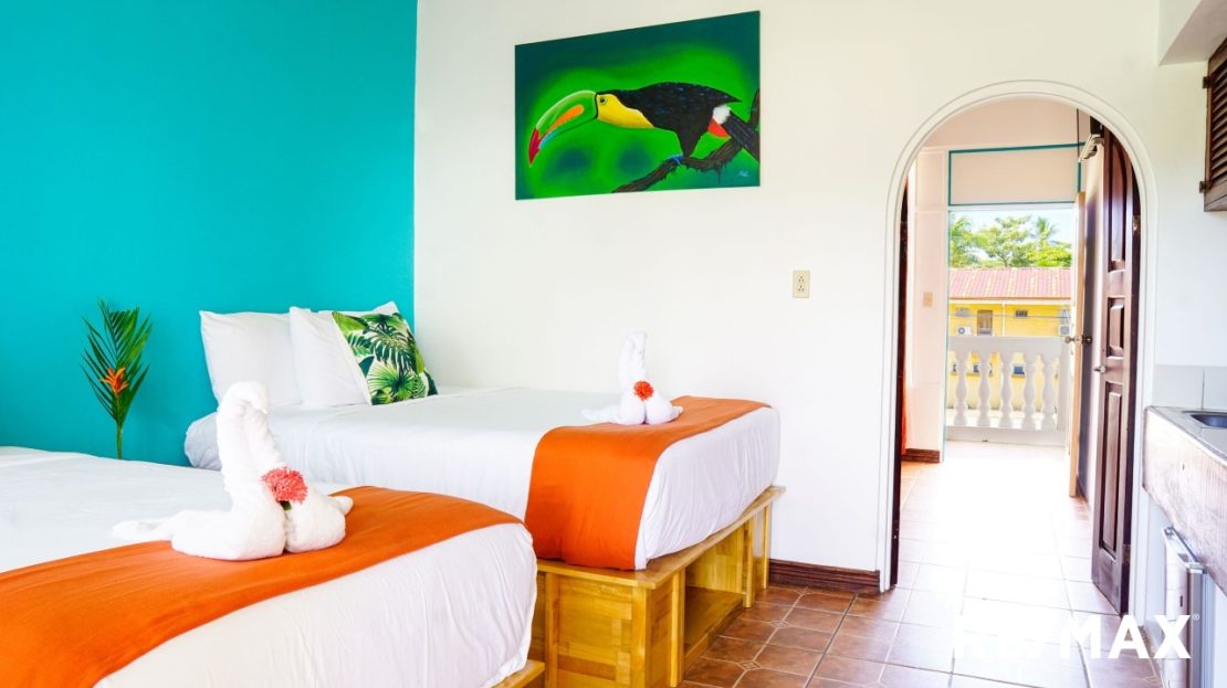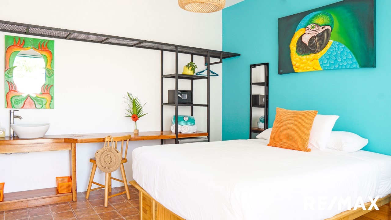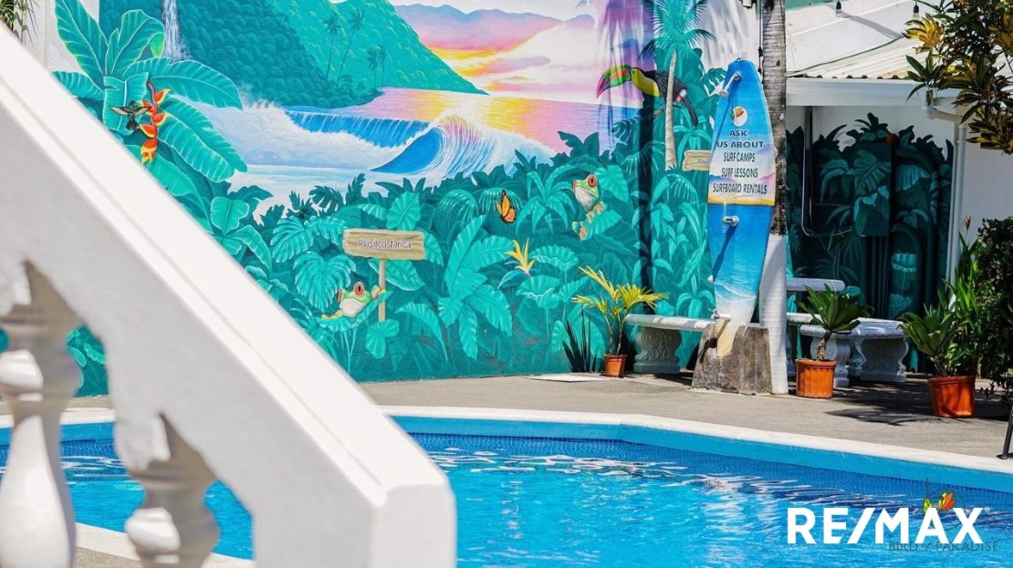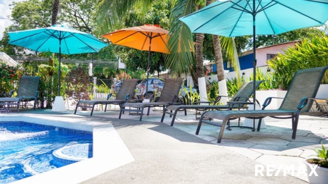 This well known hotel is located in heat of Jaco Beach on the main strip. It hosts 18 rooms among 2 levels along with a reception area that fronts the main street Pastor Diaz. In addition, there is an owners studio apartment. This hotel has been meticulously cared for and newly renovated inside and out and features a mural by an international artist sponsored through Artify Jaco art foundation. Also included are high quality American-style beds and lots of extra touches that make sleeping away from home easier like clocks with built-in phone chargers, Bluetooth speakers and white noise machines. The property includes a common pool, solar hot water system, cafe/bar, 2-story roofed rancho and sail awnings over the courtyard.