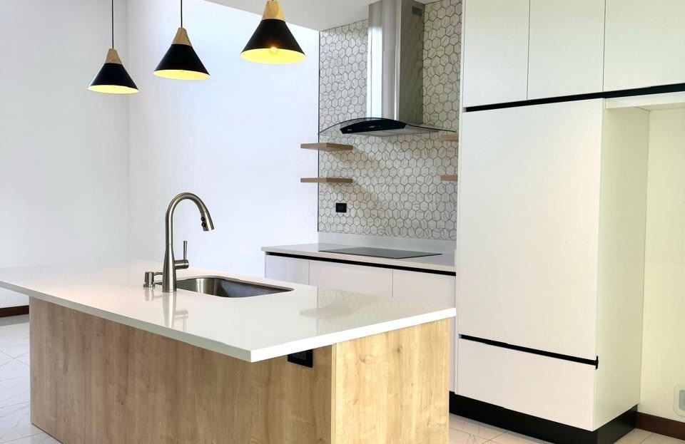 Moderna cocina con sobres de cuarzo e isla central