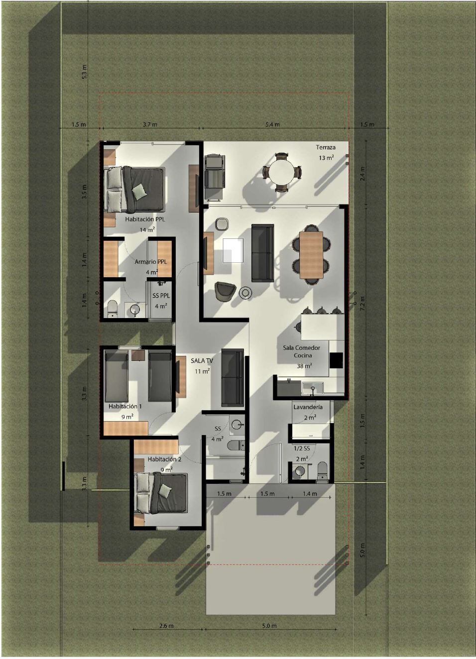 Sobre este lote de 313 metros cuadrados hemos pensado en diseñar una casa de UN NIVEL con area total de construcción de 148 metros cuadrados con una distribución estratégica para que puedas aprovechar cada espacio y en la cual podrás encontrar: