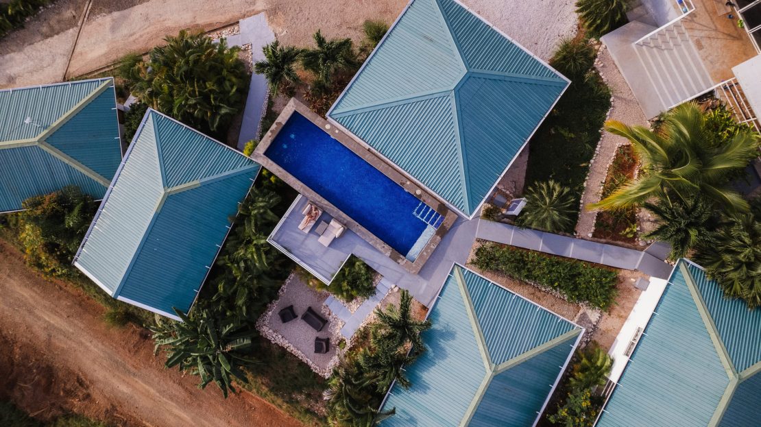 The lodge is complemented by a large swimming pool with a covered terrace and sun loungers. Guests can also enjoy a rooftop terrace above the containers, complete with dining and lounge areas—ideal for enjoying meals, gatherings, or yoga sessions with panoramic ocean views.