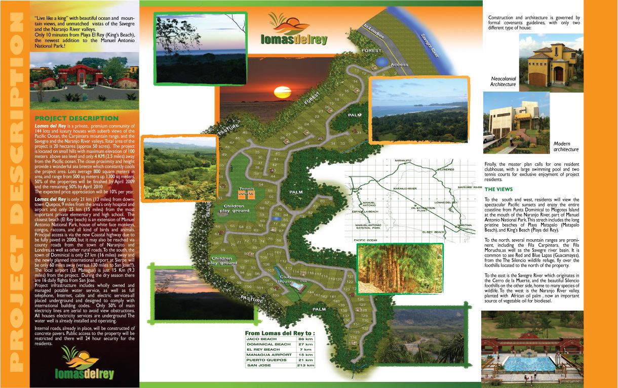 Lomas del Rey is a private, premium community of 144 lots and luxury lots with superb views of the Pacific Ocean, the Carpintera mountain range, and the Savegre and the Naranjo River valleys. Total area of the project is 20 hectares (approx 50 acres).