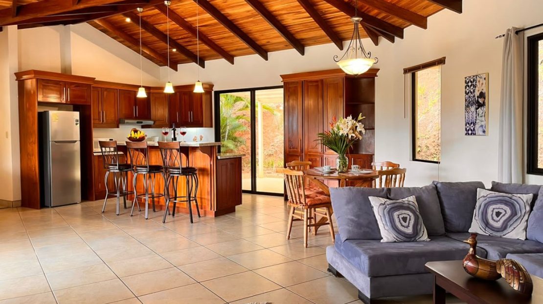 Lovely home in gated Roca Verde located securely near the guard gate features great views of the area mountains and surrounded by lush landscaping. The home features lots of artisanal woodwork throughout including the indoor and outdoor ceilings. The large inviting deck leads to a hot tub with added side yard ideal for a future pool. The deck leads to an open floor plan with living and dining room and ample modern kitchen. There are two suites on either end with bathroom and a backyard covered porch. There is also an attached closed garage. Your new home waiting for you in Atenas!