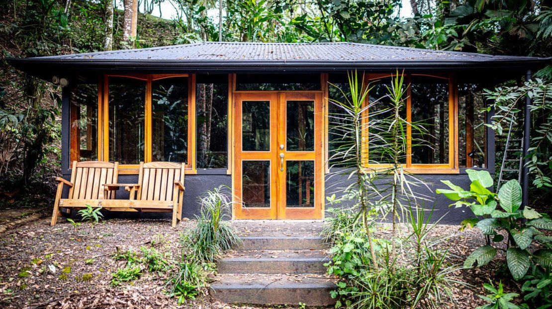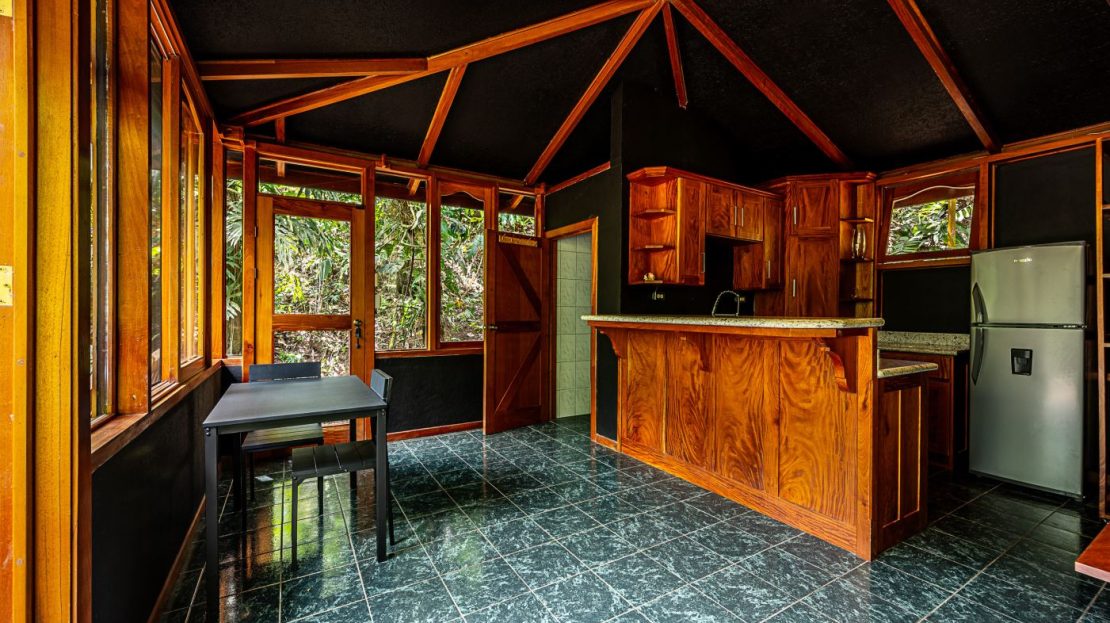 Casita (Tiny House): Bathed in natural light, this retreat has windows framing vibrant jungle scenery. Complete with a bedroom, full bathroom, living room, and kitchen, it offers a modern yet tranquil escape in a tropical setting.