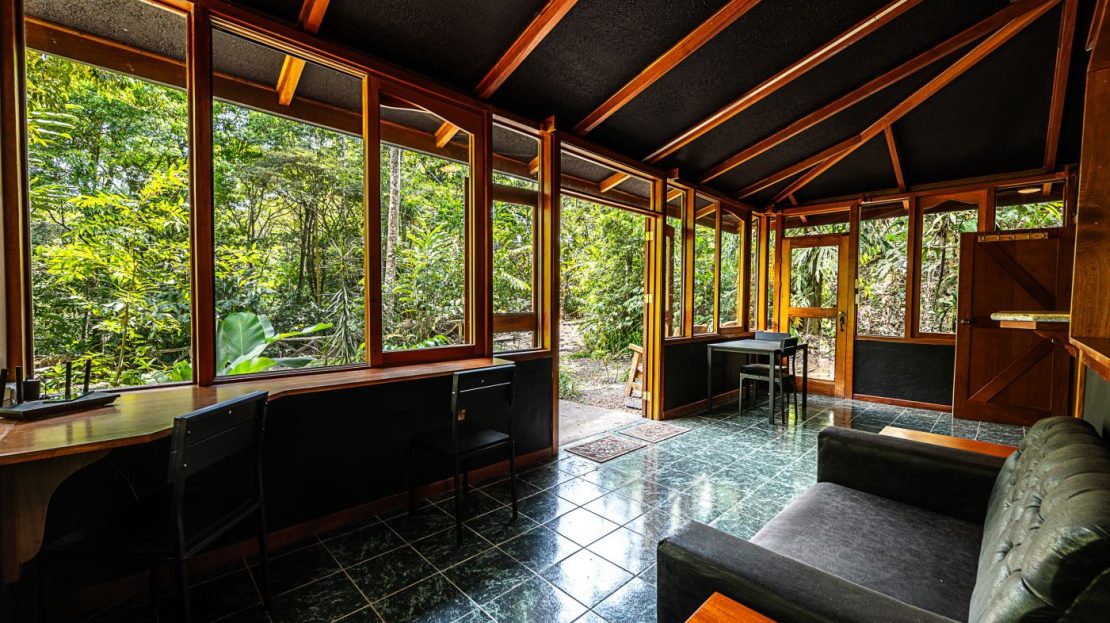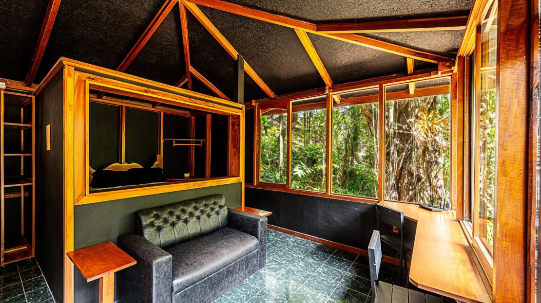 Cabina (Studio): Cozy and inviting, this studio-style haven boasts two expansive windows overlooking the lush greenery. With a private bathroom and kitchenette, it provides guests with an intimate and serene jungle experience.