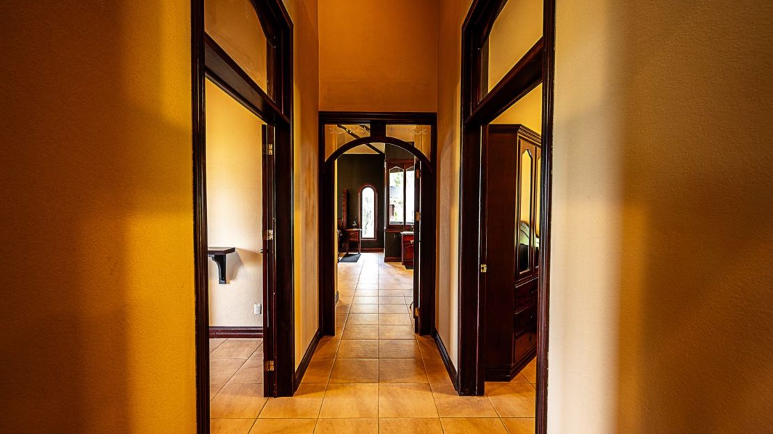 Two exterior doors—one opening to the lake view, the other to the zen garden and koi pond