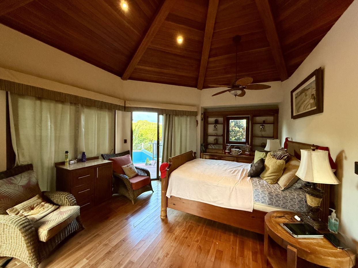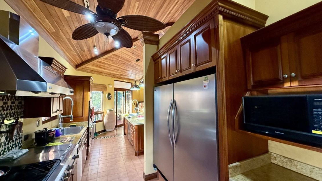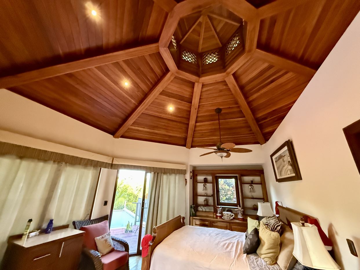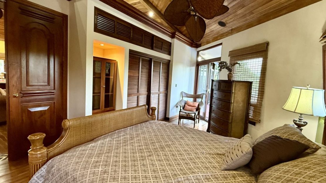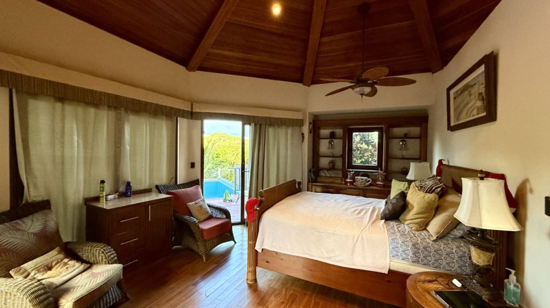 Outdoors, the property truly shines. A lovely swimming pool offers the perfect place to cool off, relax, or enjoy the year-round mild climate for which Lake Arenal is known. The landscaped gardens are filled with mature trees, tropical plants, and natural shade, creating a sanctuary ideal for birdwatching, gardening, or simply unwinding in nature. A covered garage adds convenience and practicality to the estate.