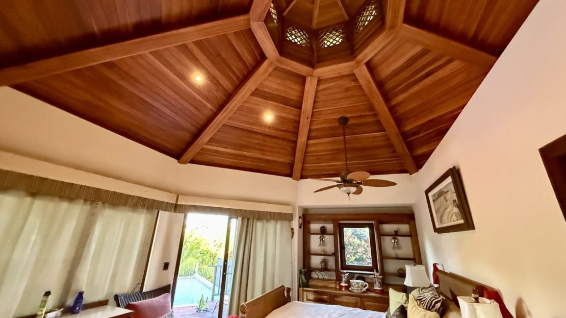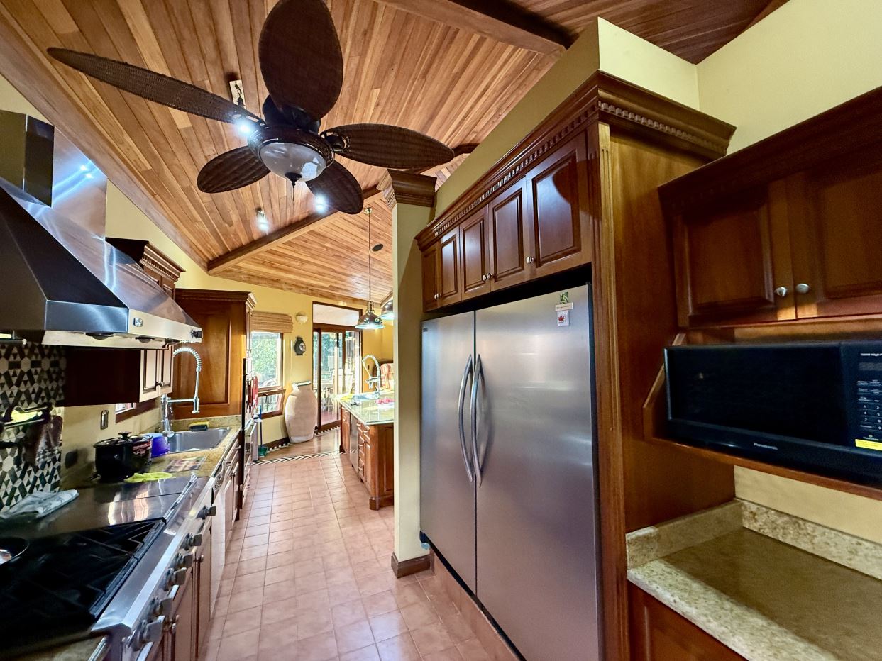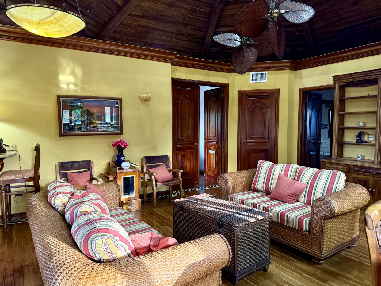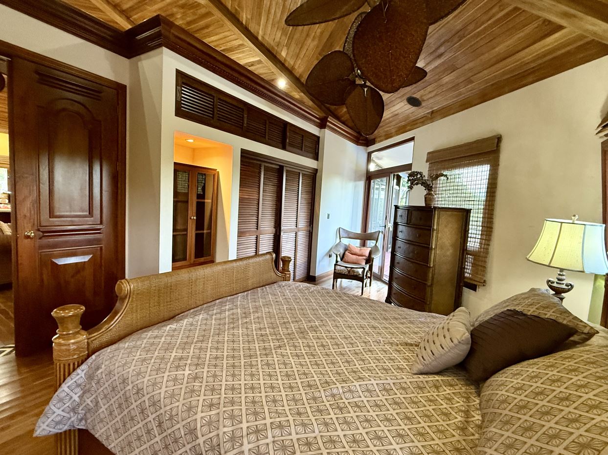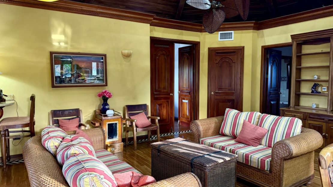 Outdoors, the property truly shines. A lovely swimming pool offers the perfect place to cool off, relax, or enjoy the year-round mild climate for which Lake Arenal is known. The landscaped gardens are filled with mature trees, tropical plants, and natural shade, creating a sanctuary ideal for birdwatching, gardening, or simply unwinding in nature. A covered garage adds convenience and practicality to the estate.